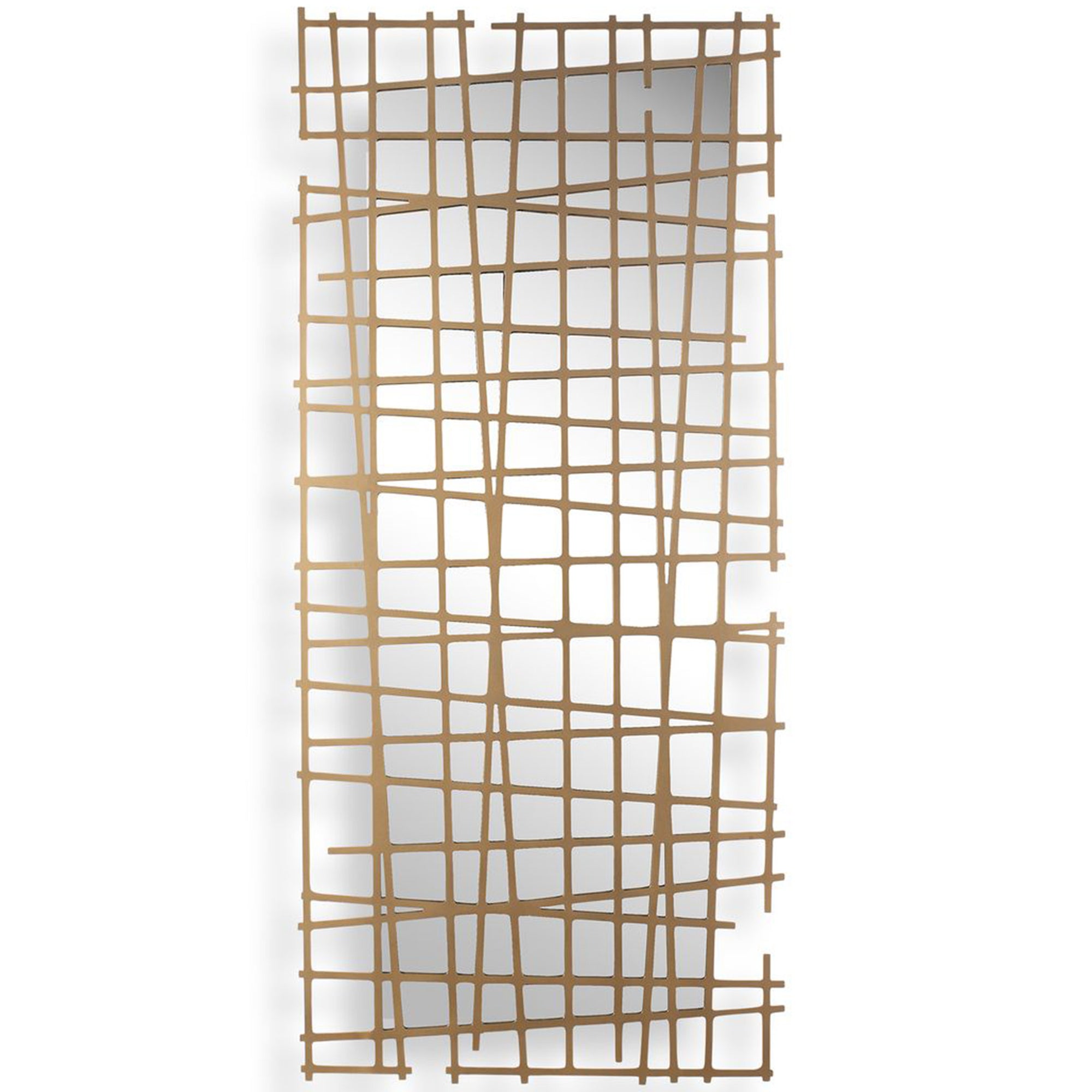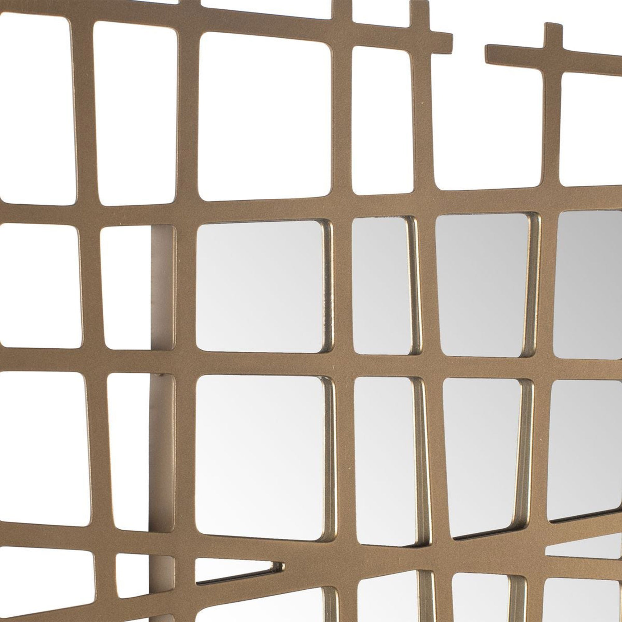 The Golden Intersection Metal Wall Decor brings architectural artistry to any space with its sophisticated abstract grid design. This piece features a layered network of intersecting iron rods that create a striking geometric frame, balancing structured lines with an organic feel. With the versatility to be hung either horizontally or vertically, this unique mirror serves as a bold statement piece perfect for entryways, living rooms, or hallways.
