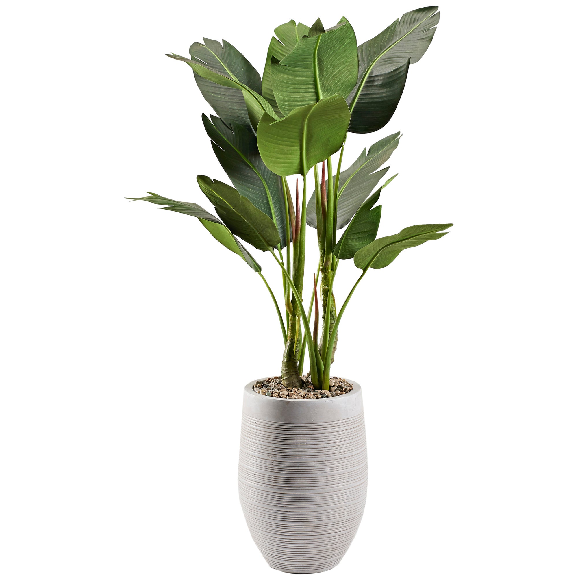 The 5' Bird of Paradise Tree in Kai Planter makes a bold tropical statement while grounding the look with modern texture. Standing 60 inches tall, this faux tree features large, fan-like leaves that form an upright, voluminous canopy. It is housed in the Kai Planter, a light grey vessel with an elongated oval shape and a striking horizontal ribbed texture.