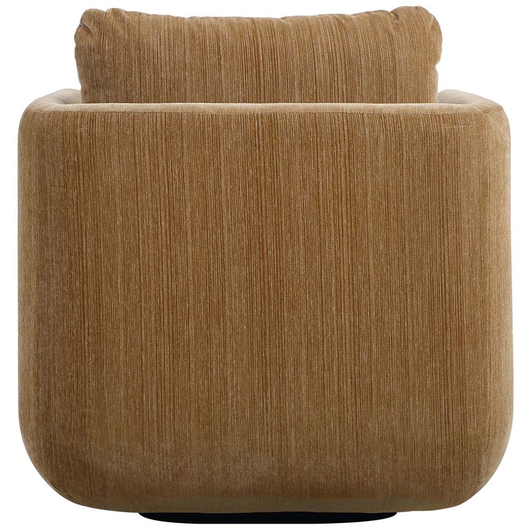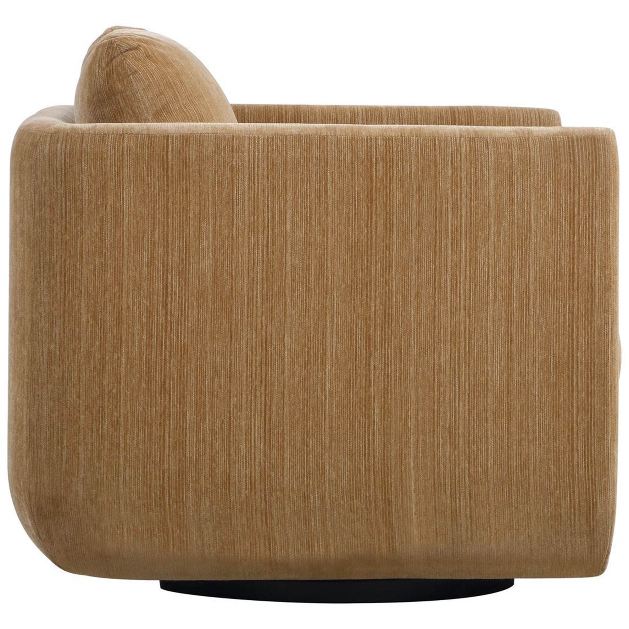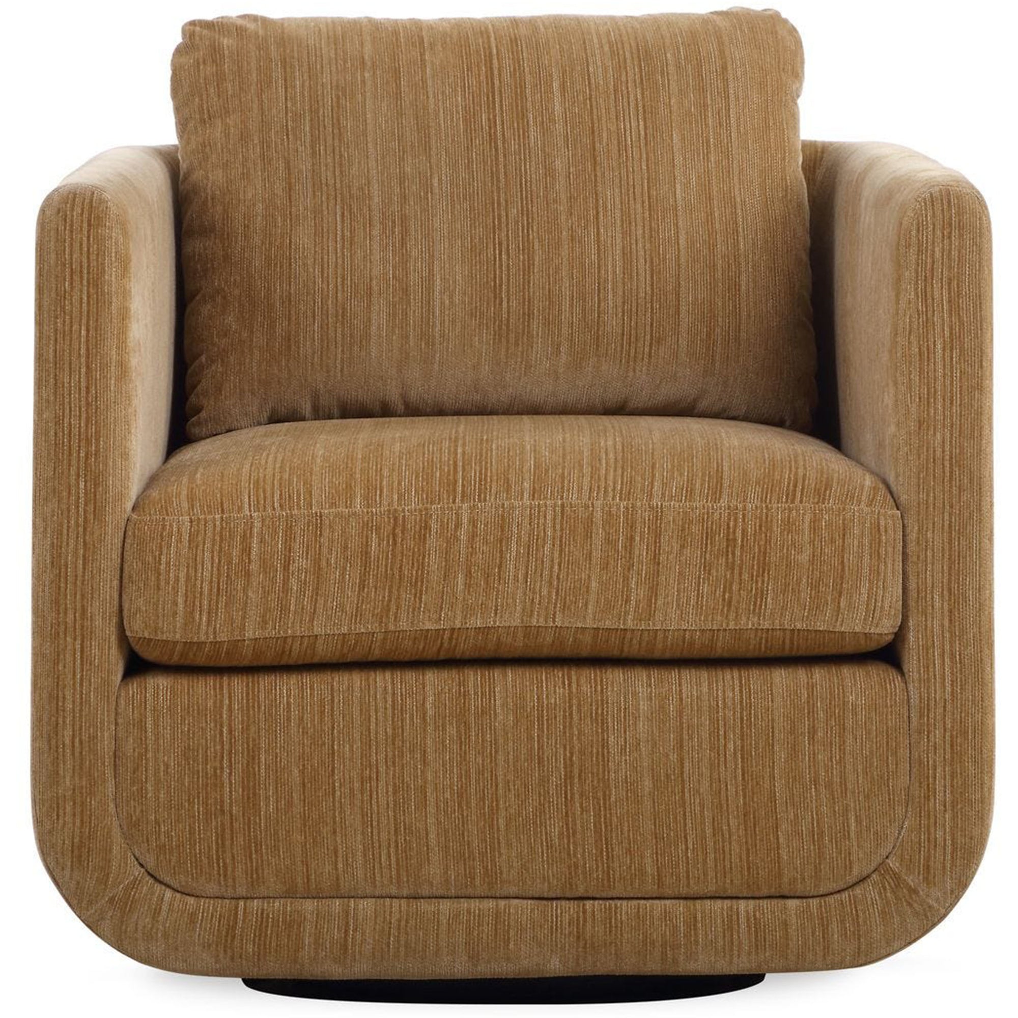 The Abound Swivel Chair features a rounded club chair silhouette that brings a clean architectural presence to any living space or study. It showcases a deep plush seat and backrest, providing a generous and functional area for relaxation. The integrated framework is defined by a unique rounded base that cradles the seating structure. A hidden 360 degree swivel mechanism allows for effortless rotation and versatile placement within a room. The fully upholstered exterior maintains a streamlined minimalist profile while ensuring a secure and functional focal point. This well proportioned design effortlessly merges organic forms with practical comfort to anchor a contemporary interior.