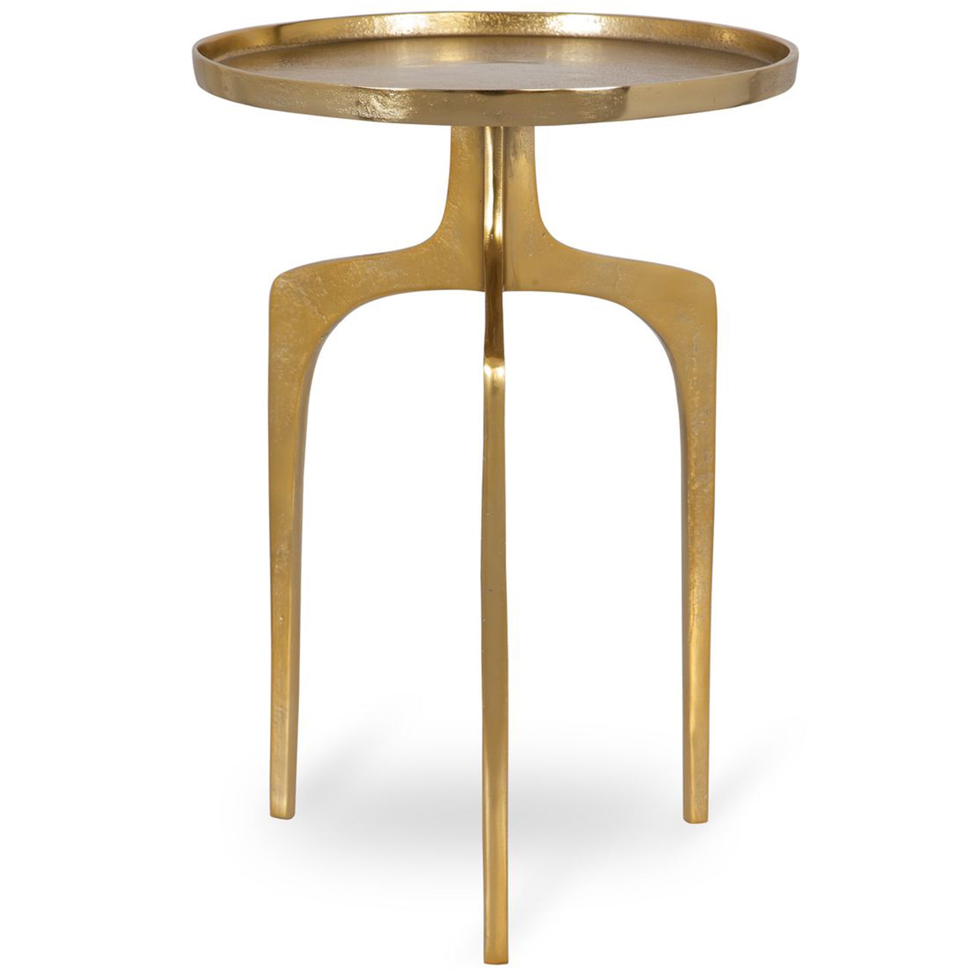 The Adley Accent Table features a unique, sculptural design with three gracefully curved legs supporting a round top. The solid tray-style surface is perfect for keeping items secure and looks beautiful beside your favorite chair. Finished in a textured soft gold, this table adds a touch of modern elegance and visual interest to any space.