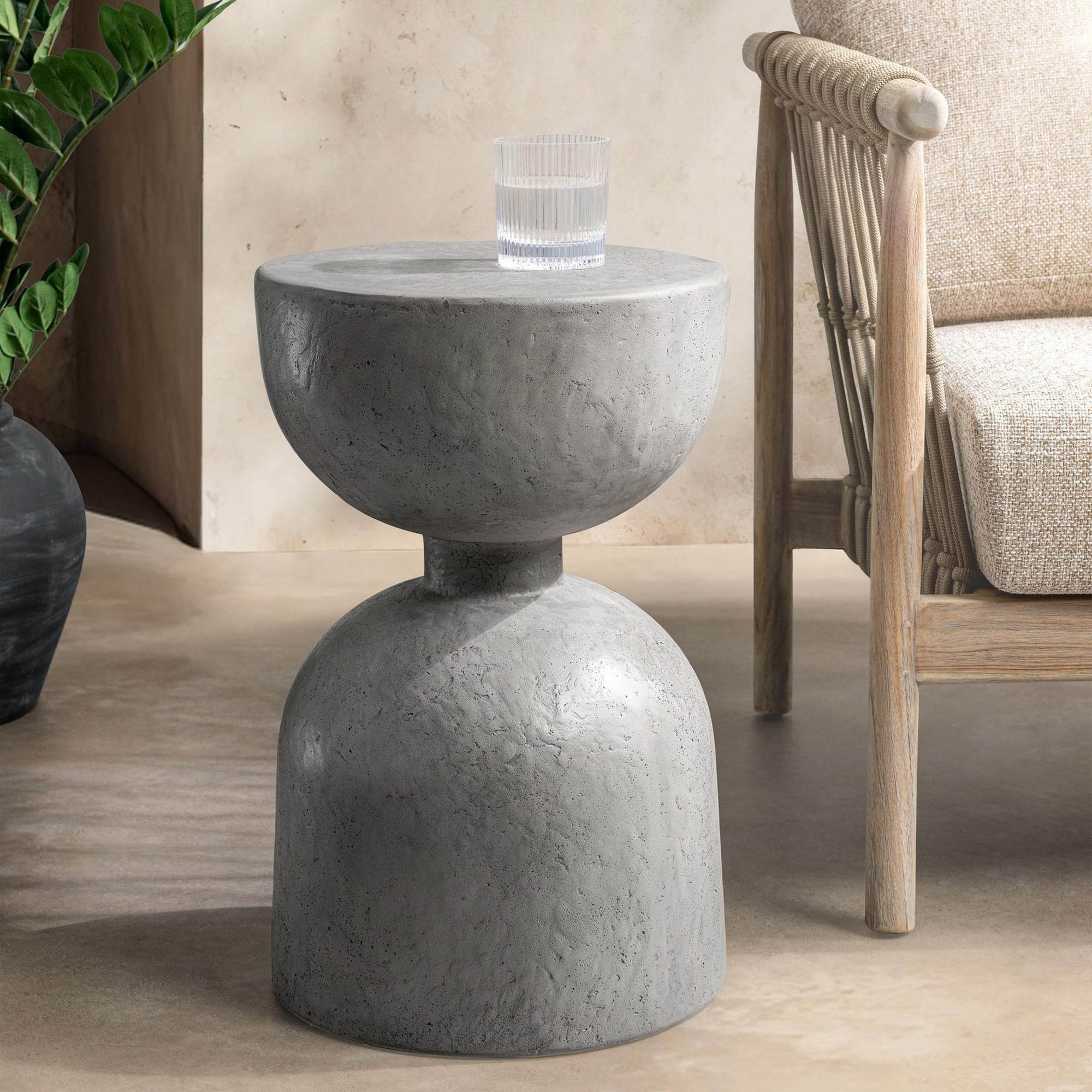 The Adna Outdoor Accent Table brings sculptural beauty to your outdoor space. Crafted from durable materials, its hourglass silhouette and textured stone-like finish make it a perfect blend of modern artistry and timeless durability. Ideal for patios, gardens, or poolside retreats, this table invites conversation and style.