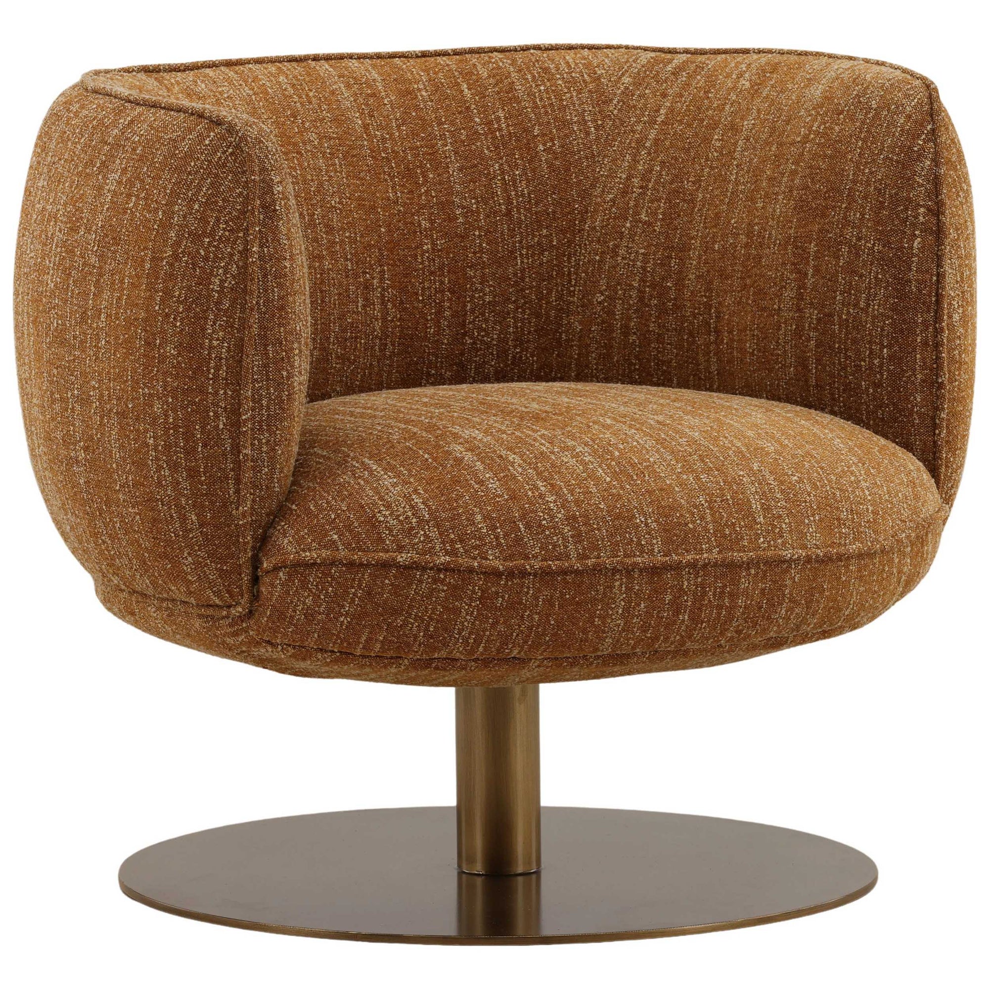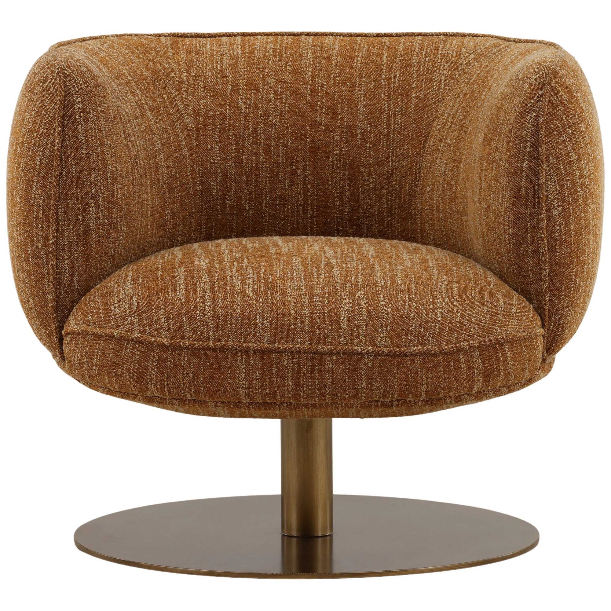 The Aisha Swivel Chair is a statement accent piece defined by its sleek, rounded silhouette and luxurious Boucle Fabric upholstery. The low-slung, fully upholstered seat and curved back provide deep comfort, while the swivel base in an antique brass finish adds modern functionality. Its rich color and compact footprint make it an eye-catching addition to any contemporary living space.