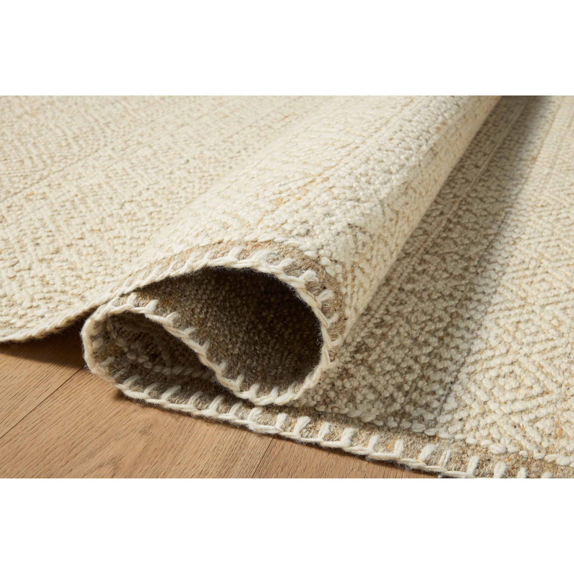 The Bowie Collection by Amber Lewis x Loloi is a beautifully crafted, textured area rug with an earthy, organic aesthetic. The pile features a flatweave base with chunkier, slightly raised geometric motifs and whipstitched edges. It's an elegant yet easy-to-work-with rug, ideal for living rooms, bedrooms, and other high-traffic areas of the home. Amber Lewis × Loloi Rug Bowie made of wool, cotton, and other fibers in India and is GoodWeave-certified, ensuring our commitment to ethical production and the support of weavers communities.