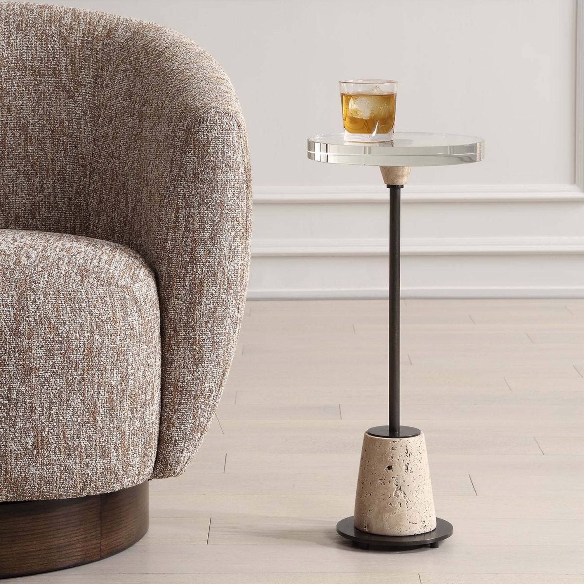 The Arthur Drink Table brings an organic and sophisticated aesthetic to any room, fusing classic materials into a compact, functional design. The table features a thick, round crystal top that showcases a sleek, minimalist profile. This top is supported by a slender iron stem finished in a rich bronze. The base is crafted from honed and unfilled travertine, providing a grounded, natural element with unique textures.