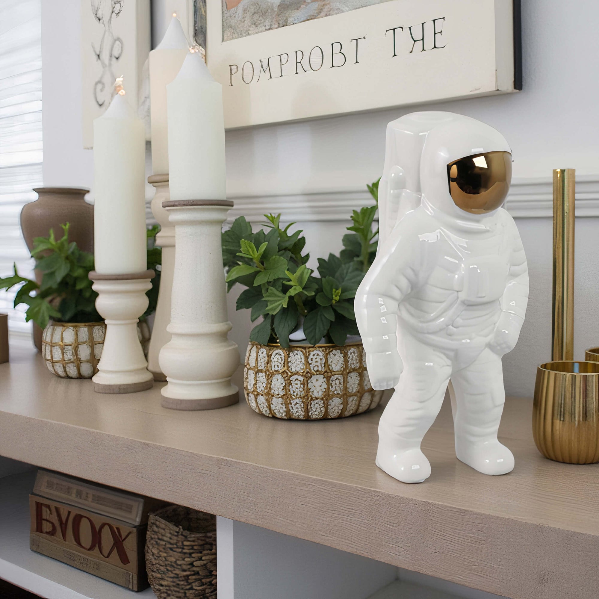 The Astronaut Statuette adds a playful yet sophisticated touch to any space. Crafted from smooth ceramic, this charming figure captures the wonder of exploration with a sleek, modern finish. Its detailed spacesuit design brings texture and dimension, while the glossy surface lends a refined, contemporary appeal. Perfect for a bookshelf, console, or office desk, this piece celebrates curiosity and imagination—making it an inspiring accent for modern, eclectic, or youthful interiors.