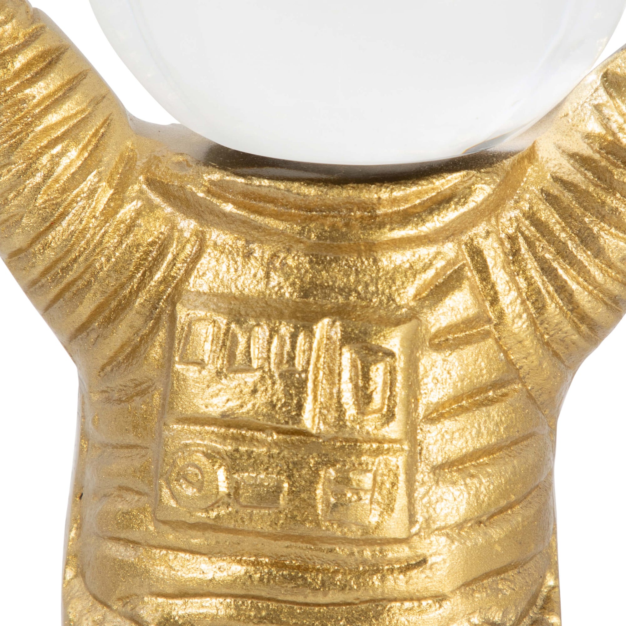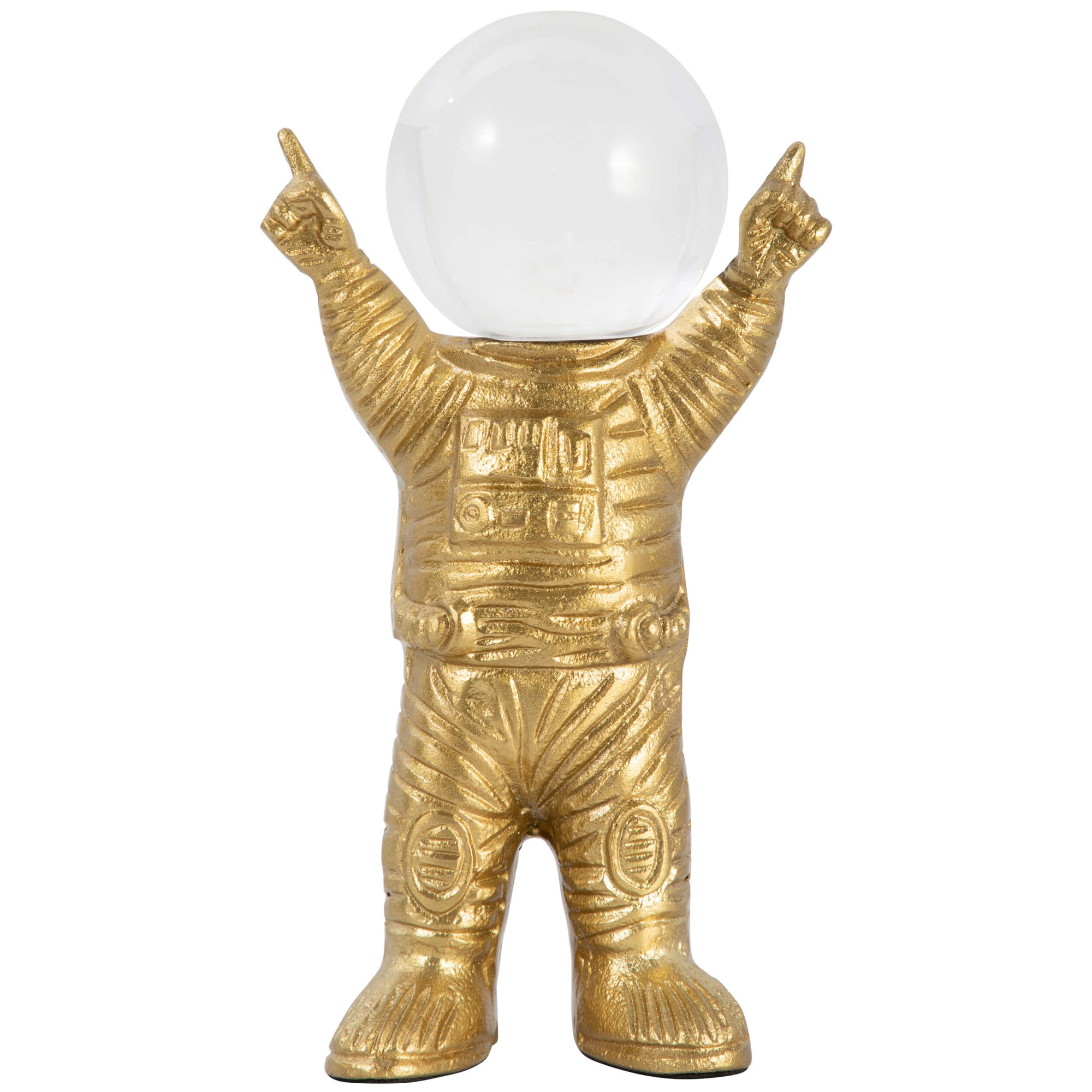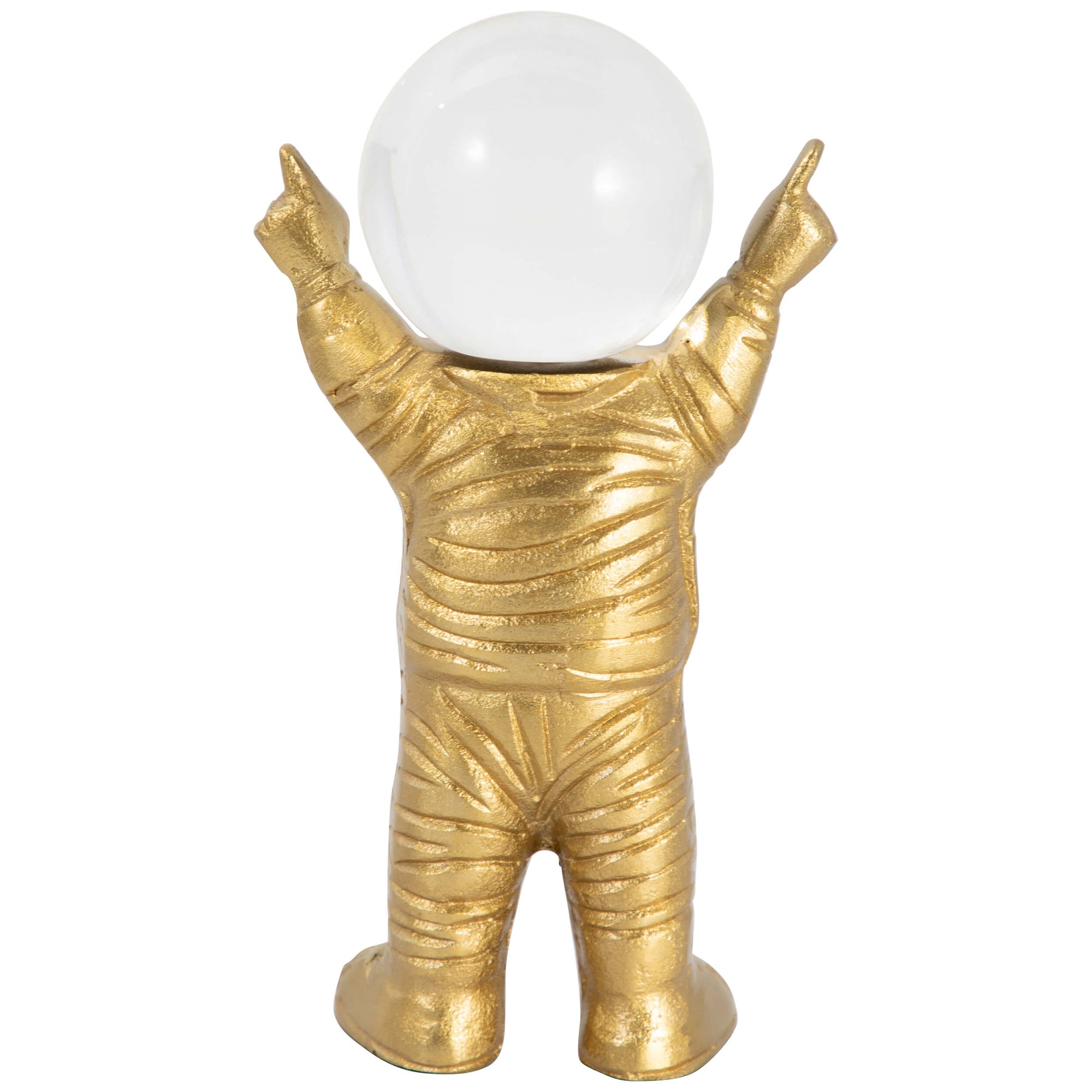 The Astronaut with Crystal Orb Head brings a whimsical, modern touch to any décor. Crafted from solid aluminum with a gleaming gold finish, this sculptural piece captures the adventurous spirit of space exploration. Its transparent glass orb head adds a futuristic element, creating a striking contrast against the metallic body. Perfect as a statement accessory on a console, bookshelf, or desk, it reflects curiosity, creativity, and bold design. A stellar accent for contemporary, eclectic, or art-inspired interiors.