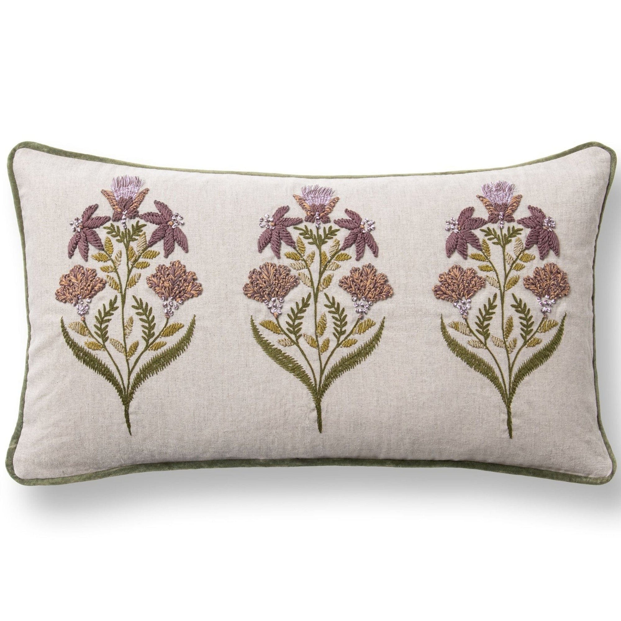 The Belcourt Floral Pillow is an exquisite lumbar pillow featuring an intricate, multicolored floral embroidered design. Crafted from a refined 50% Cotton and 50% Linen blend, the pillow is finished with a contrasting olive green piping detail. This sophisticated piece is ideal for adding fine texture and artisan detail to your seating area or bed.