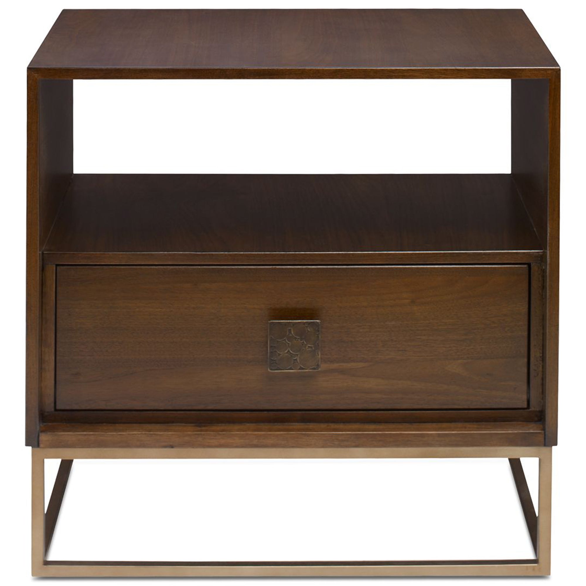 The Bexley Side Table offers a sophisticated blend of modern styling and versatile storage. This piece is fully finished in a rich dark walnut veneer and features a distinctive open pass-through shelf for decorative display. A single pull-out drawer is accented with an embossed metal pull in antique brass, while the entire unit sits elegantly atop a brushed brass open-framed iron base, creating a refined mixed-material aesthetic.