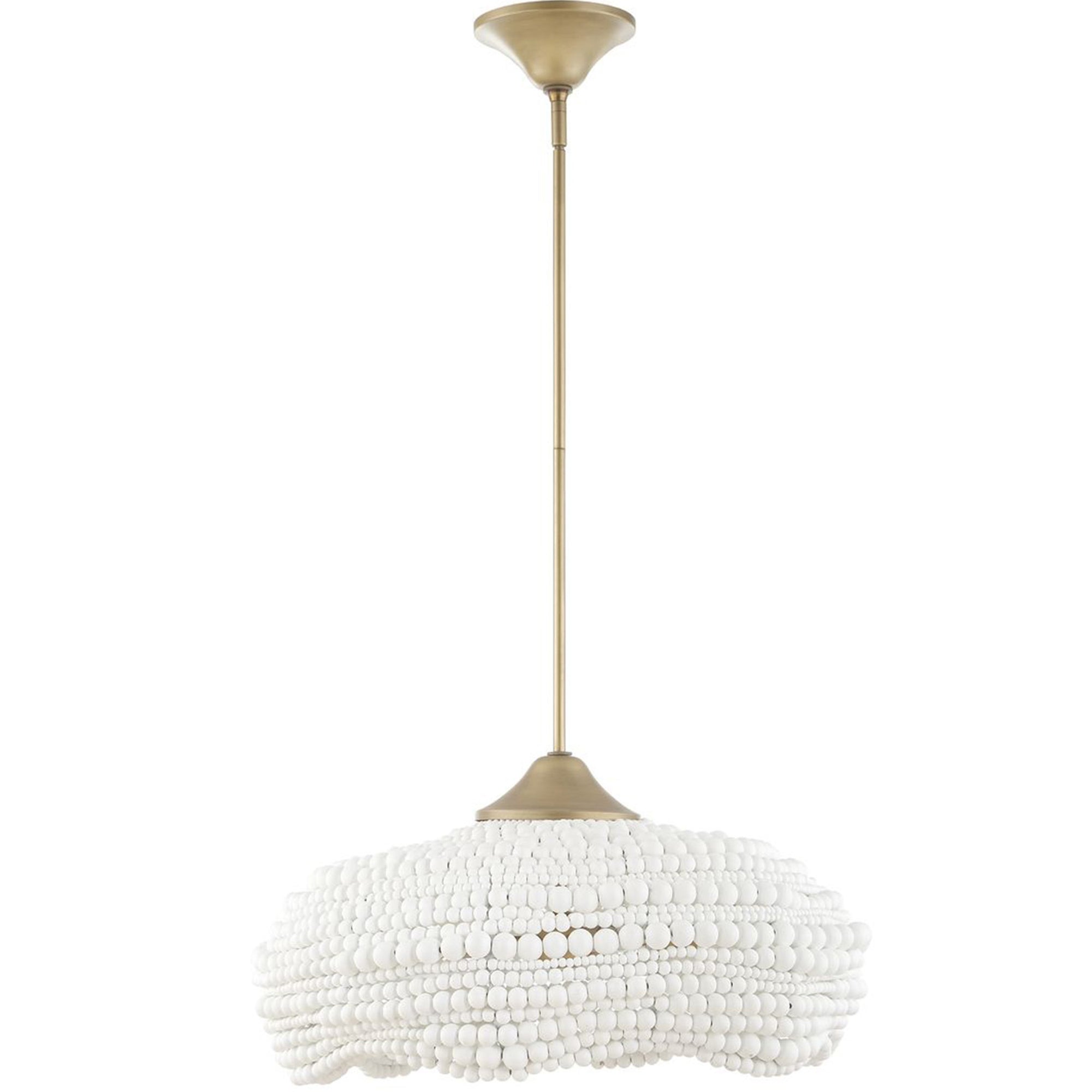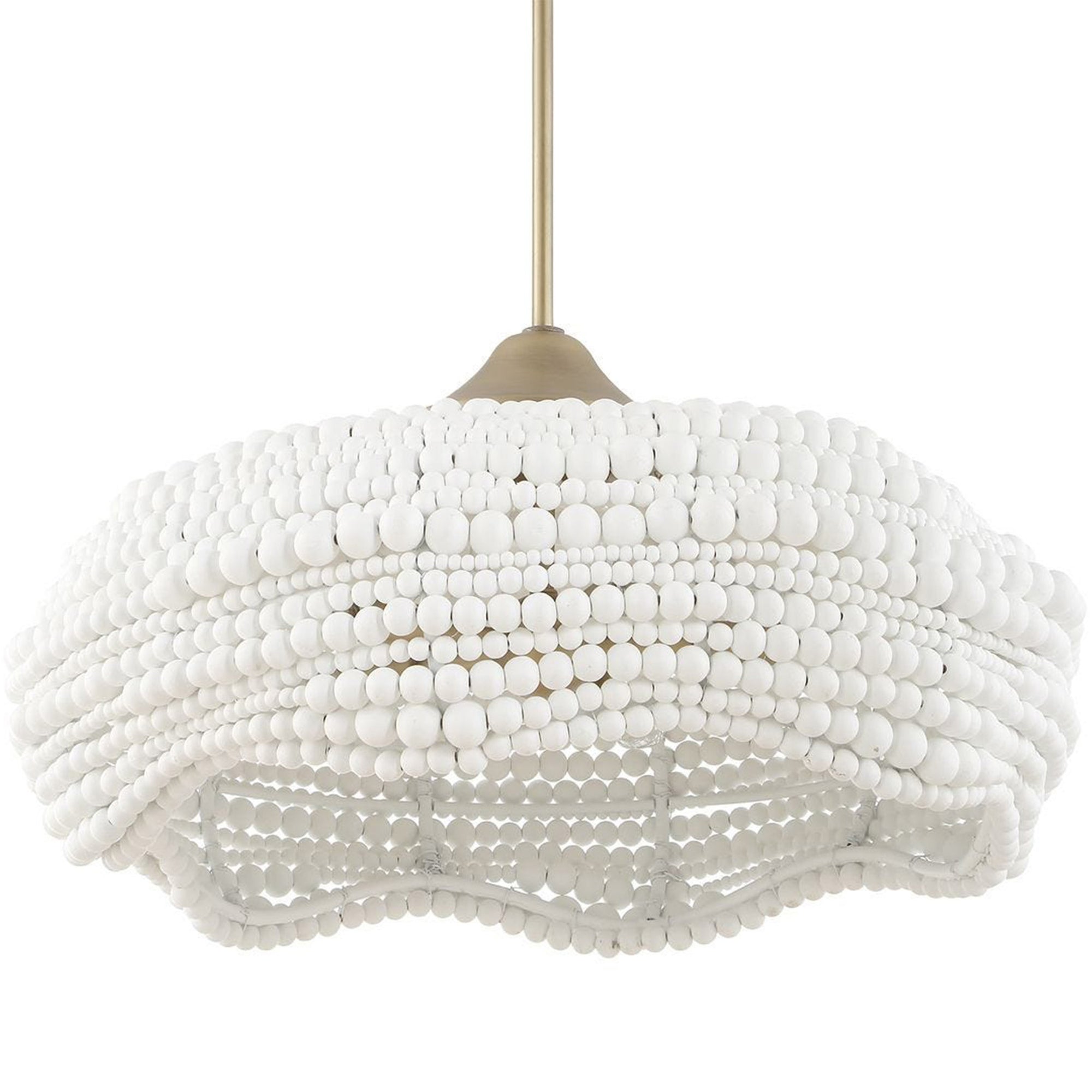 The Biddeford 5 Light Pendant is a refreshing fixture featuring a 24-inch scalloped shade. The shade is artfully composed of various sizes of intermingled matte white wood beads, accented with a brushed matte gold finish. This design gives an airy and inviting feeling to any interior space.