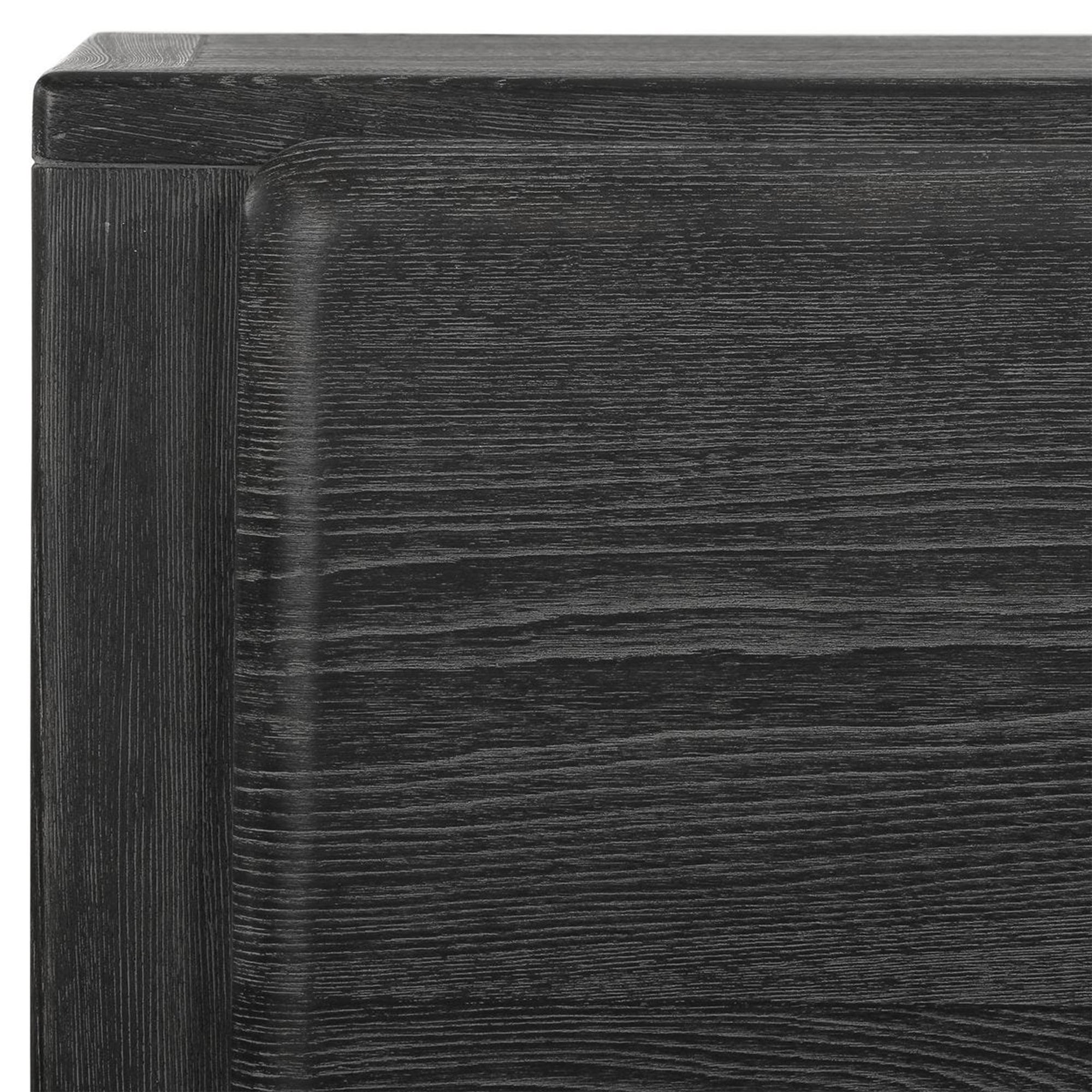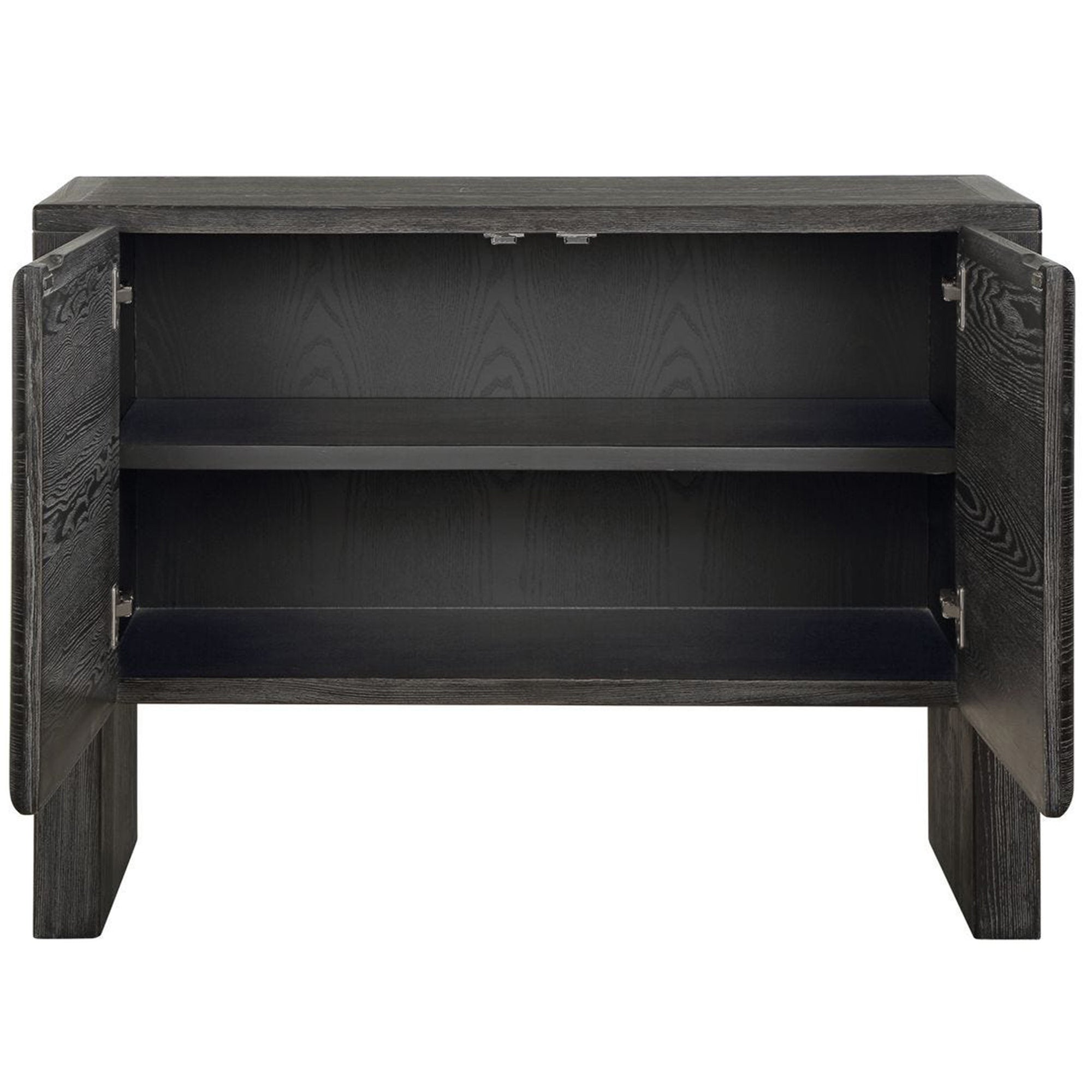 The Bierk 2 Door Cabinet features a thick rectangular silhouette that brings a bold architectural presence to any living space or hallway. It showcases a broad flat top surface, providing a generous and functional area for displaying decorative accents. The facade is defined by two flush doors characterized by inset rectangular panels with softly rounded corners for a clean minimalist profile. The entire structure is supported by massive integrated block legs that ensure robust stability while maintaining a seamless geometric profile. This well proportioned design effortlessly merges streamlined forms with practical storage utility to anchor a contemporary interior.