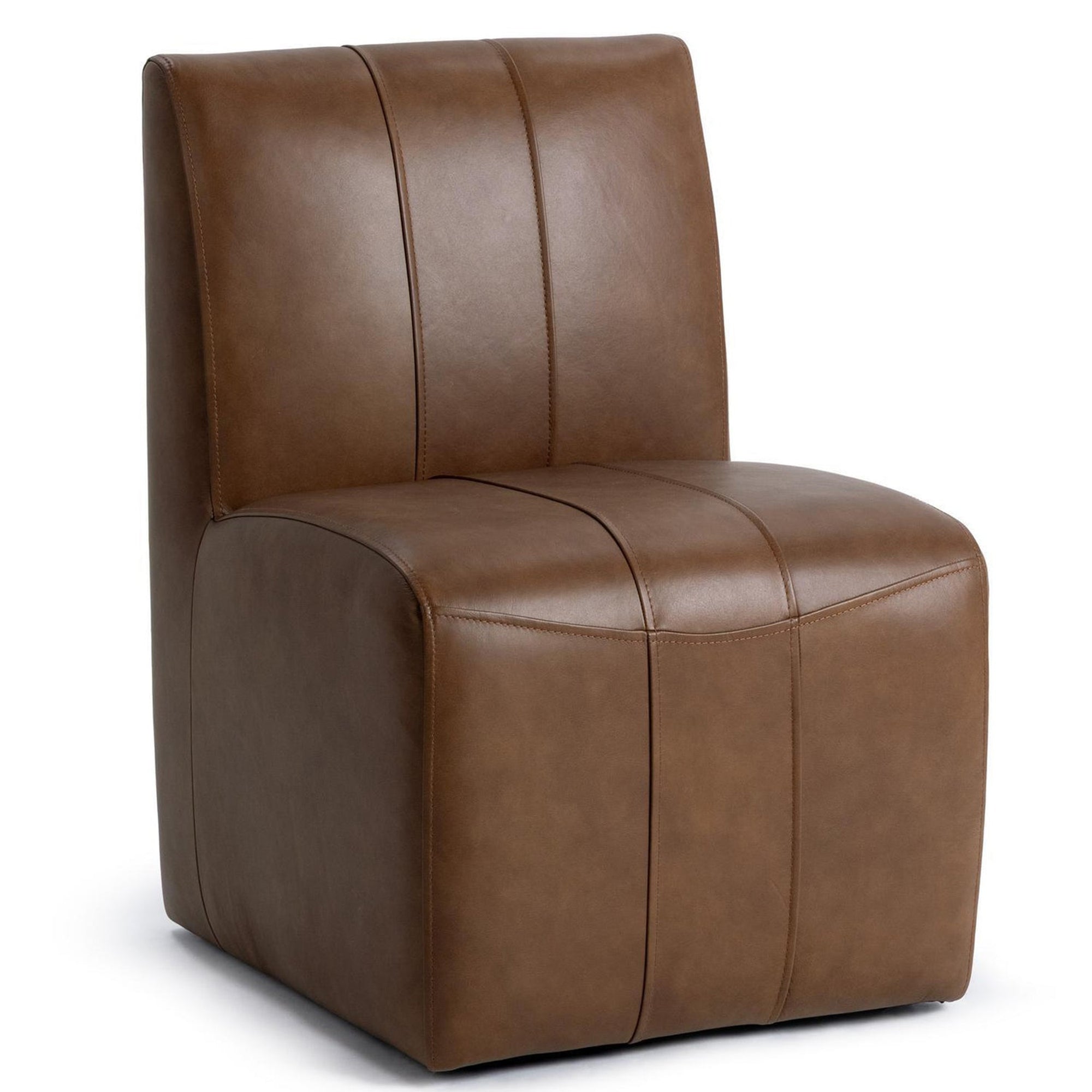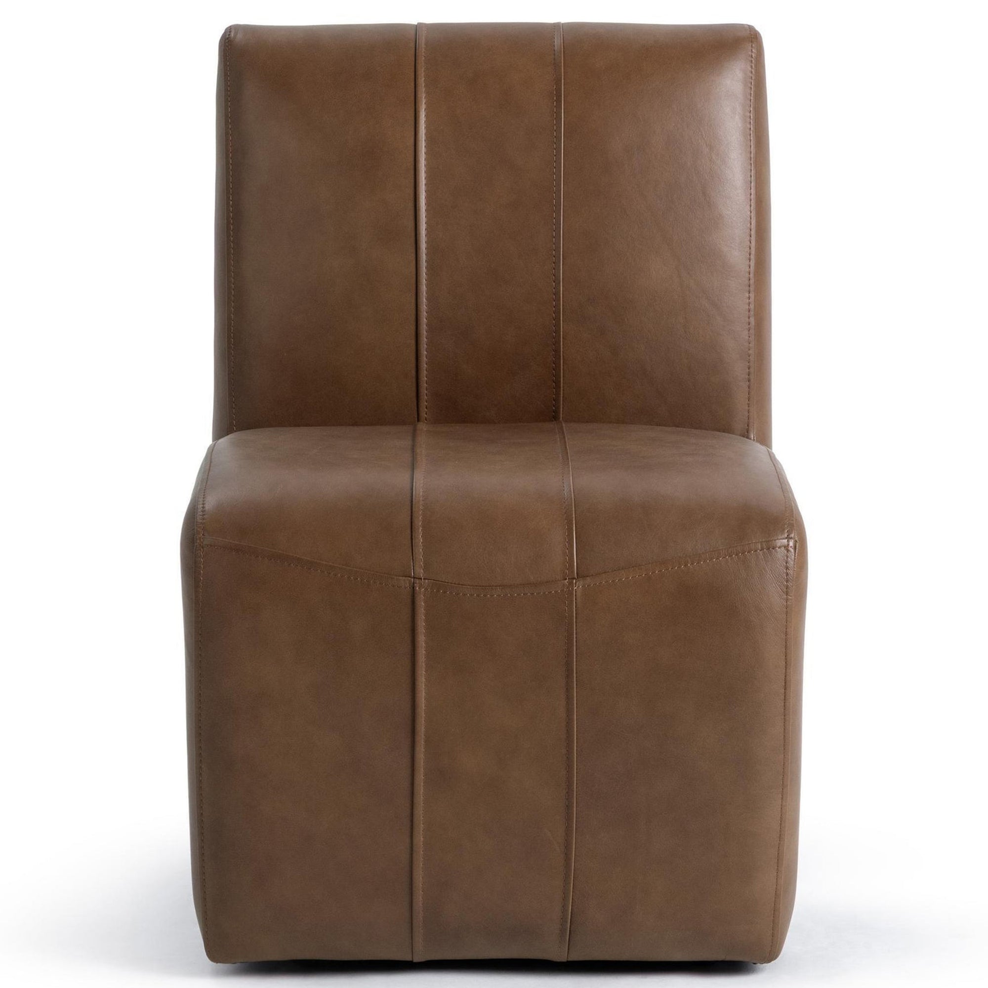 The Brighton Leather Dining Chair elevates your dining experience, designed for both luxury and function. Its smooth top-grain leather upholstery offers a sleek, modern appeal, while hidden caster wheels provide effortless mobility. The armless silhouette and plush cushioning create a refined yet comfortable seating experience, making it a sophisticated addition to any space.