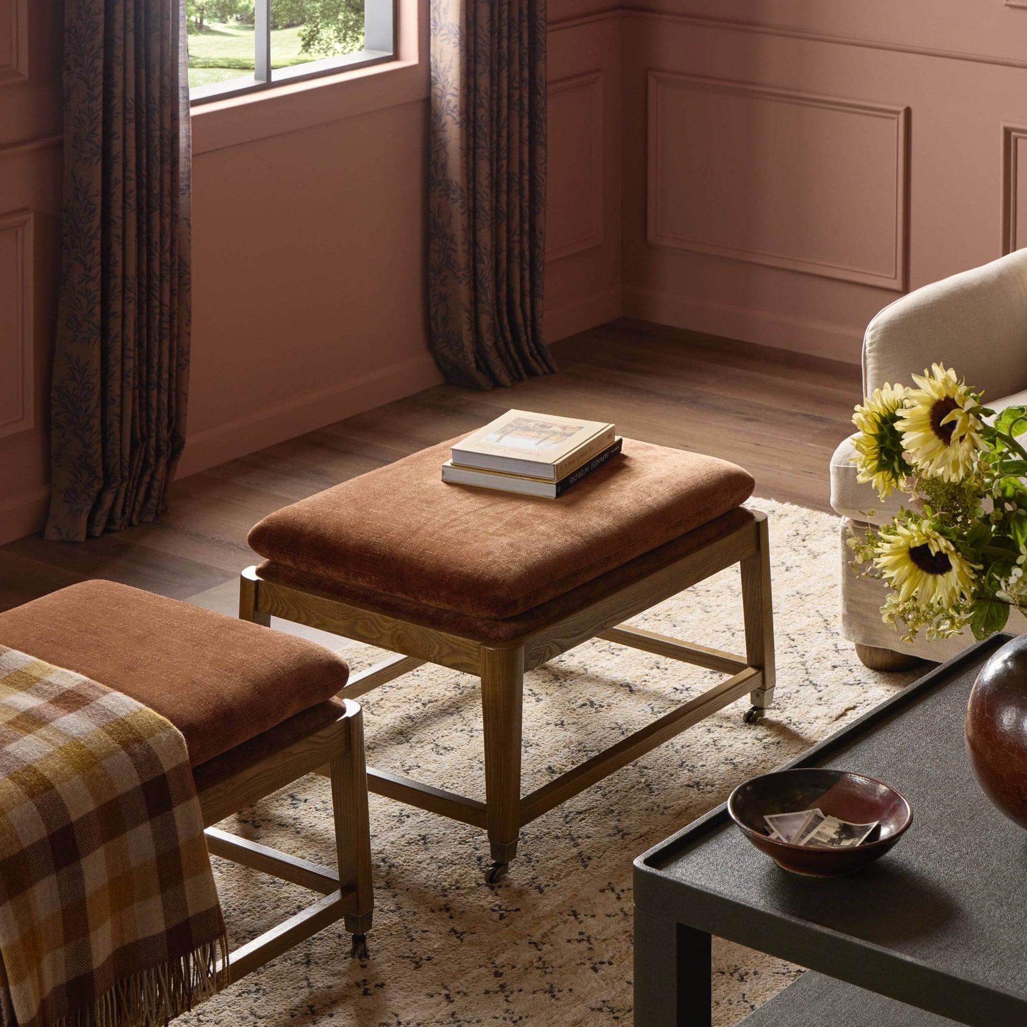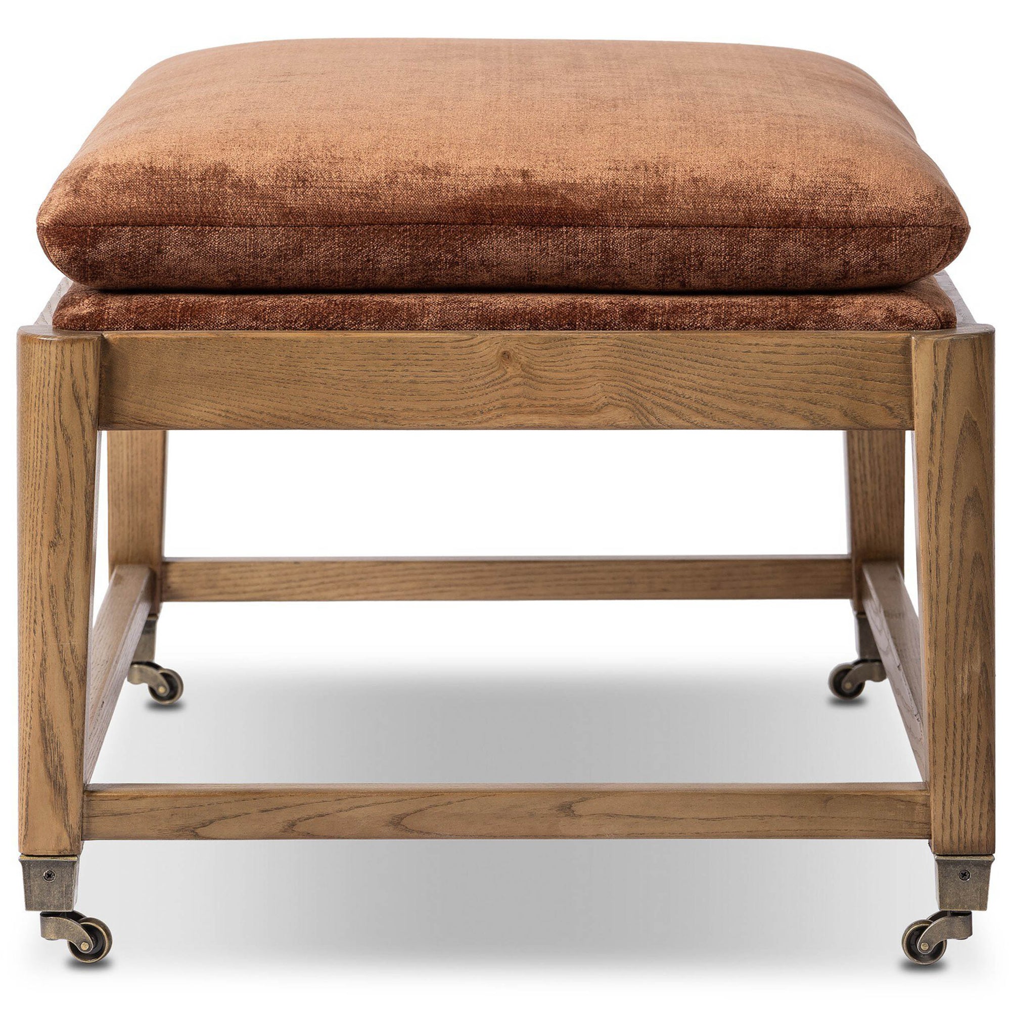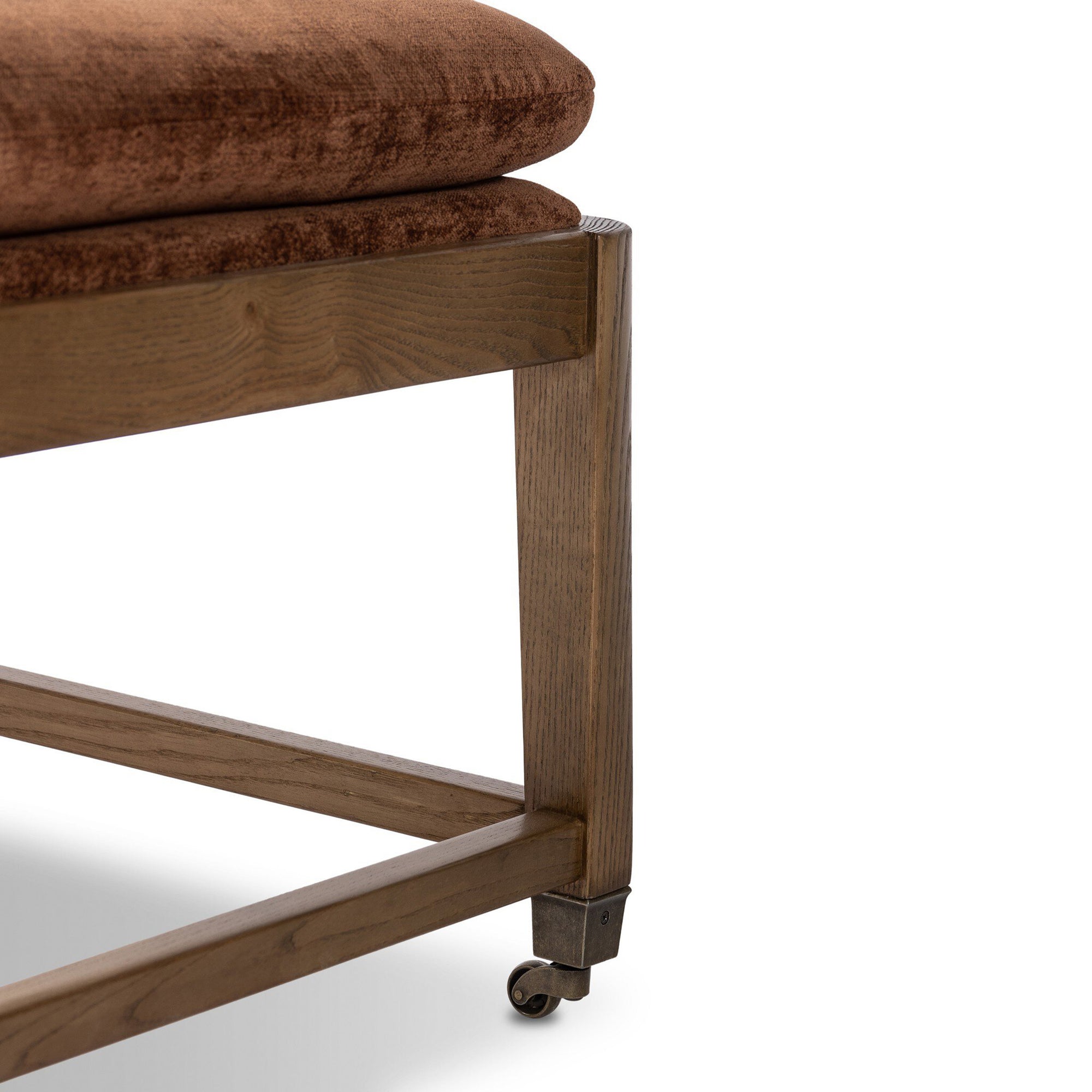 The Eleanor Accent Stool offers a refined take on antique-inspired design. Upholstered in soft chenille-like rust velvet, this versatile stool features a semi-attached cushion for comfort and livability. A toasted ash wood base with aged brass metal casters brings function and warmth, blending traditional charm with modern practicality. Perfect as an accent seat or at the foot of a bed.