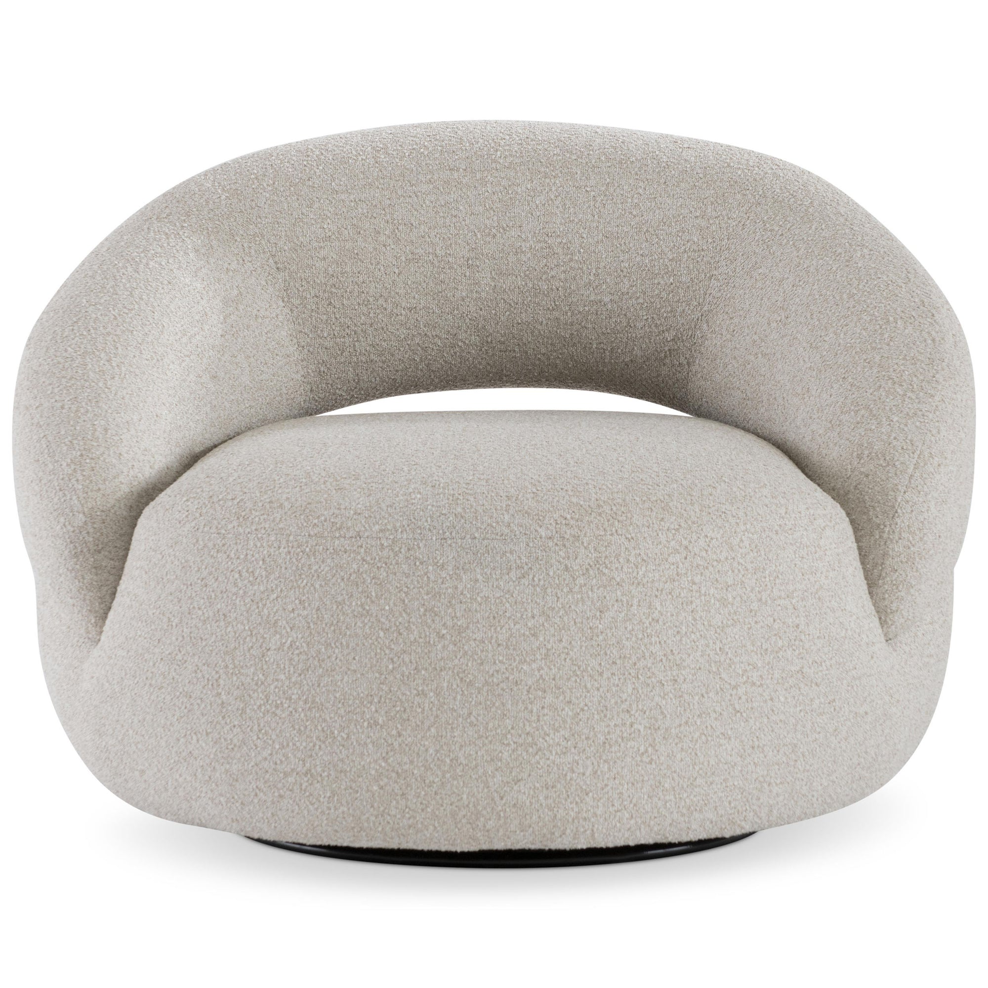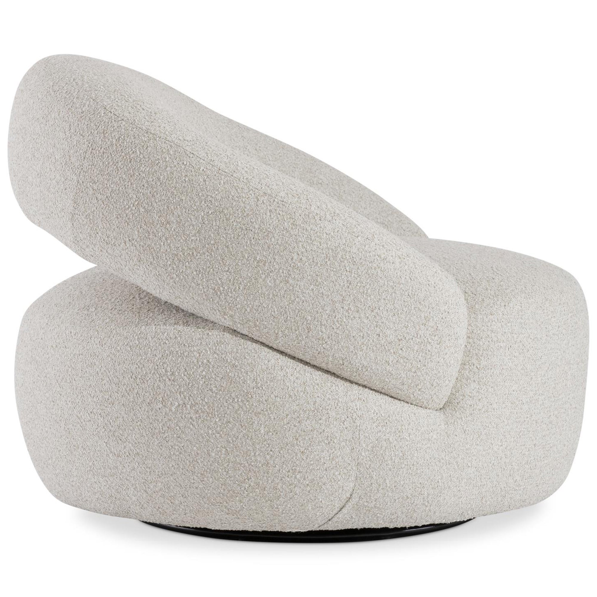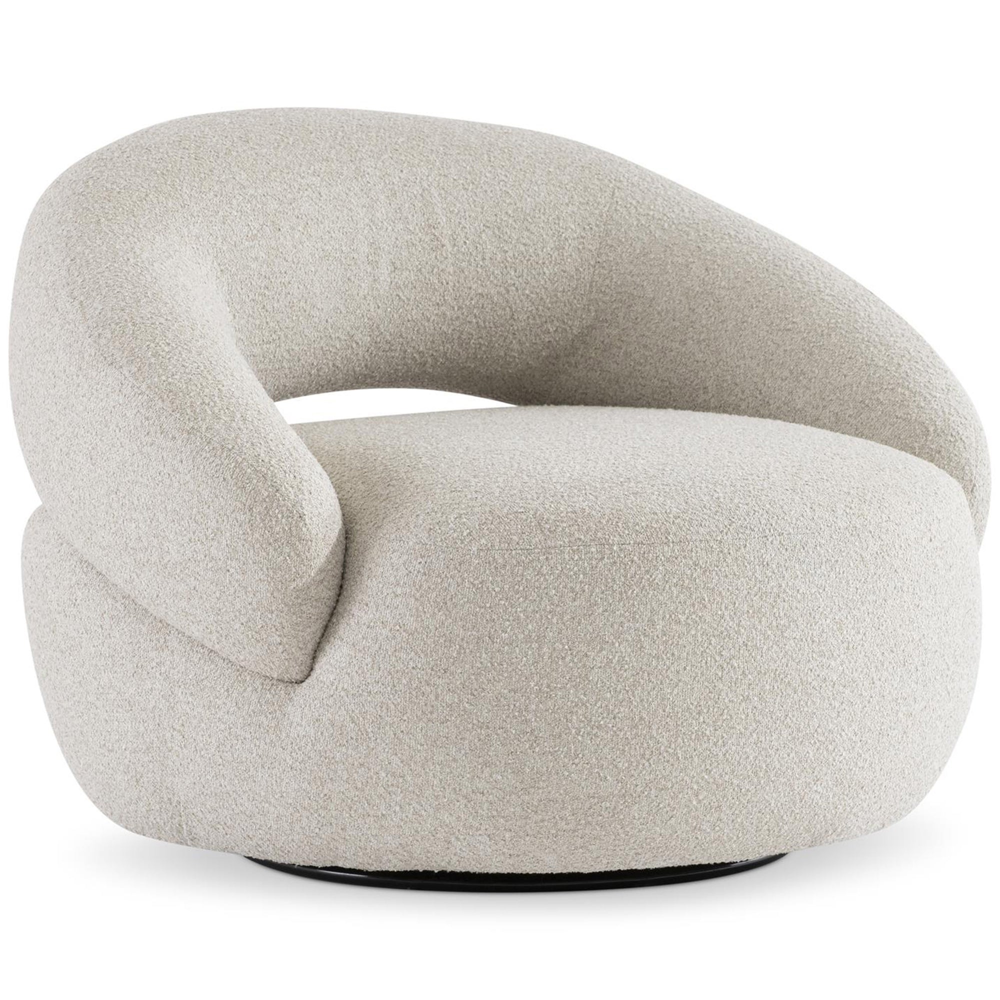 The Cascais Outdoor Swivel Chair features soft modern lines in a generous silhouette. A curved back wraps into the arms, surrounding a deep seat set atop a smooth swivel base. The open back adds a light, sophisticated touch to any outdoor setting.