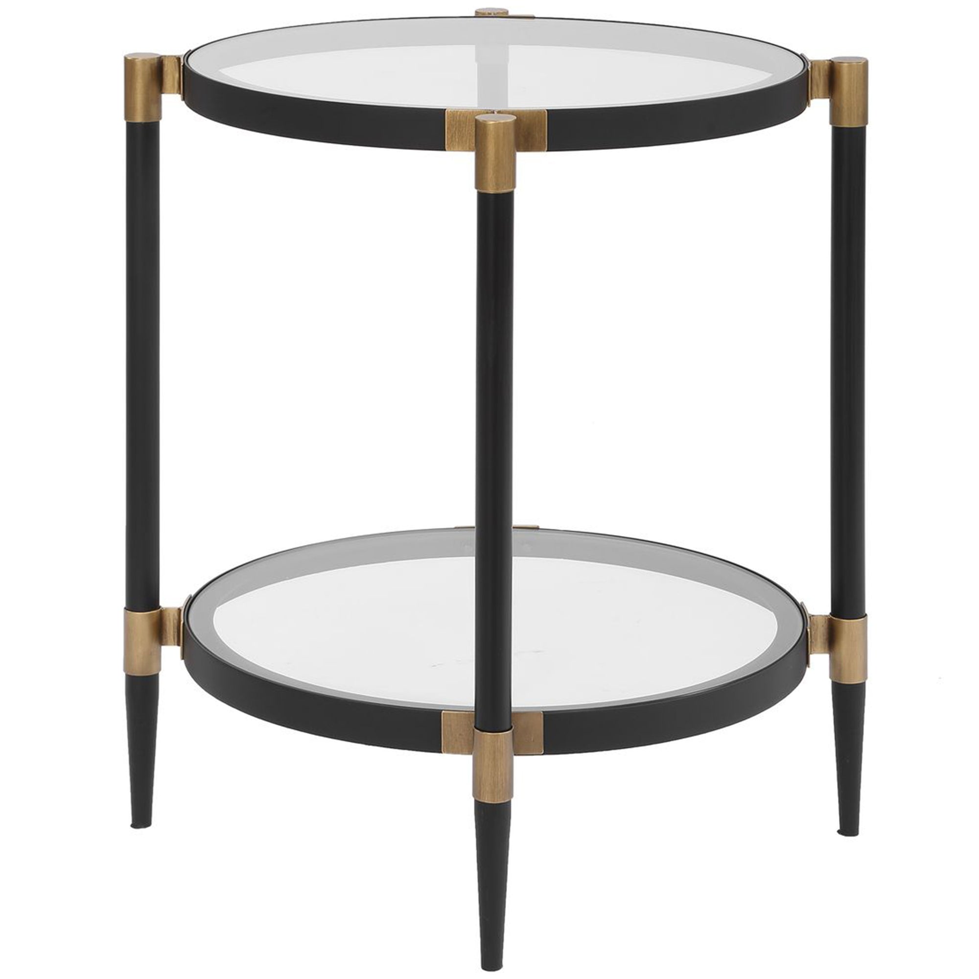 The Chadid Side Table features an elegant and minimalist design with a focus on open space. This piece is constructed with a circular frame that supports two tempered glass surfaces, providing both a functional tabletop and a lower display shelf. The Chadid Side Table stands on four slender, tapered legs that are secured with metallic joinery, creating a light and airy silhouette that complements any modern living area or bedside.