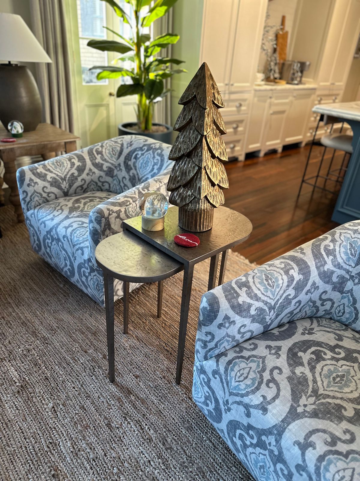 Love the rounded features of this metal nesting table. Elegant but not formal. Very sturdy with plenty of space for drinks & nibbles. Works perfectly surrounded by our swivel chairs.
