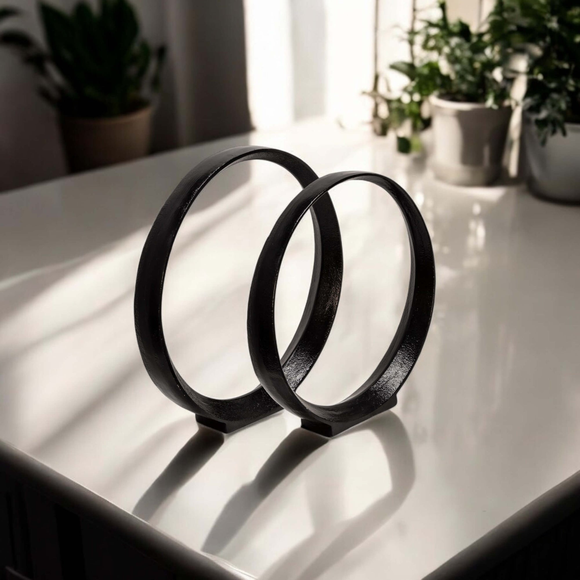 Introduce modern sophistication to your décor with these Circular Aluminum Sculptures. Designed with a sleek, contemporary aesthetic, they add an elegant touch to any tabletop, console, or shelf. Crafted from premium aluminum, each piece offers a perfect balance of durability and lightweight construction, making them easy to display and move as desired. Their clean circular form creates a timeless yet modern appeal, seamlessly complementing a variety of interior styles. Ideal as standalone accents or grouped together, these sculptures bring refined artistry to any space.