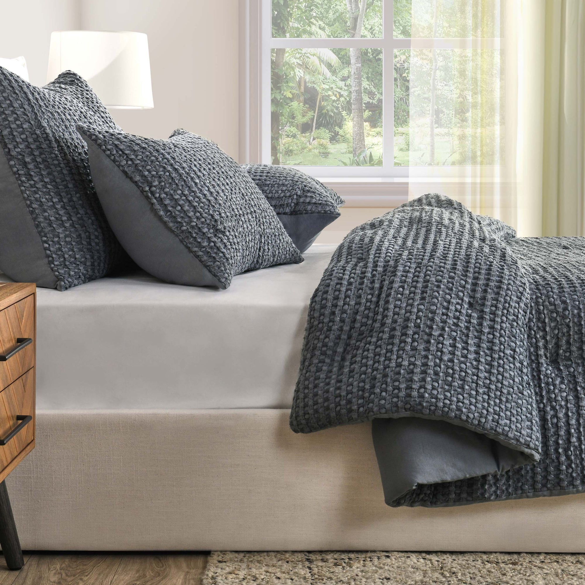 The Colmar Quilt draws inspiration from European textiles, showcasing a waffle-like weave that adds rich texture and dimension. Crafted from a cotton-linen blend, this quilt offers natural softness and fullness that elevates any bedding ensemble, whether styled alone or layered.