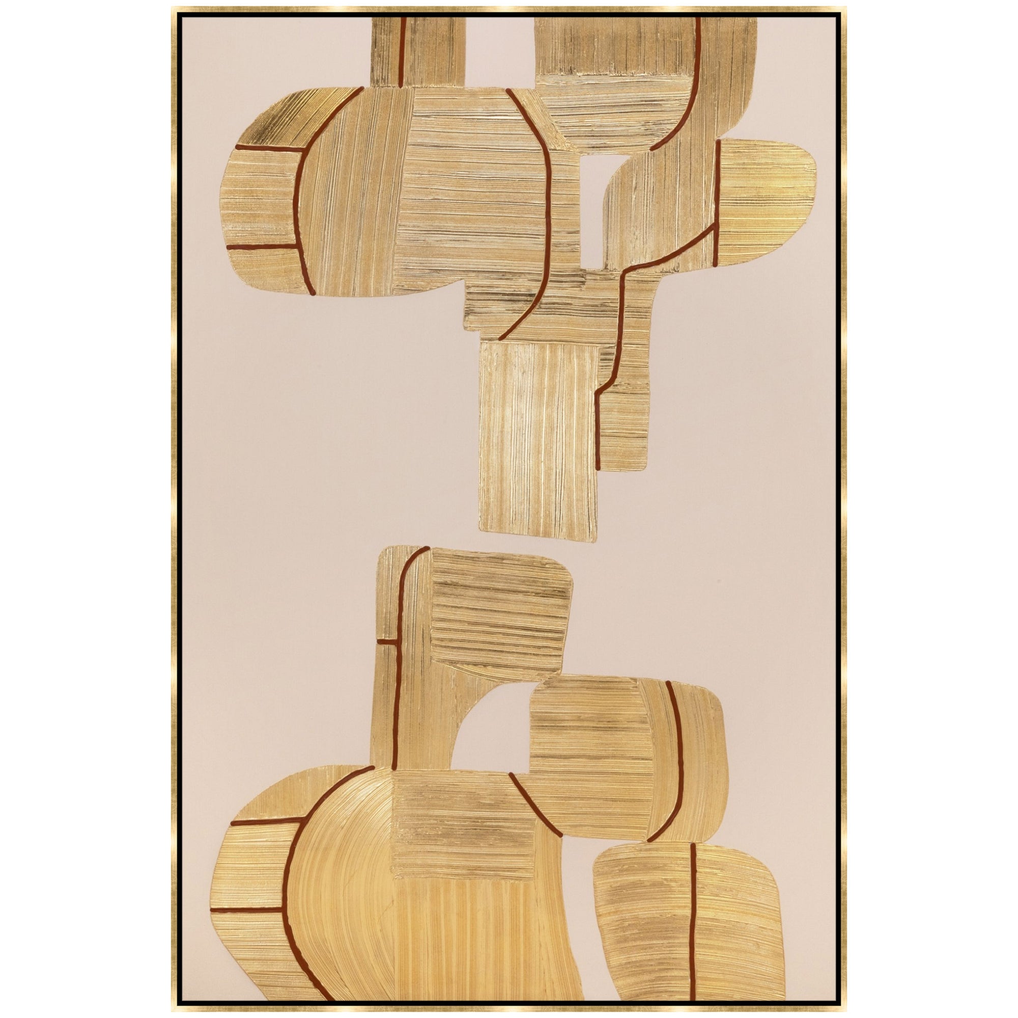 The Connected V Framed artwork by Ocean Milan is a compelling abstract piece defined by its striking textural quality and geometric composition. Large, interlocking shapes created from a fiber-like pattern dominate the canvas, lending a tactile and dimensional feel to the work. The composition is modern and balanced, offering a sense of grounded elegance and intricate artistry to any contemporary space.