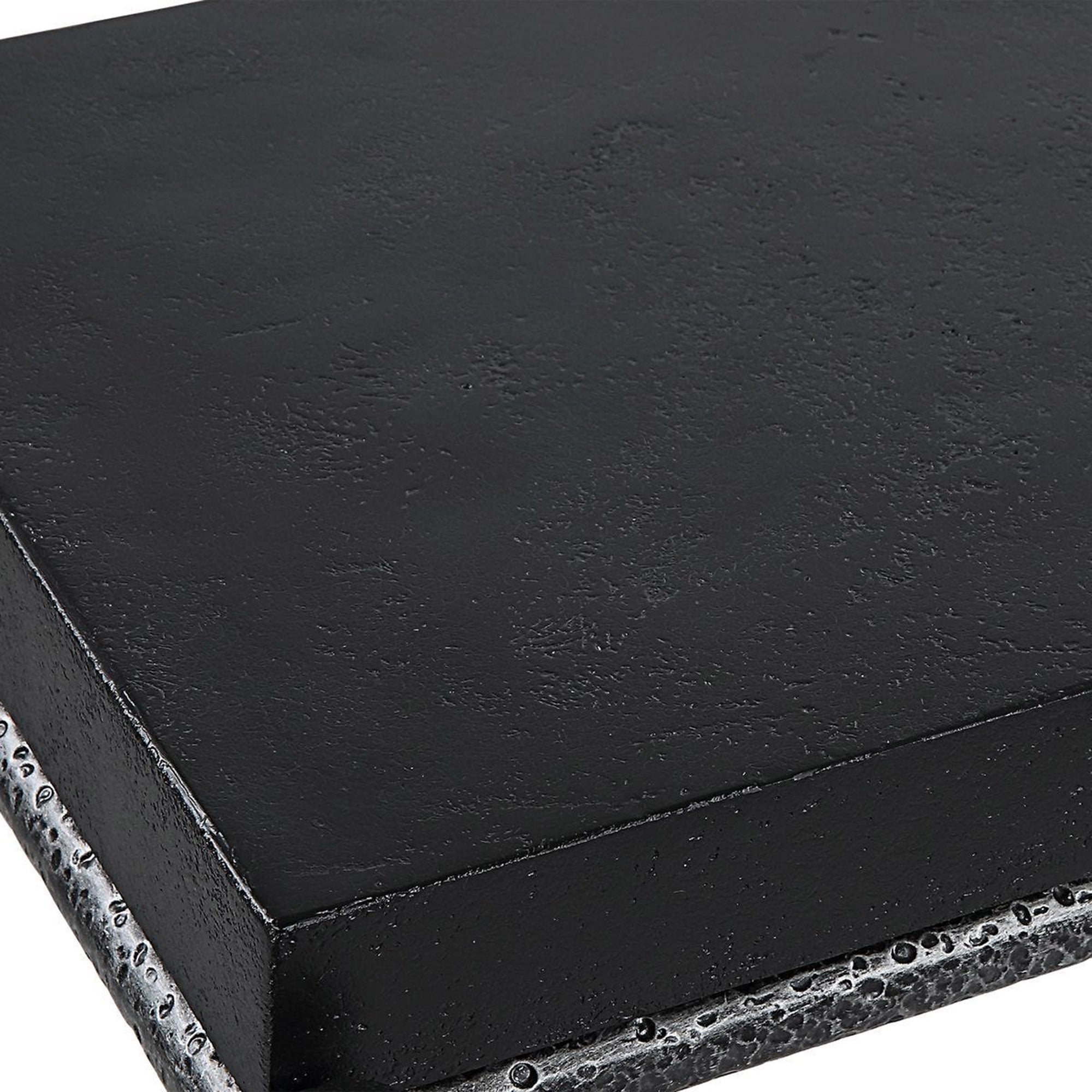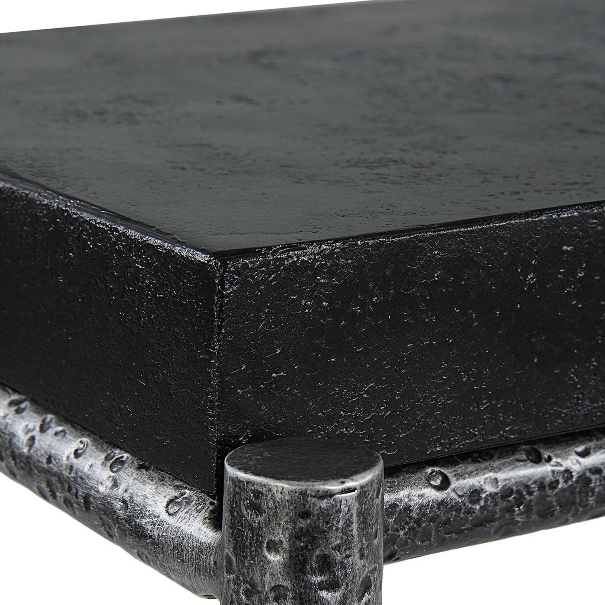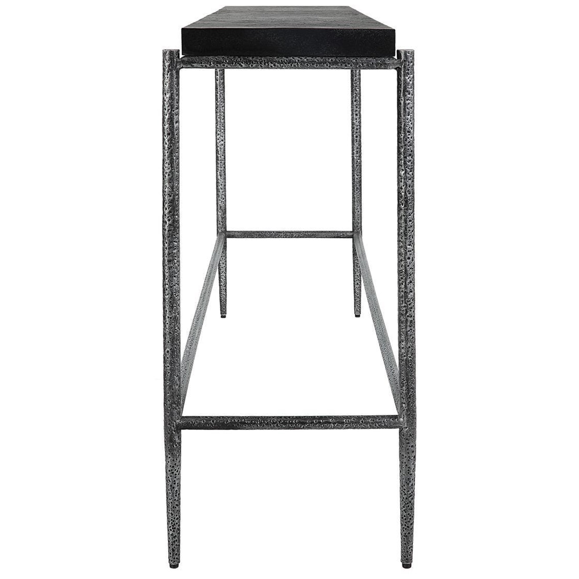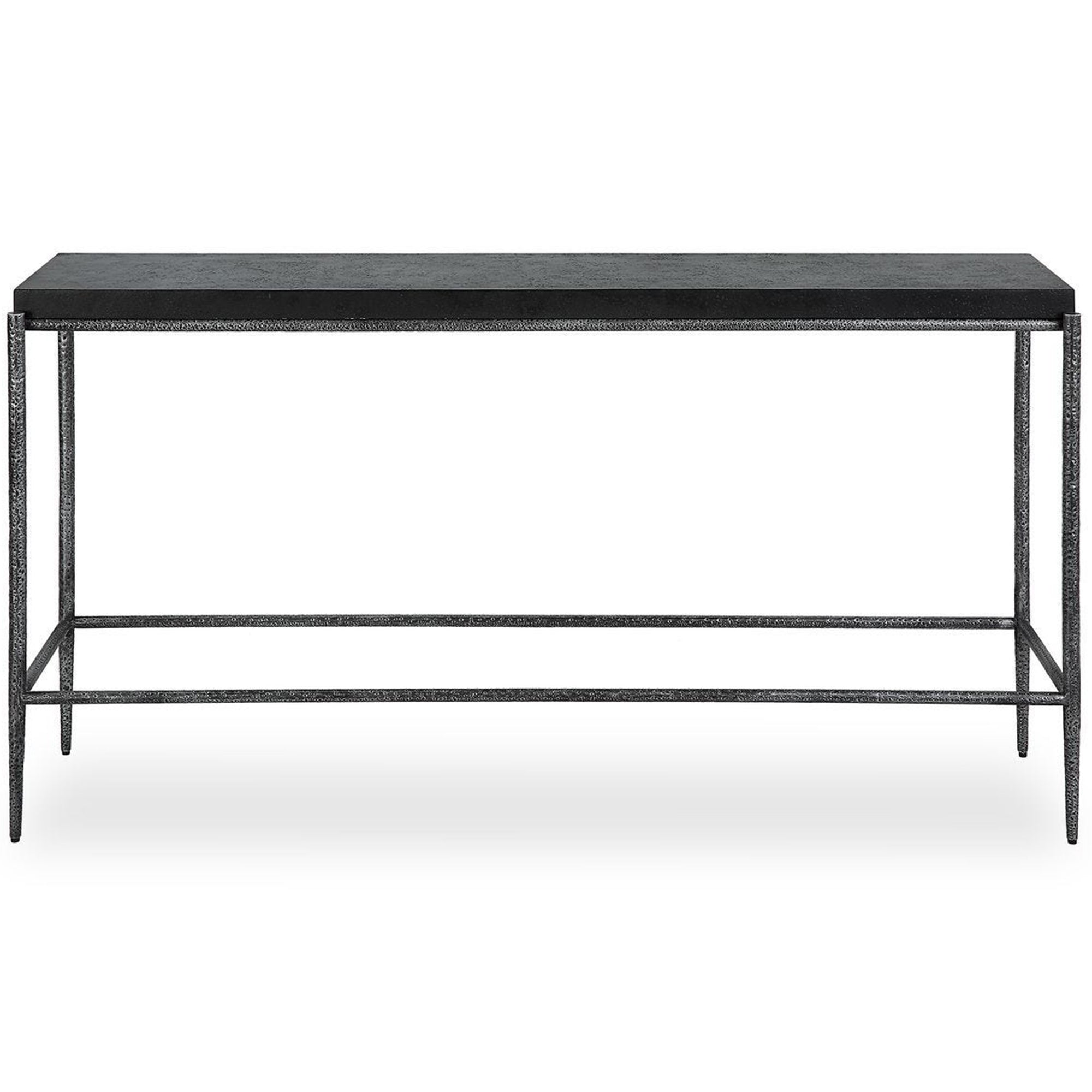 The Crescendo Console Table features a sleek, architectural silhouette that brings a bold contemporary edge to any entryway or living space. It showcases a long, rectangular flat top with a subtle, naturally pitted surface that adds rich tactile interest to the design. This substantial upper piece is supported by a slender, open-frame base consisting of four straight legs and a low-profile stretcher for enhanced stability. The entire framework is distinguished by a heavily hammered, dimpled texture that beautifully catches the light, creating a dynamic visual contrast with the smooth lines of the piece. This well-balanced architectural structure provides a sophisticated resting spot for decorative accents while maintaining a light, airy presence in modern interiors.