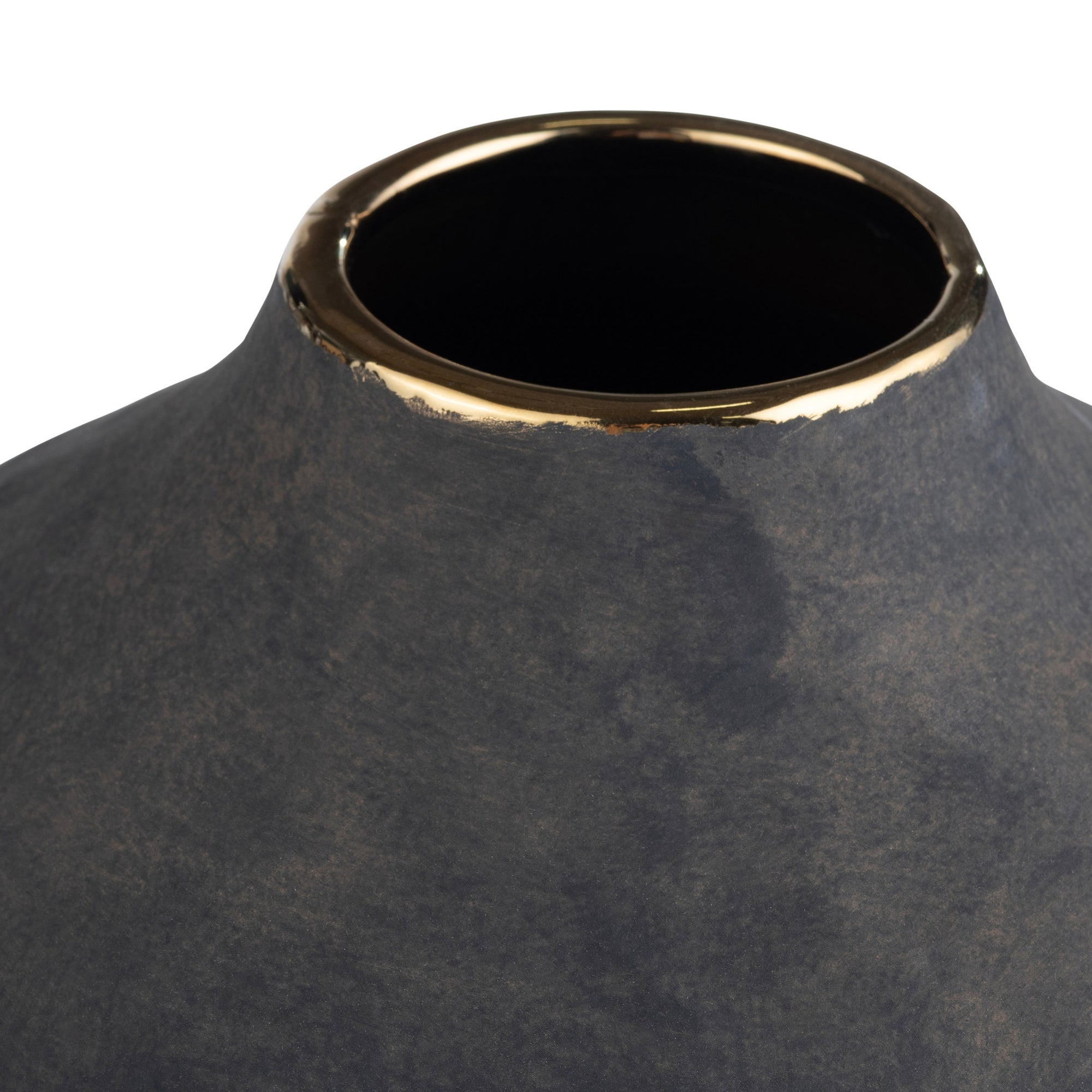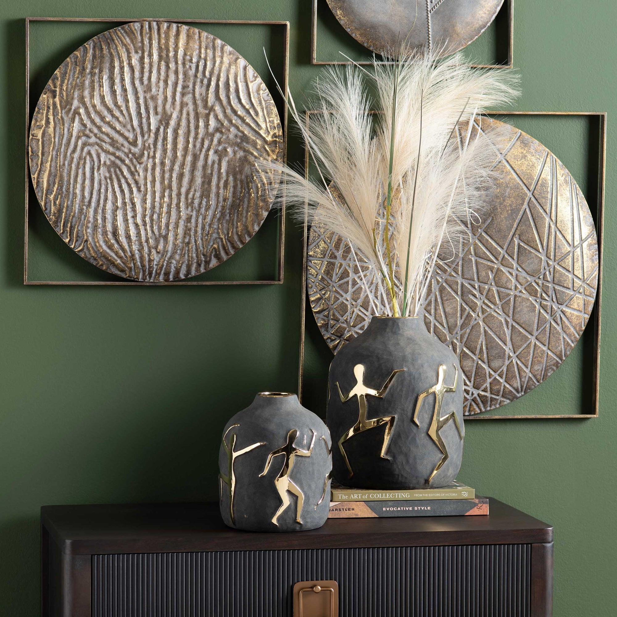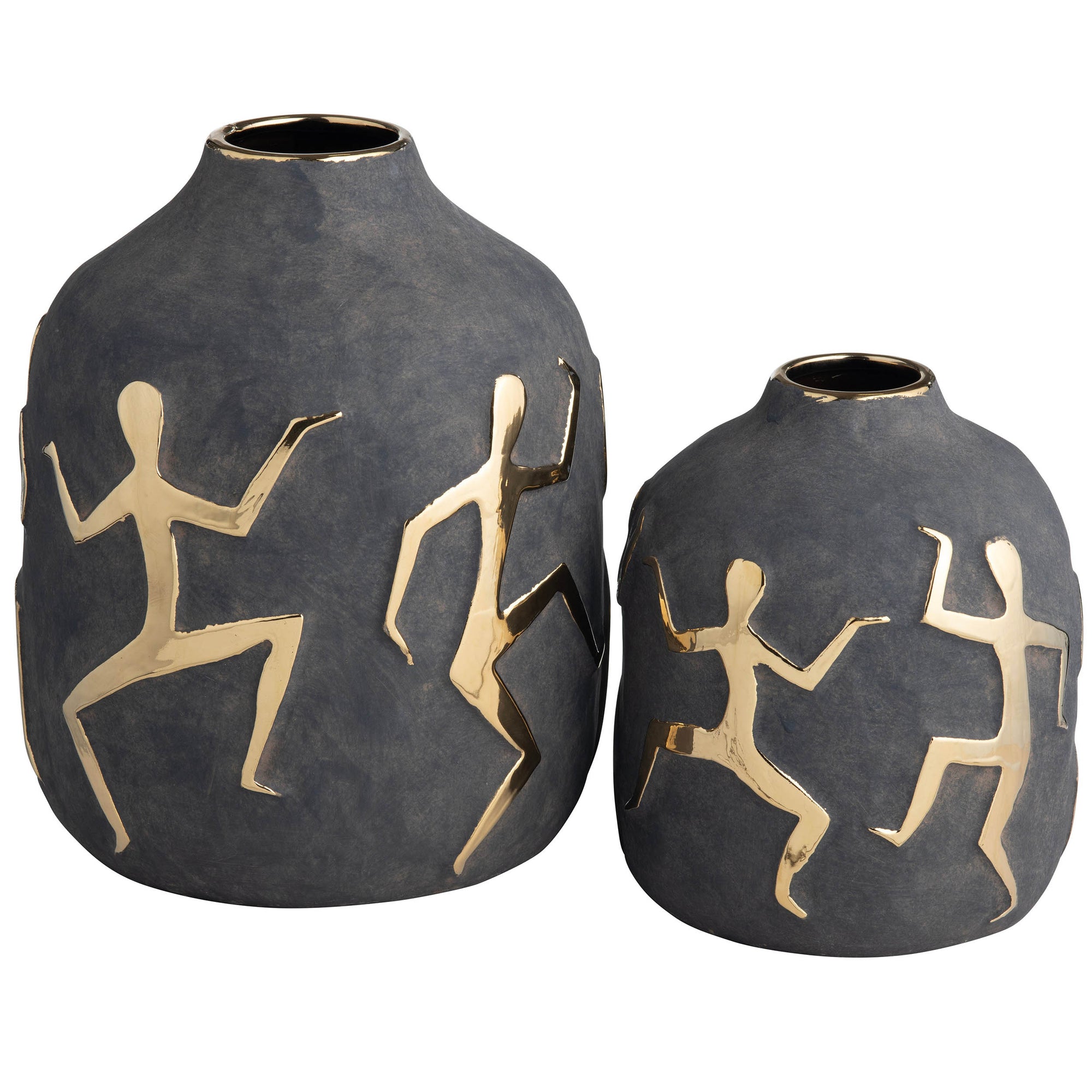 The Cruz Dancing Vases feature a ceramic design in grey with subtle gold accents. Perfect for transitional décor, these vases add a stylish and elegant touch to any tabletop, console, or shelf.