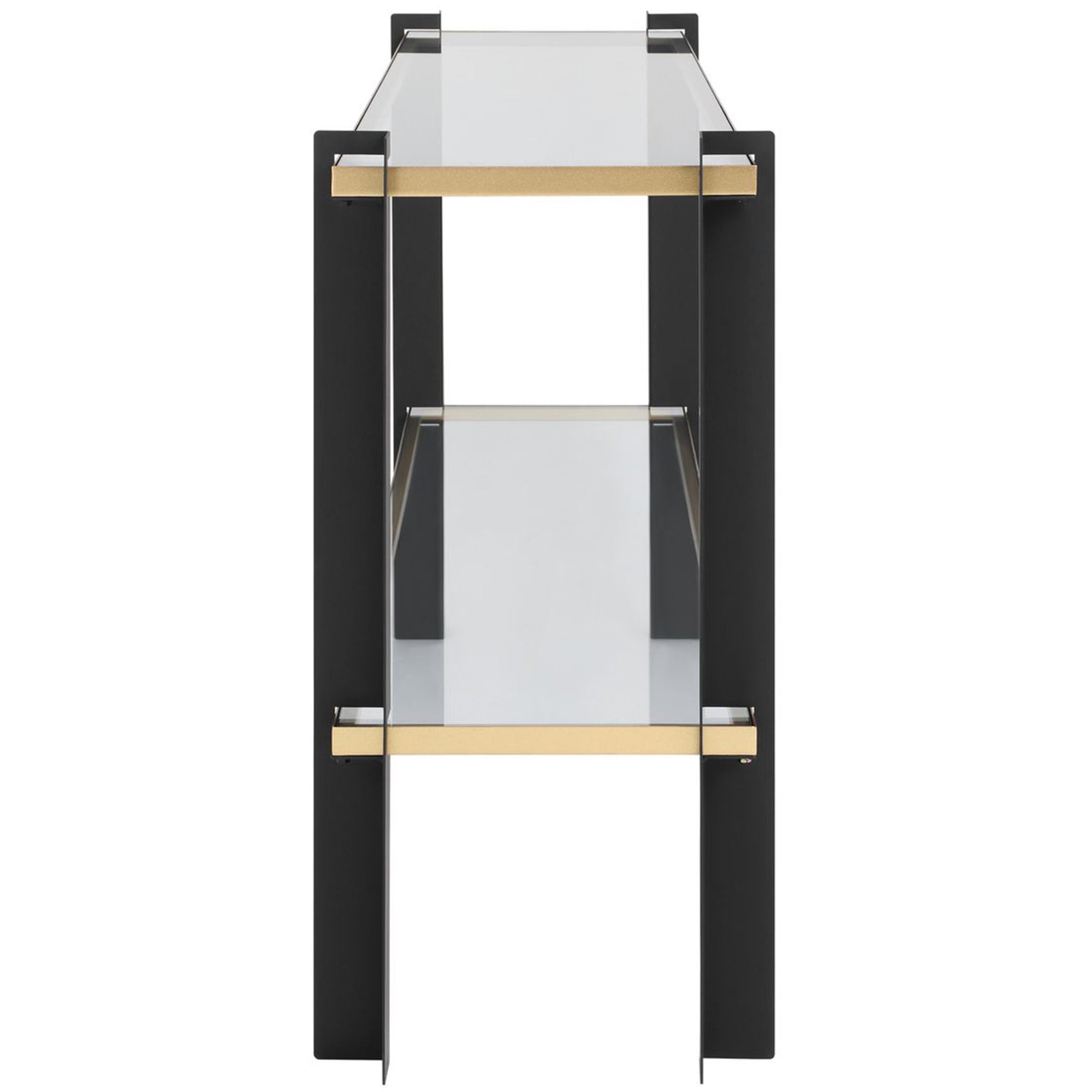 The Cunene Console Table is a contemporary piece composed of stylish iron legs finished in two-toned matte black and gold leaf. This elegant console table features both a top and a gallery shelf made of tempered clear glass, providing ample space for display. Its clean lines and mixed-material design make it a sophisticated addition to entryways or living areas, blending modern industrial elements with refined glamour.