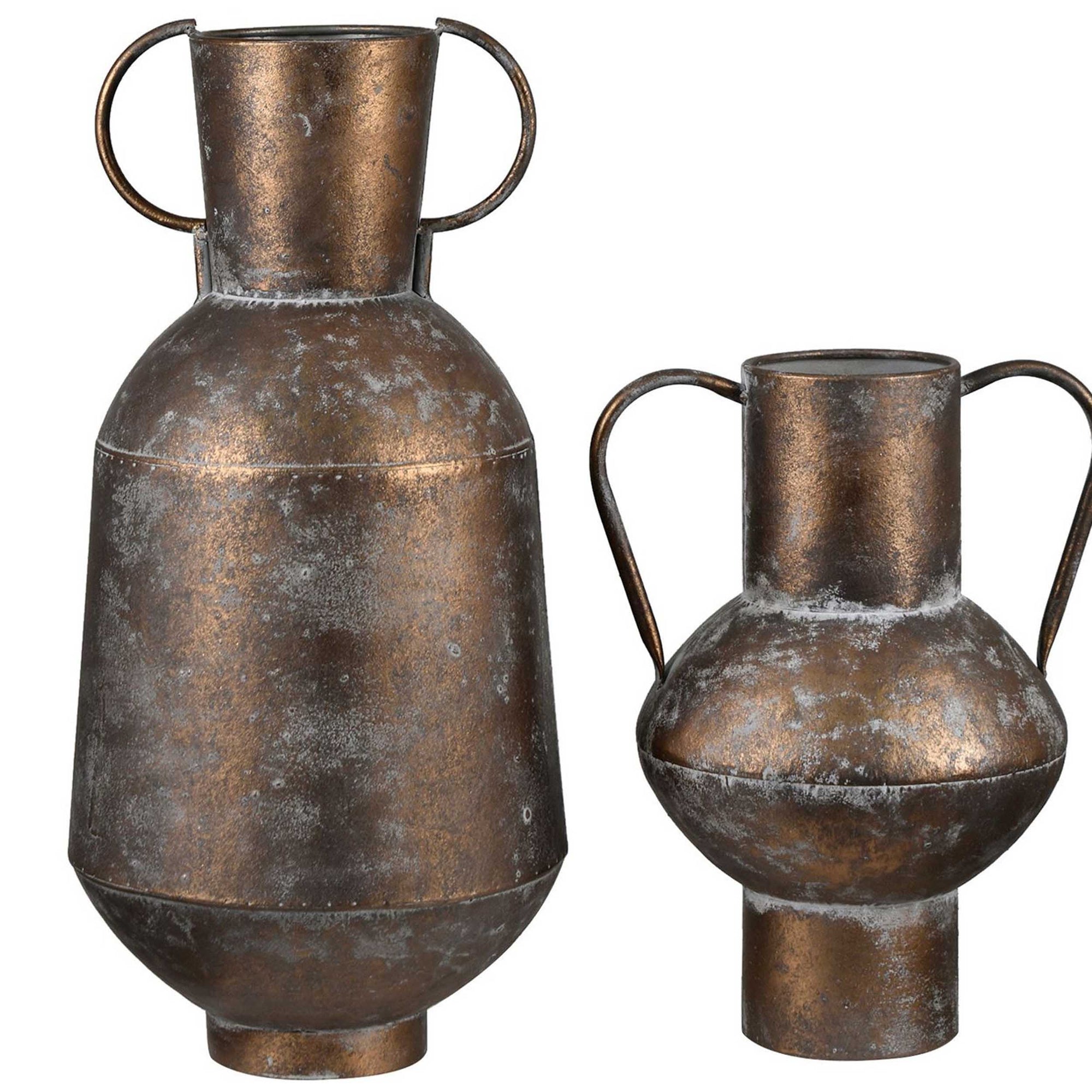The Davenport Vases feature a rustic design crafted from metal with a bronze finish. Perfect for adding a decorative accent to any tabletop, console, or shelf, these vases bring warmth and style to your space.