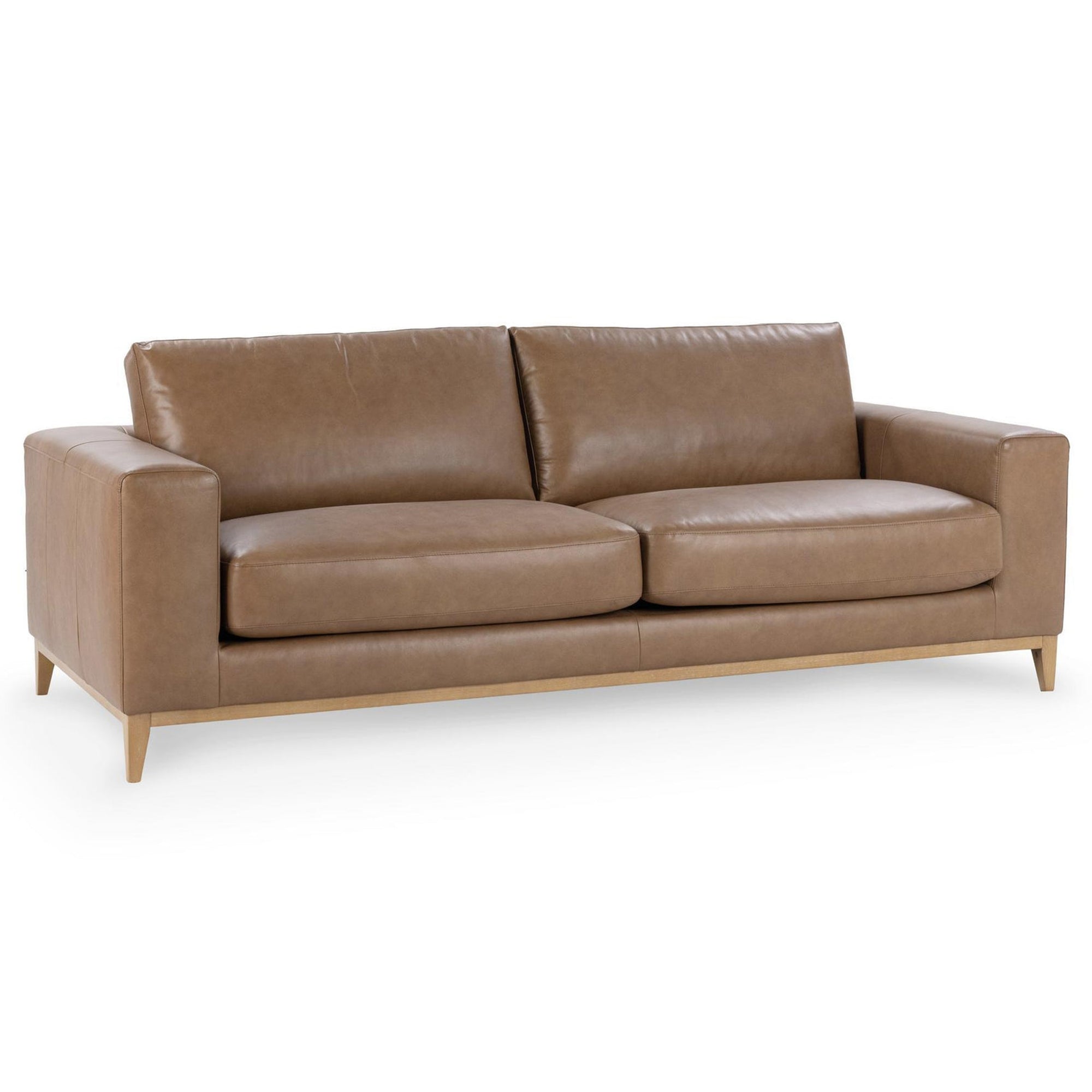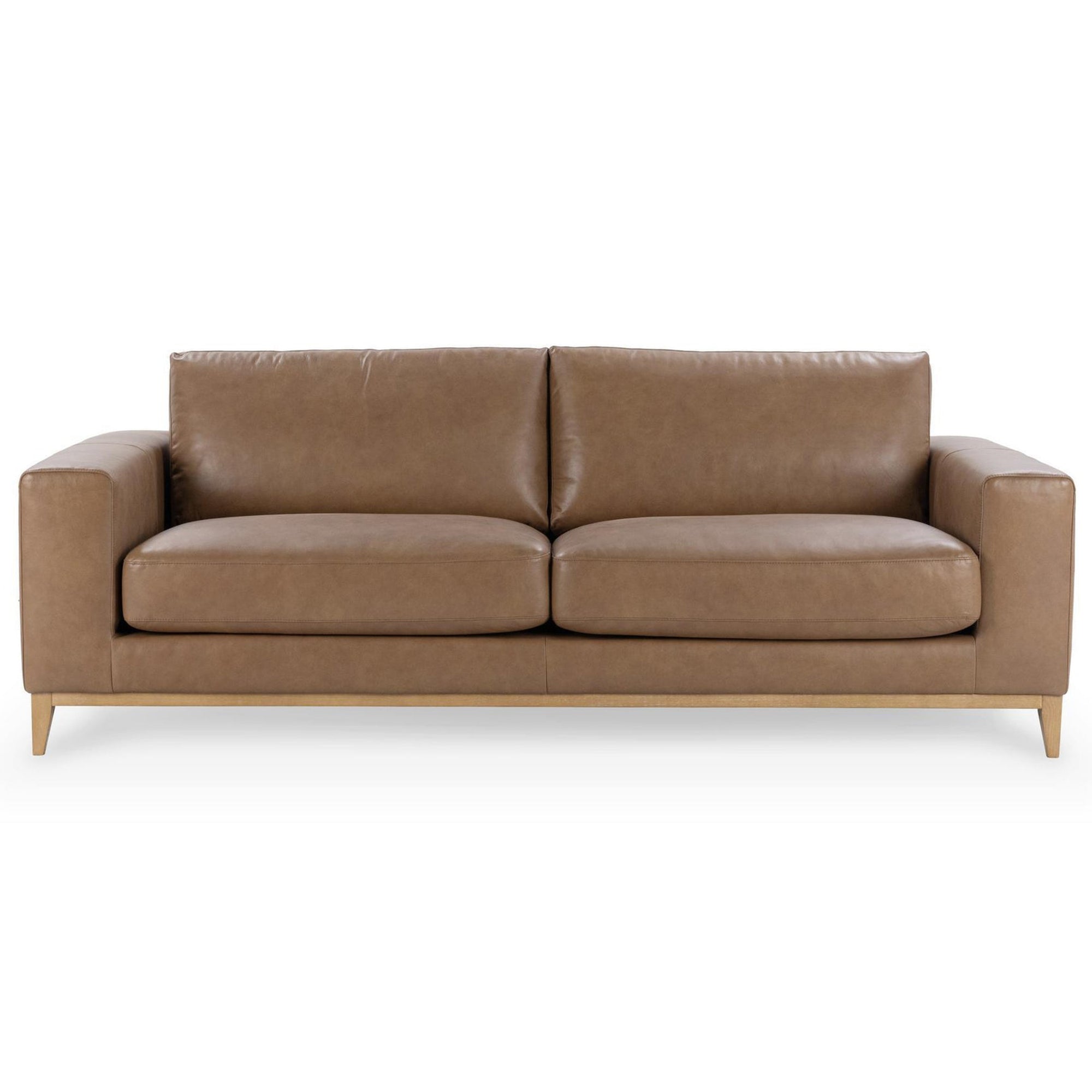 The Donovan Leather Sofa blends mid-century modern design with everyday comfort. Upholstered in premium top grain leather, it showcases clean lines, tapered wood legs, and plush cushions. The durable construction and sleek silhouette make it a standout piece, perfect for a contemporary, retro, or minimalist living room.