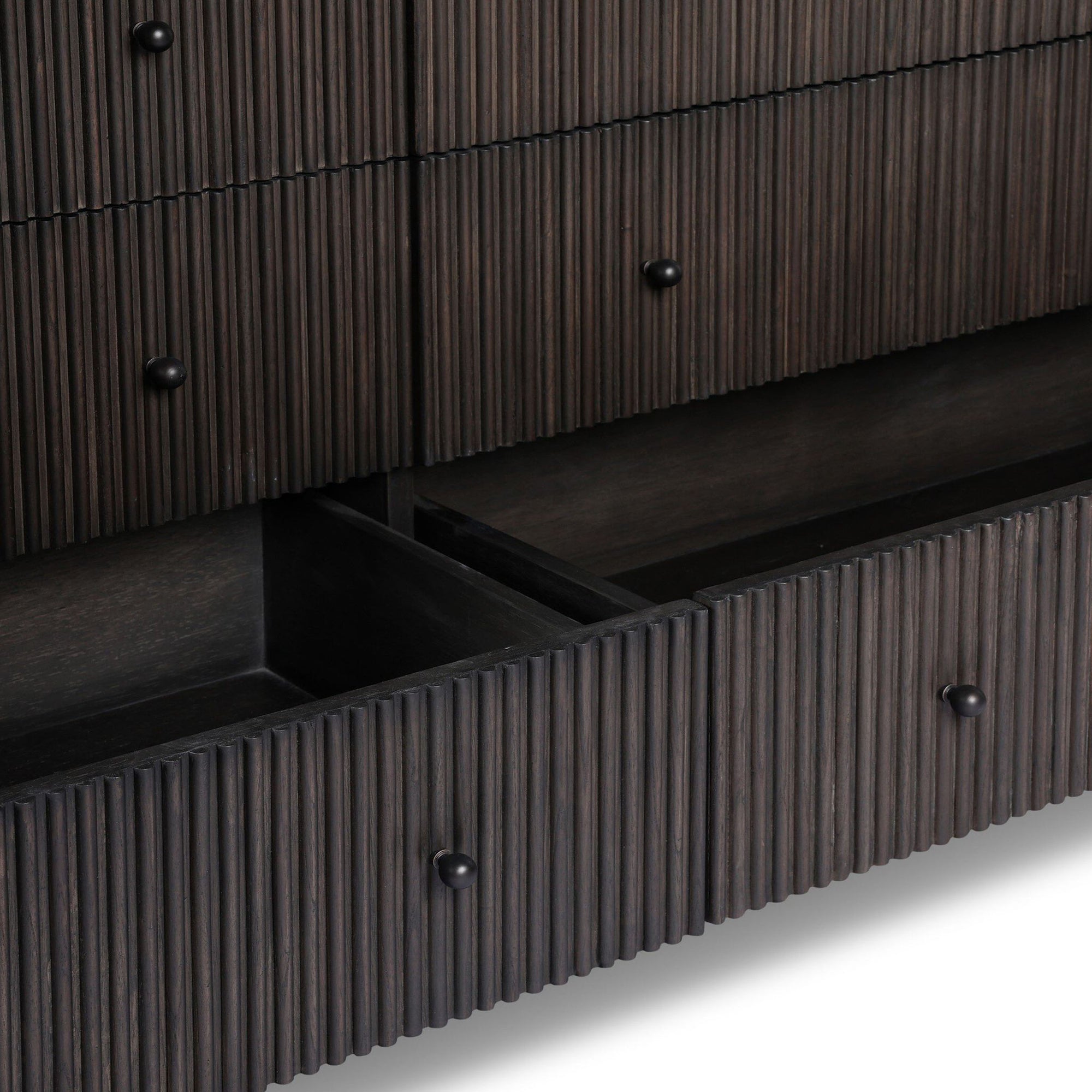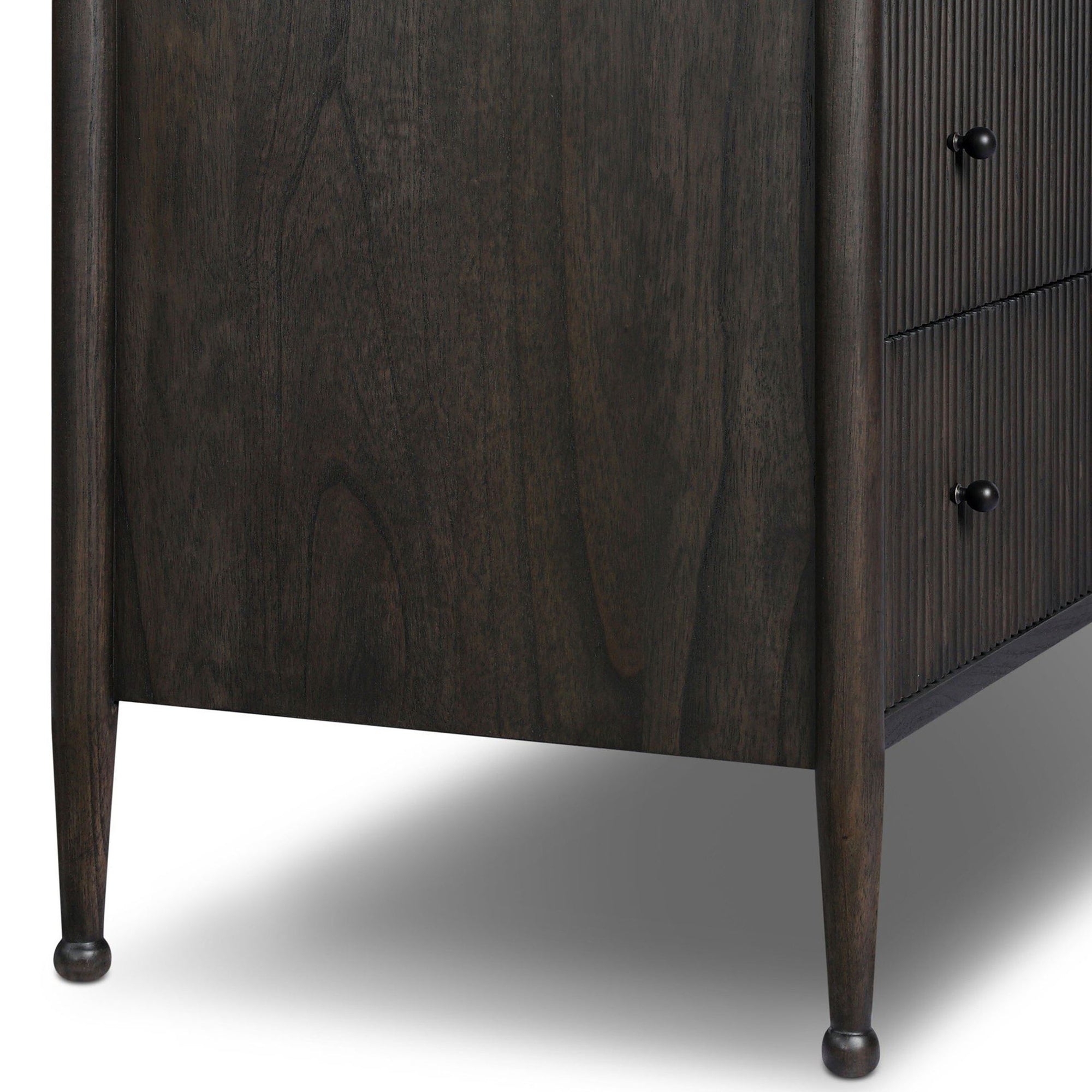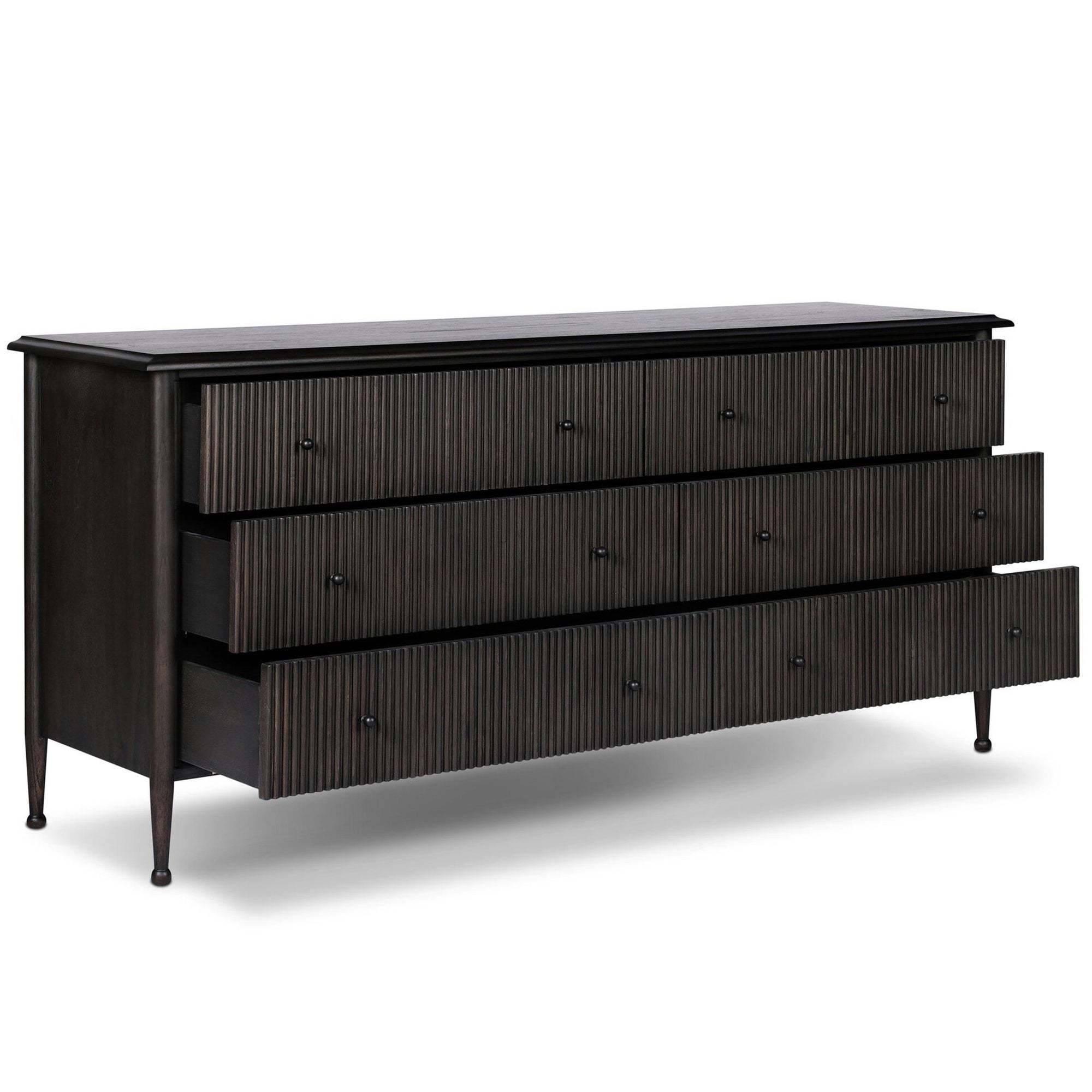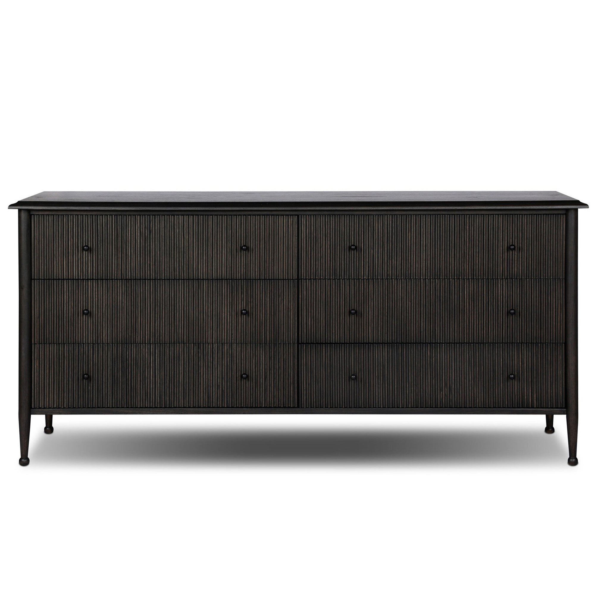 The Eloise 6 Drawer Dresser showcases rich, dark wood with a dimensional turn, featuring vertical reeded detailing across the fronts of its six spacious drawers. Slim, tapered legs lend lightness to this subtly architectural silhouette. This functional piece is a design collaboration by Amber Lewis and Four Hands, offering generous storage with elevated style.