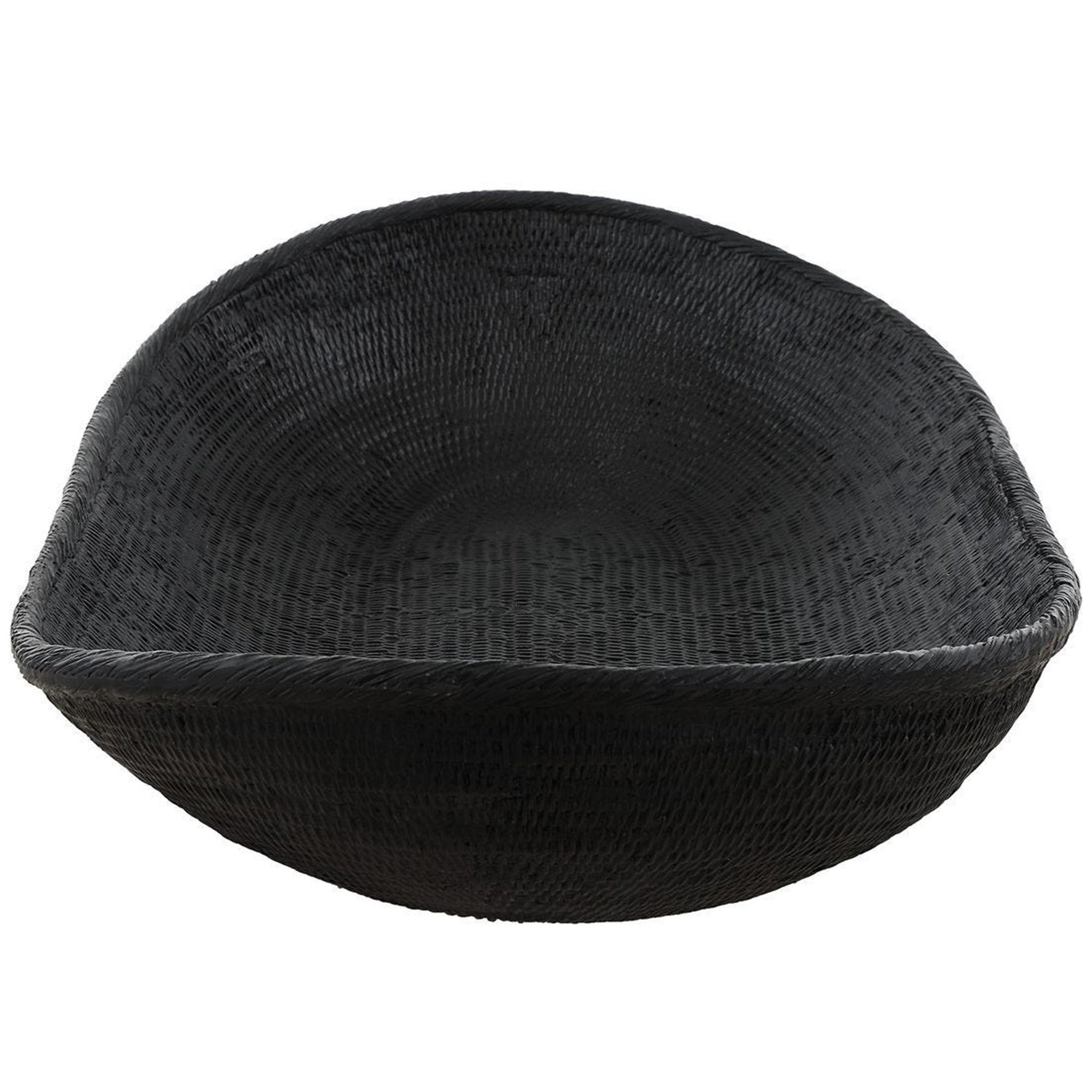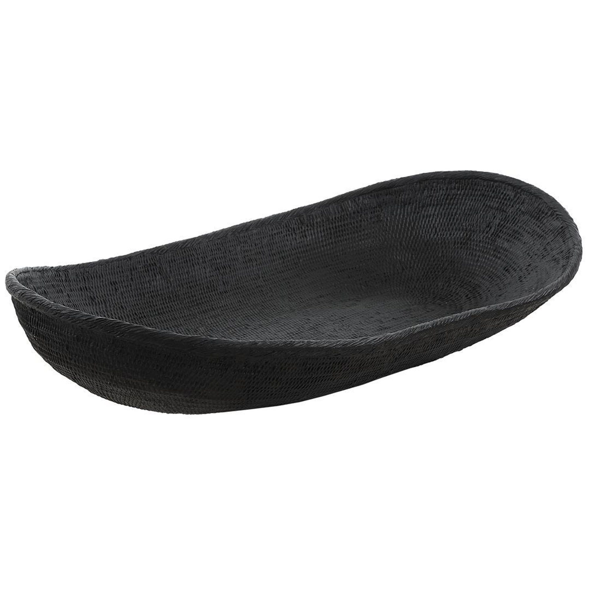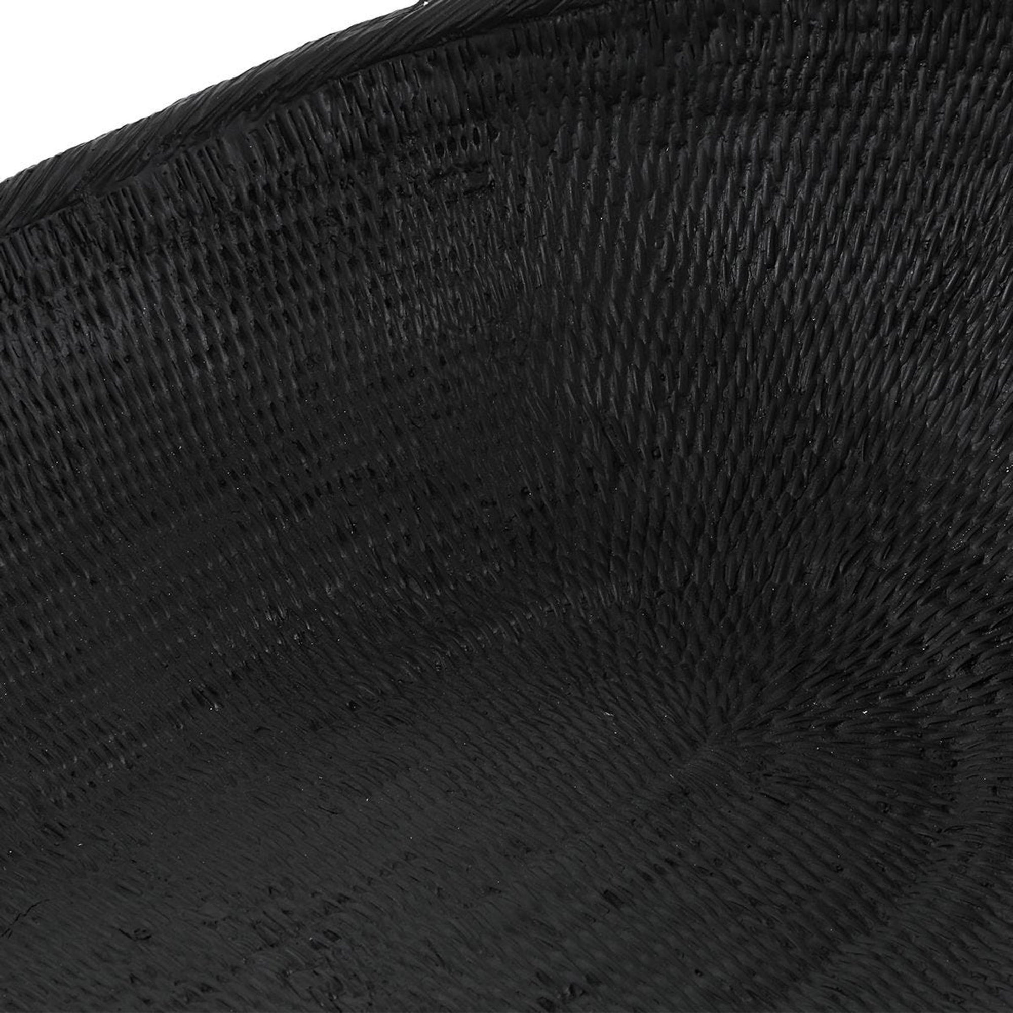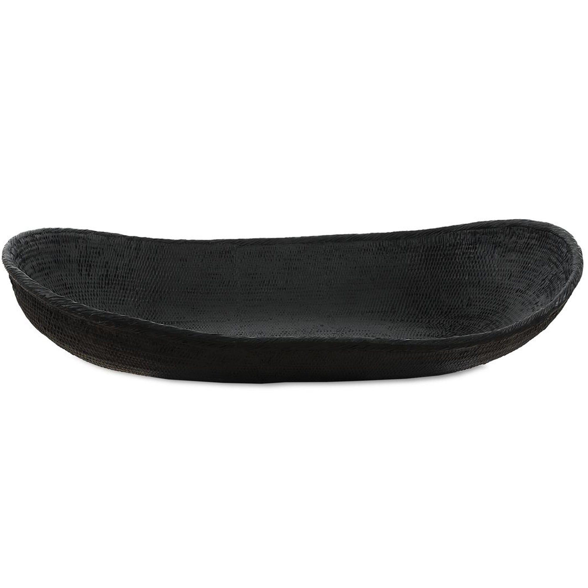 The Ember Bowl features a unique, elongated oblong shape with an abstract, curved profile. Its surface is meticulously detailed with a cast texture, resulting in a rich and dimensional black finish that serves as a sophisticated artful accent. Designed for versatility, this bowl is safe for outdoor use, though protection from freezing temperatures is recommended to preserve its finish. Whether placed on a console or an outdoor dining table, the Ember Bowl brings a modern, sculptural element to any setting.