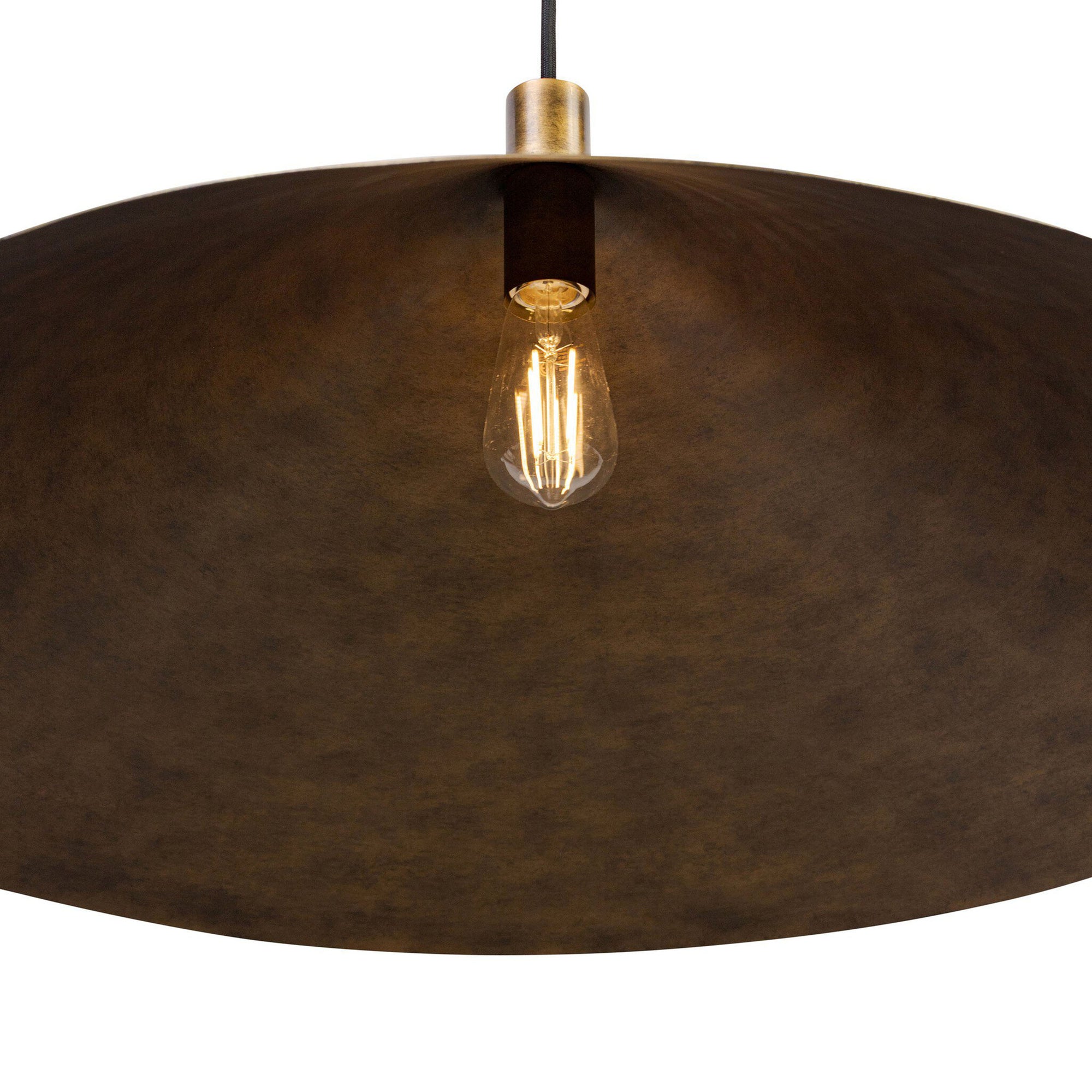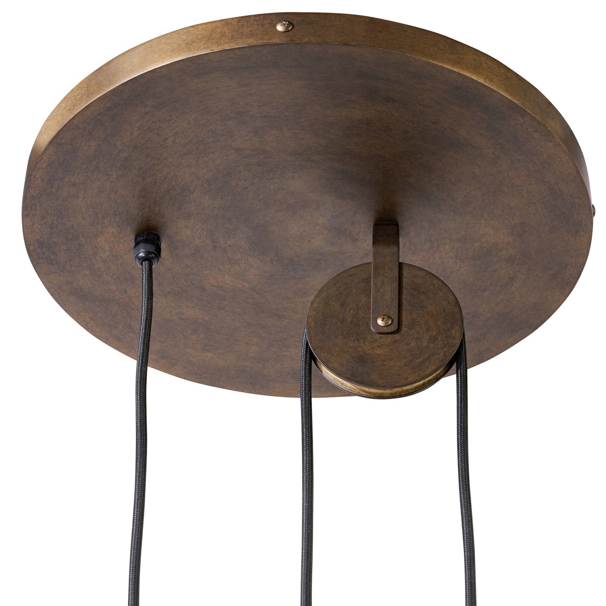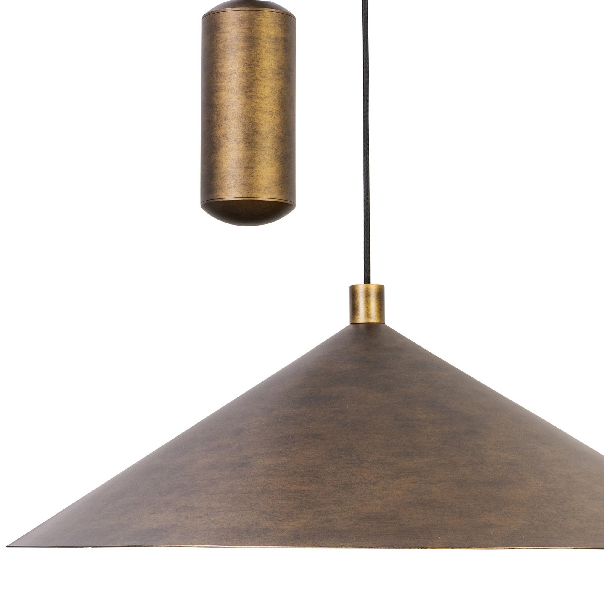 The Emeric Pendant offers a classic lift for a modern glow. Combining a traditional pulley system with modern lighting, this coolie shade pendant features an adjustable 13' of cord length, stabilized by a pill-shaped counterweight crafted from burnished brass spun metal. This hardwired pendant is dry-rated and dimmer switch compatible.