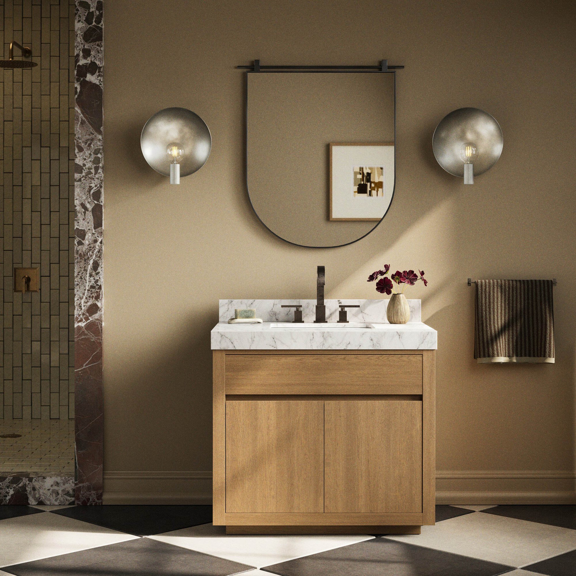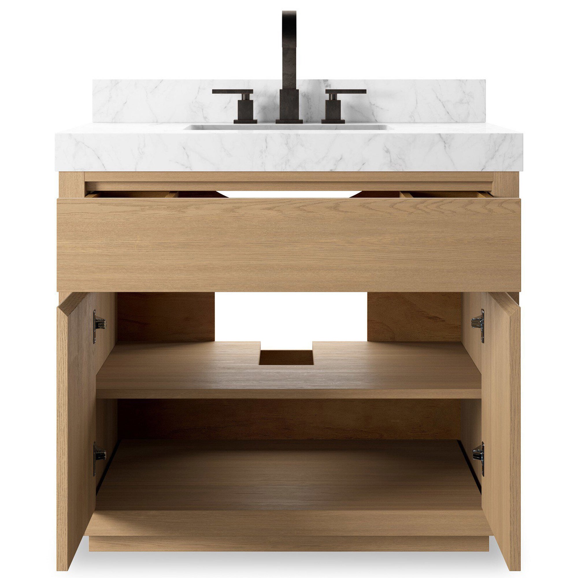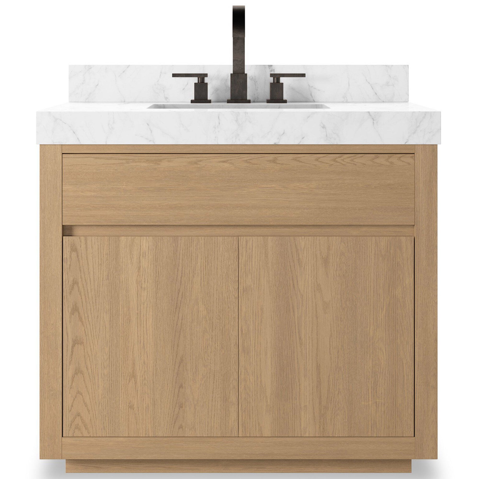 The Everett Single Vanity is set up to bring serenity and high function to the modern bathroom. Topped with a substantial Carrara marble top and an oak base, this versatile piece easily updates both modern and traditional spaces. It is finished with a bath-safe sealant for moisture resistance. Sink and backsplash are included (backsplash ships separately). The vanity is designed with a removable back with cutouts for plumbing, fitting standard P-traps. Faucet shown is not included, and professional installation is required.