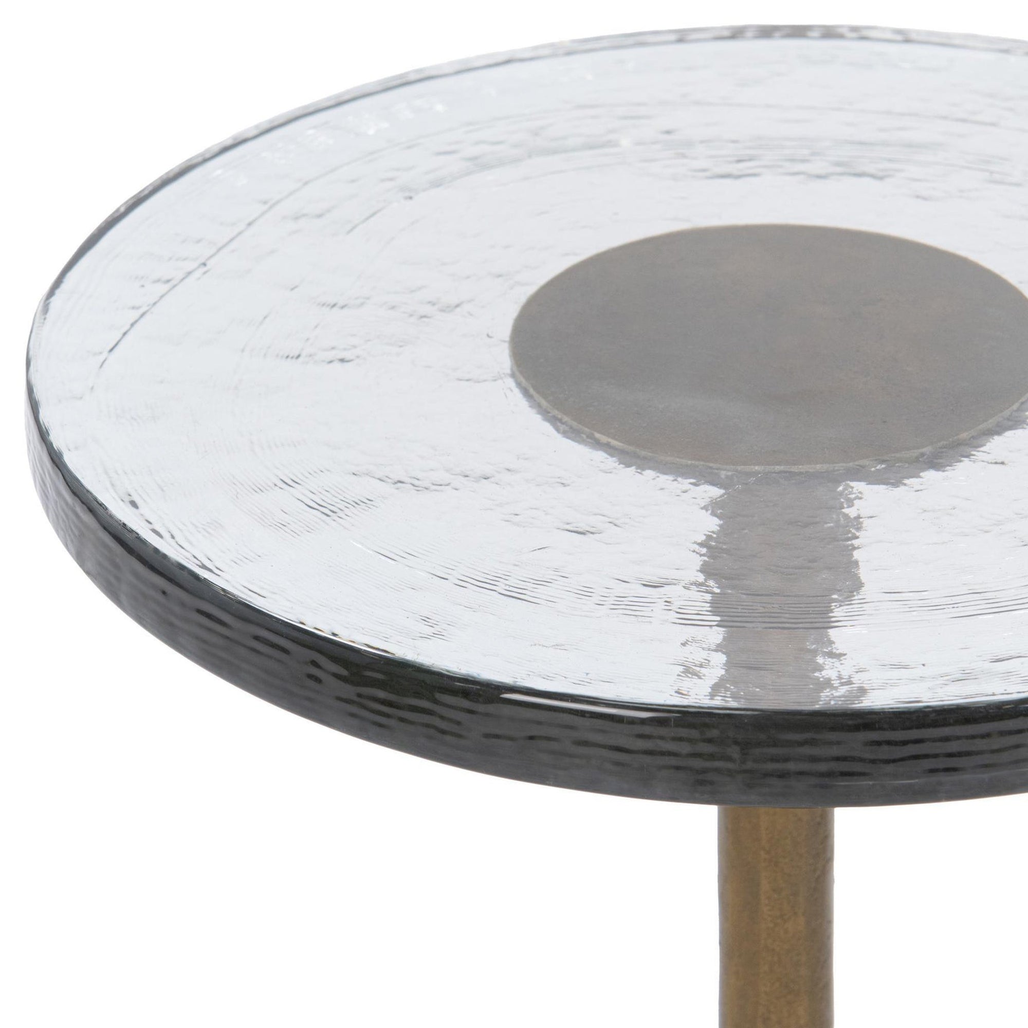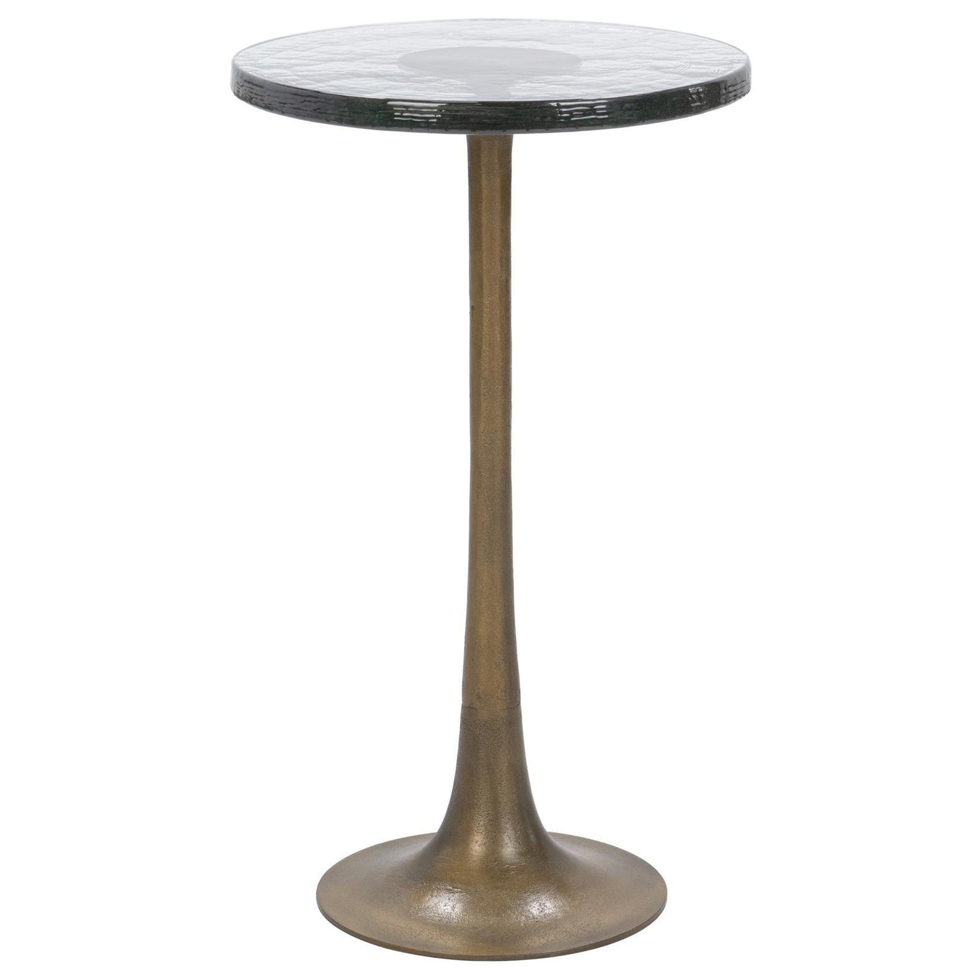 The Fabiana Round Accent Table features a cast aluminum pedestal base topped with a thick cast glass surface. Its elegant silhouette and antique gold tone bring a refined yet contemporary edge to any setting. Perfect as a side table or statement accent in modern living rooms, bedrooms, or entryways, this table blends sculptural form with functional sophistication.