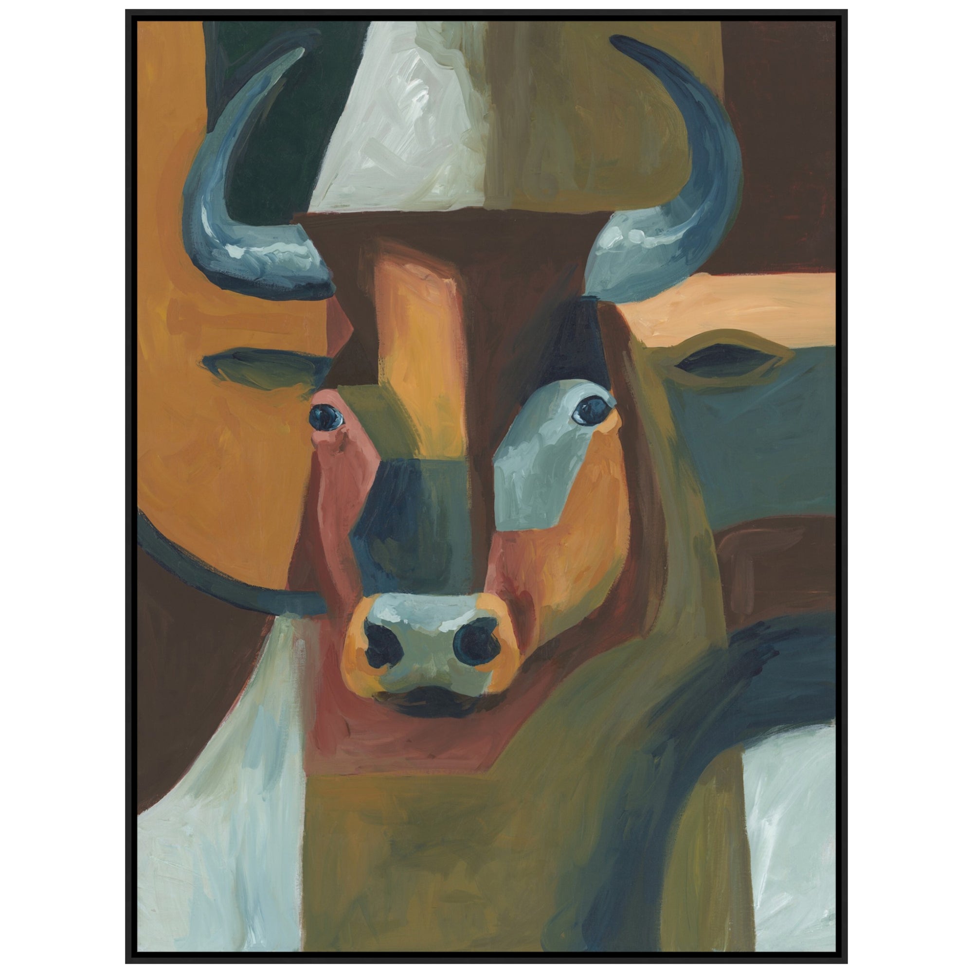 The Fernando Framed artwork by Kathy Mann is a bold, abstract interpretation of a bull's portrait using a striking color-block technique. The artist employs geometric shapes and a warm, rich palette of browns, golds, and unexpected blues to capture the animal's strong character. The image brush gel finish adds texture and depth, while the sleek poly black float frame provides a contemporary edge. This piece is a powerful, modern statement for any space that needs a touch of artistic flair and energy.
