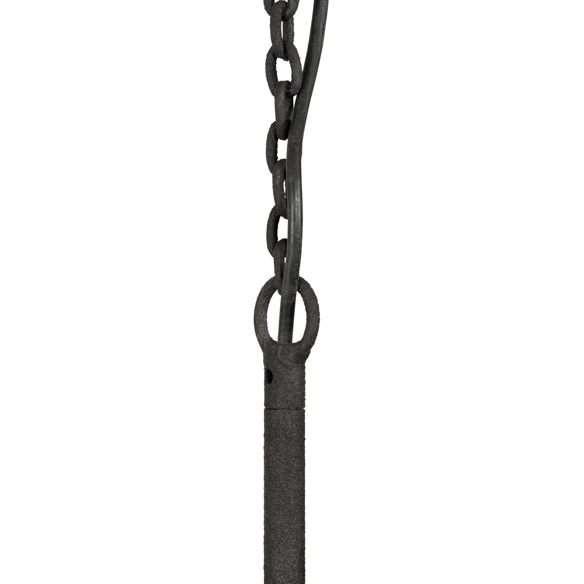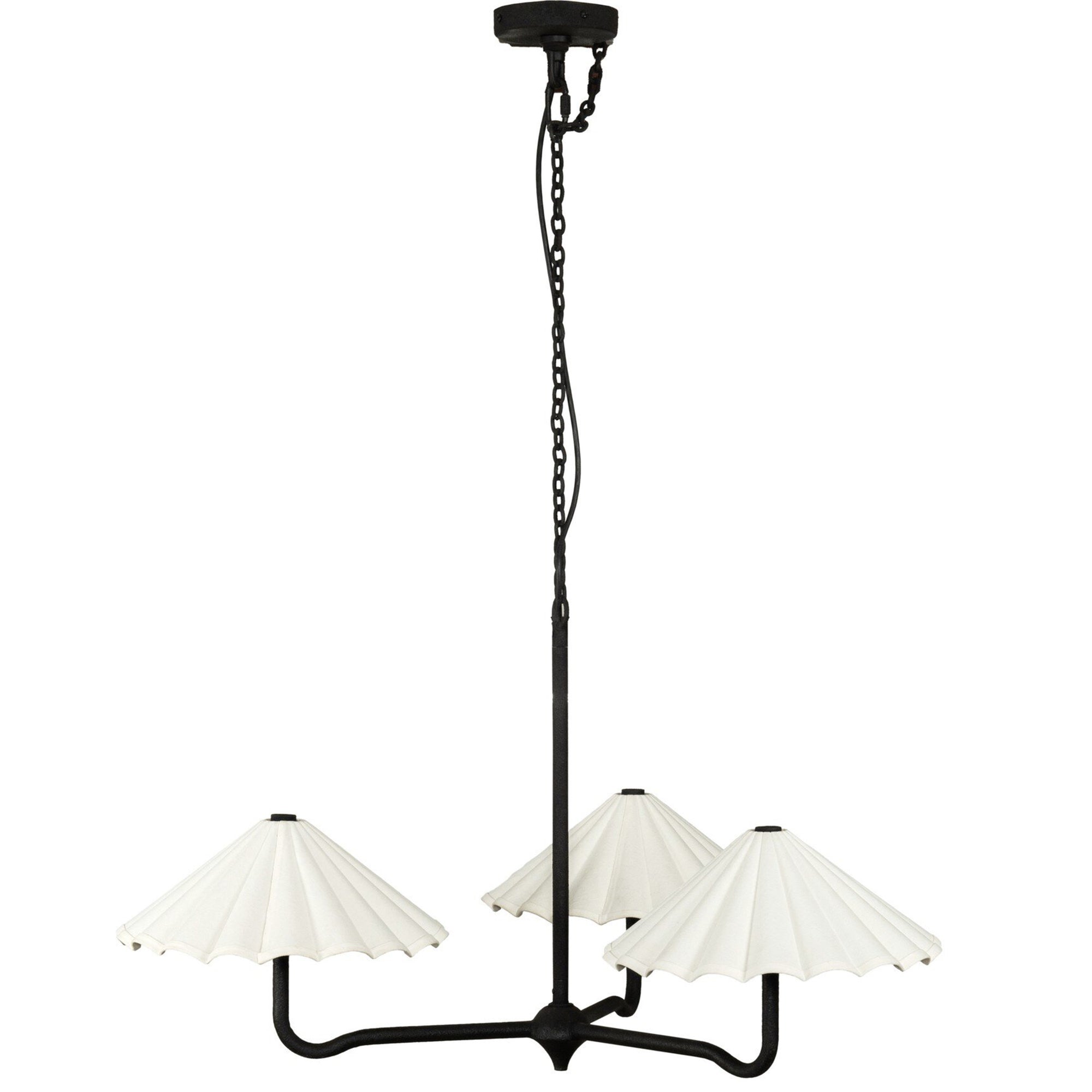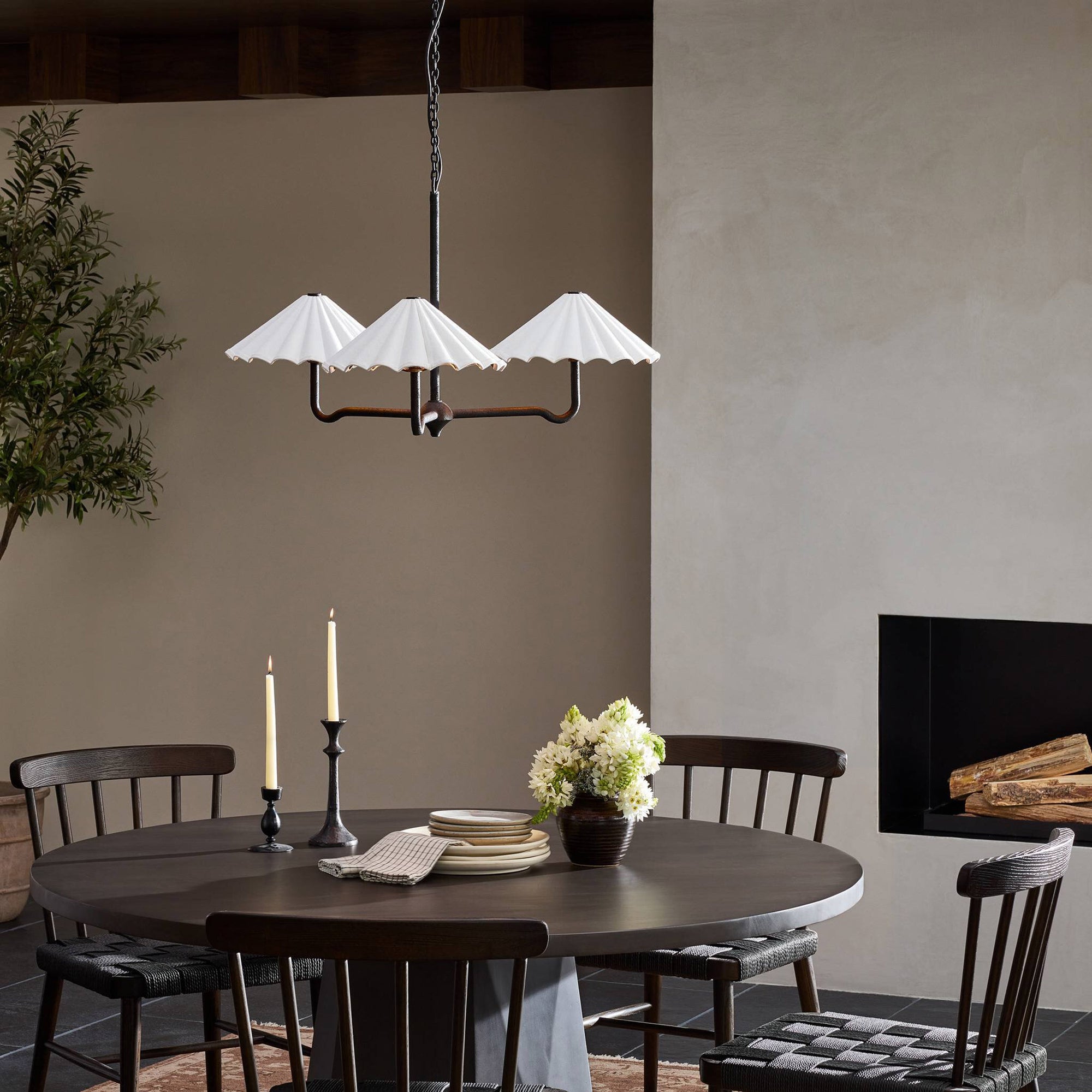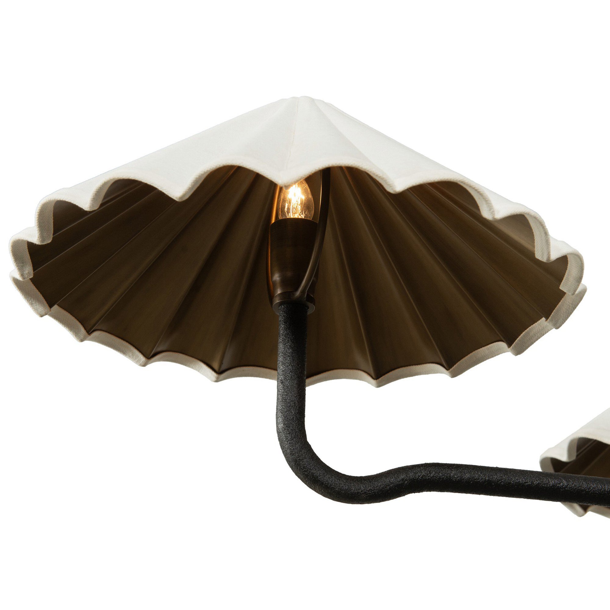 The Fiorella Chandelier features a stunning combination of textures and contrasting hues for a dramatic glow. Scalloped shades with a dark exterior and antiqued brass interior are paired with a wrought iron chain, creating a striking centerpiece perfect for any dining or living space. Adjustable height allows for versatile installation on standard or sloped ceilings.
