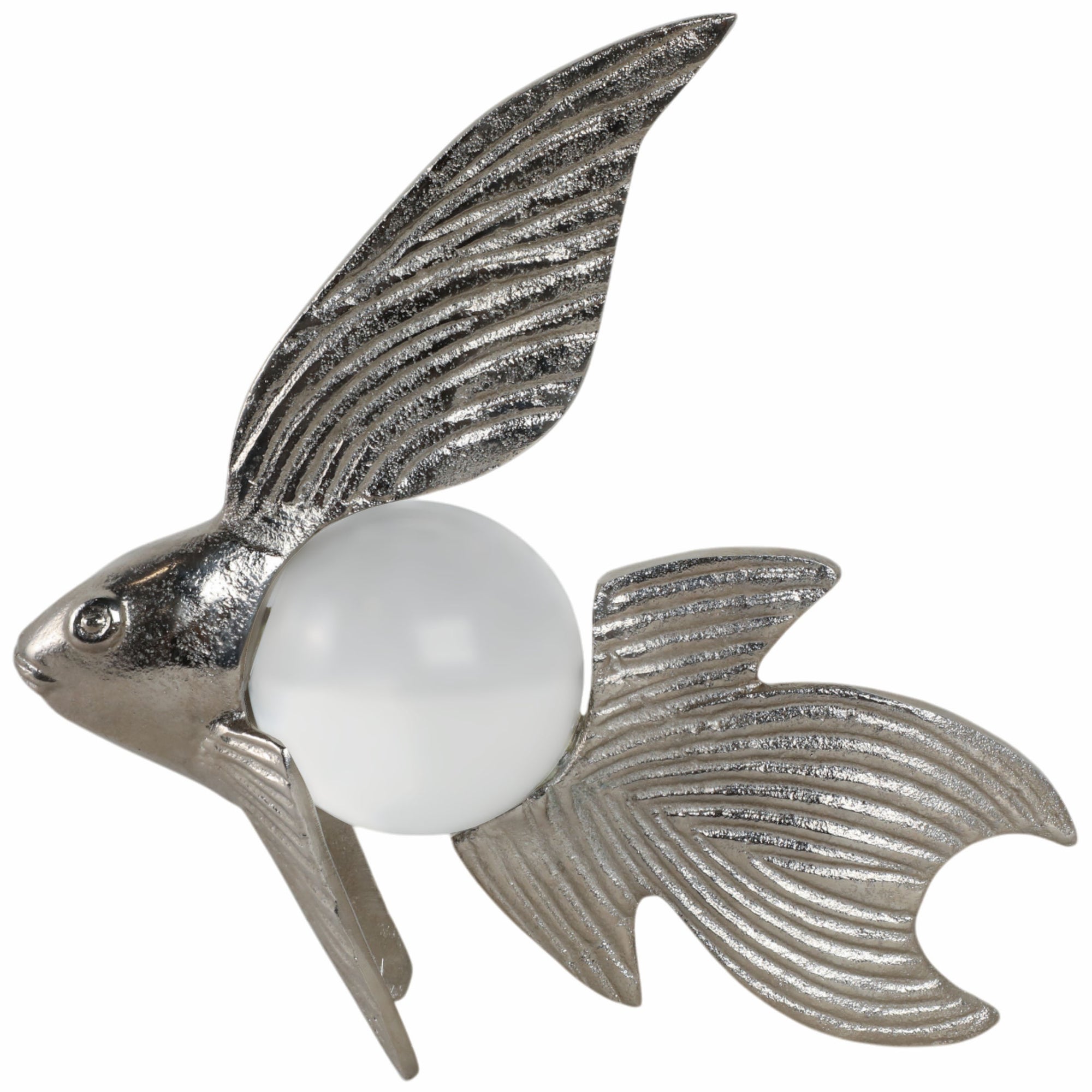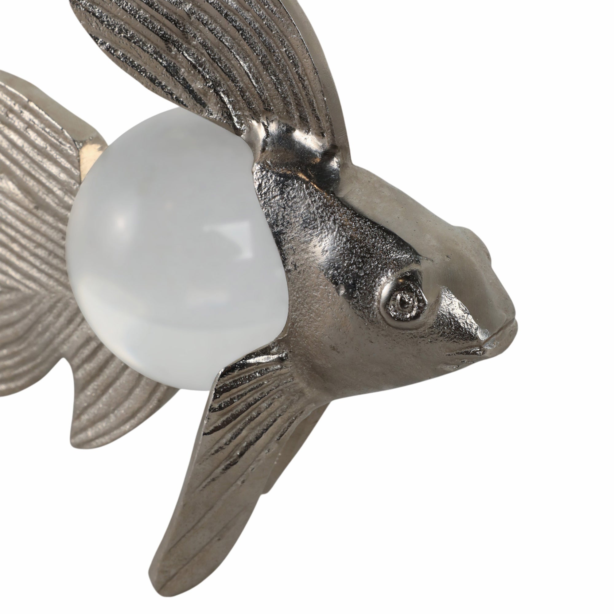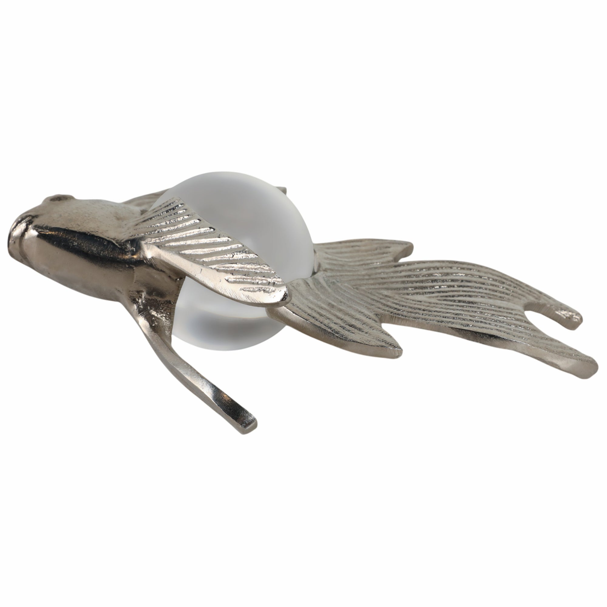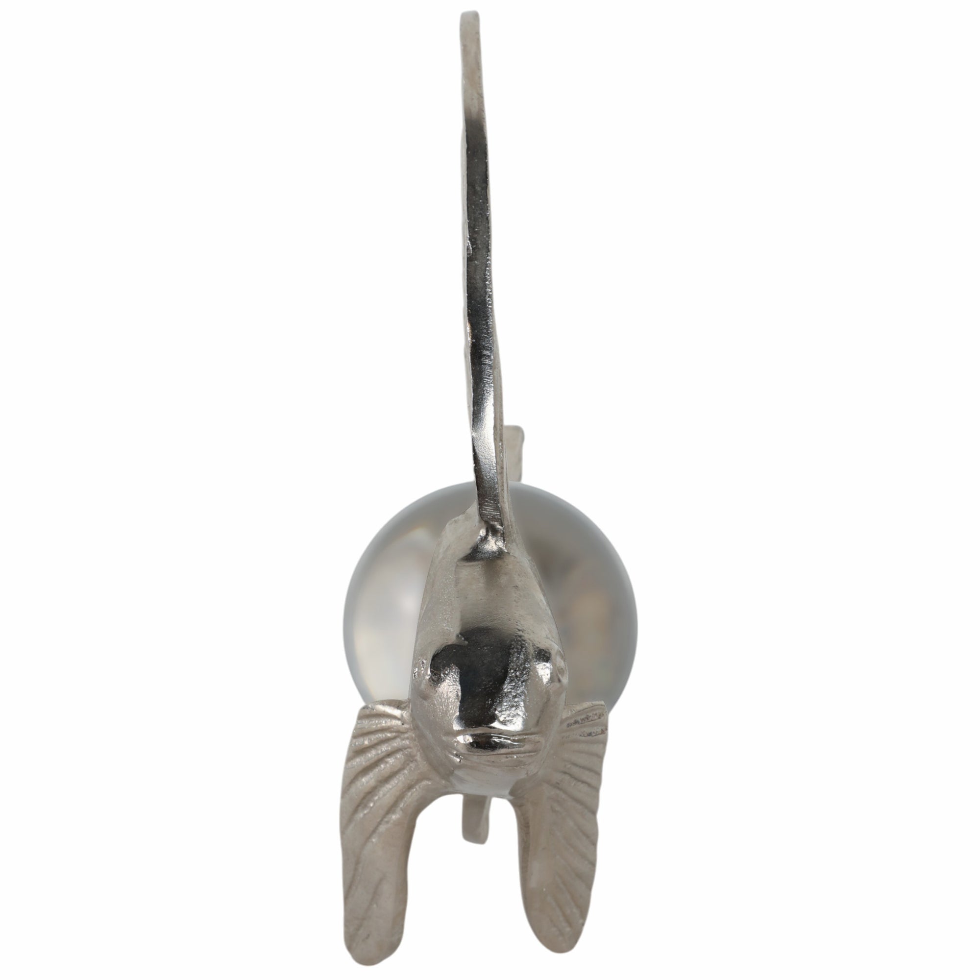Bring a splash of coastal elegance to your space with this stunning silver fish figurine. Expertly crafted from a harmonious blend of metal, aluminum, glass, and acrylic for durability and modern appeal. The Fish is the perfect accent for coastal or modern decor and it fits beautifully on desks, shelves, nightstands, etc.