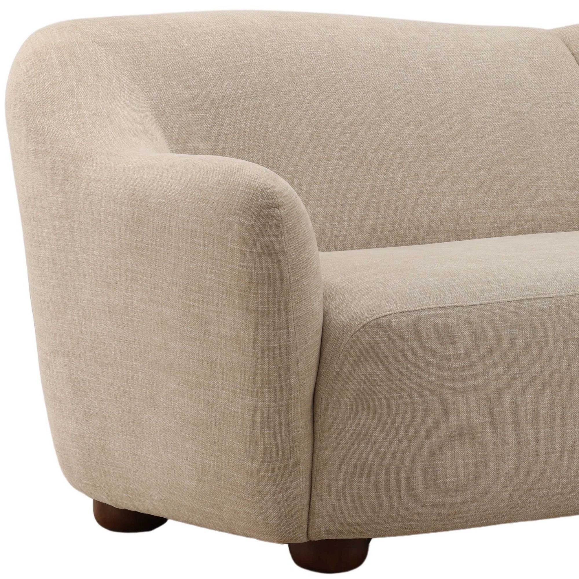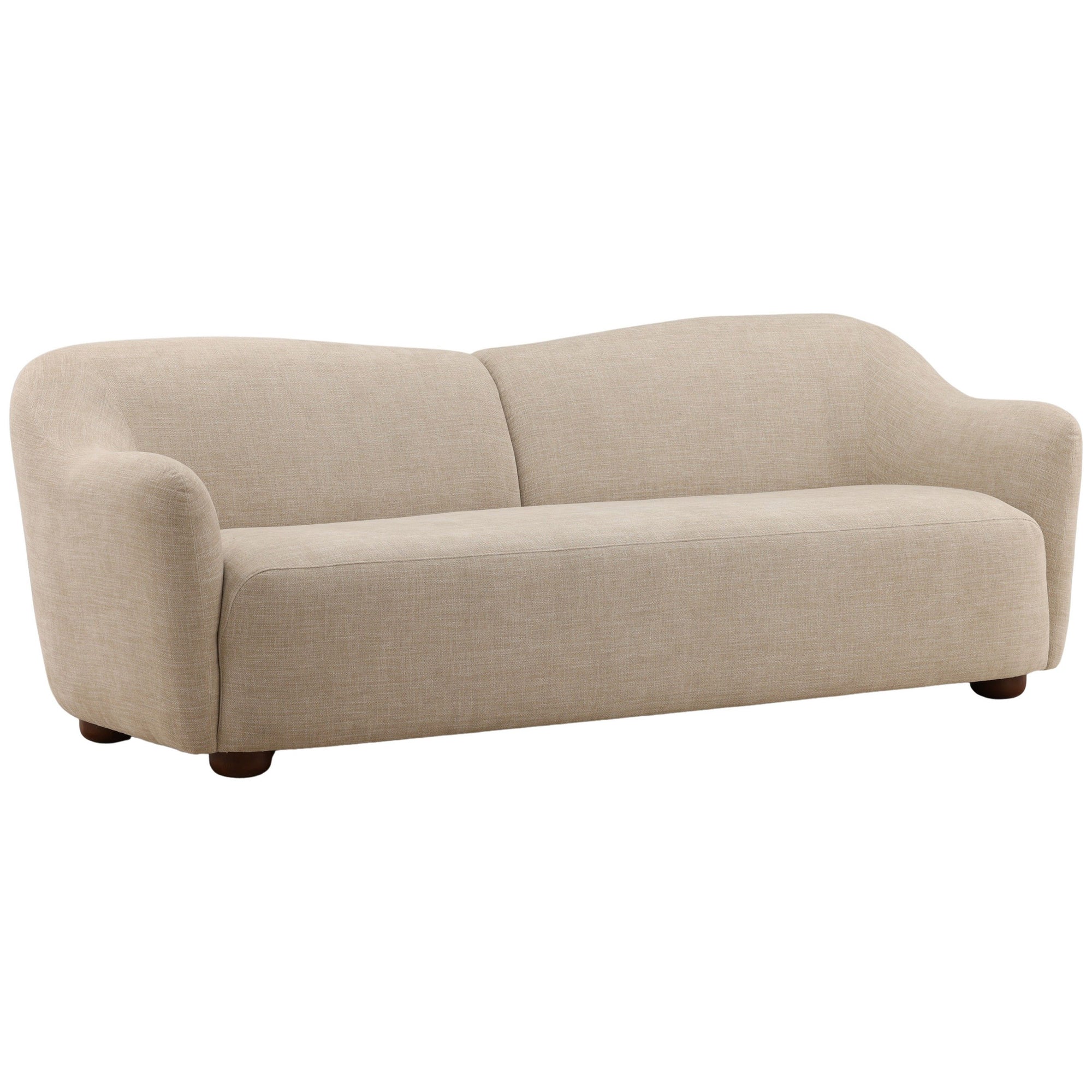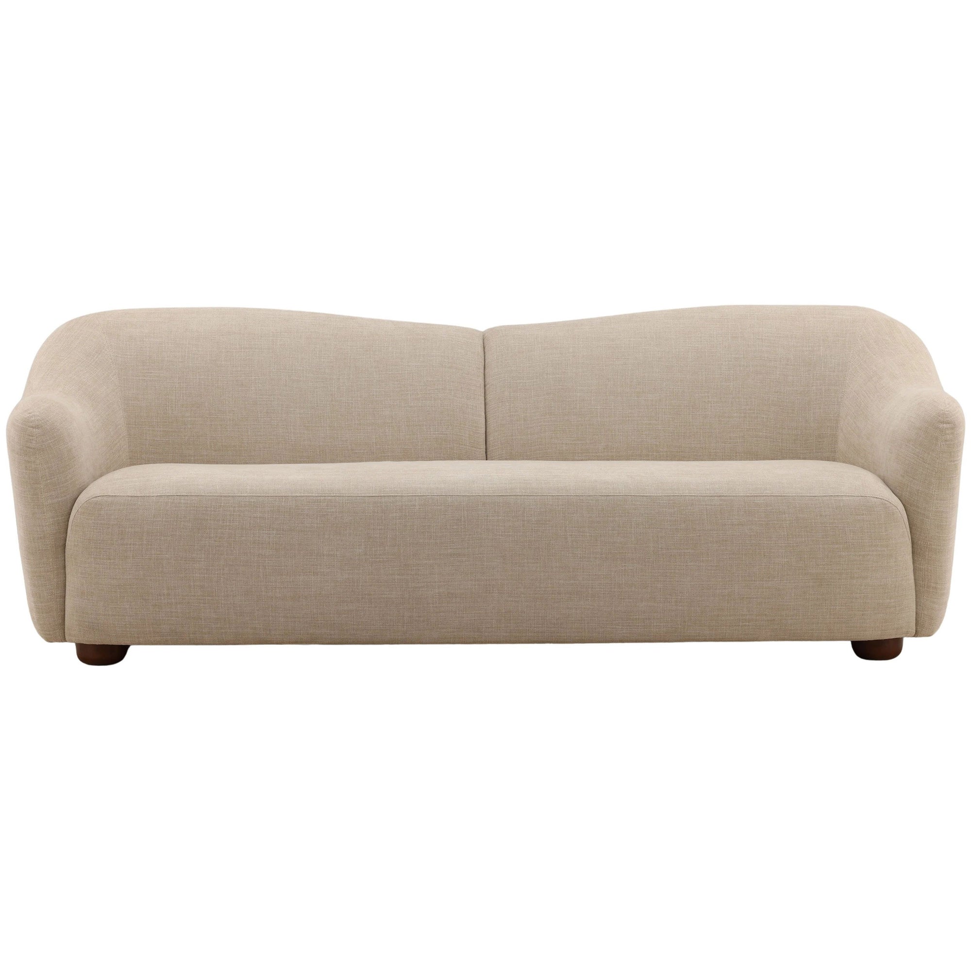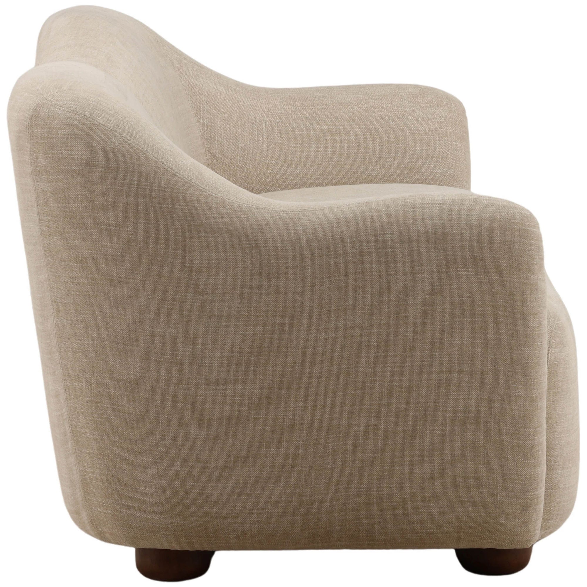 The Francesca Sofa blends mid-century charm with modern comfort. Upholstered in two-tone basketweave fabric, this sofa features a warm ochre hue complemented by a dark brown rubber wood base. Its plush cushions and clean lines create a timeless look that’s both inviting and sophisticated.