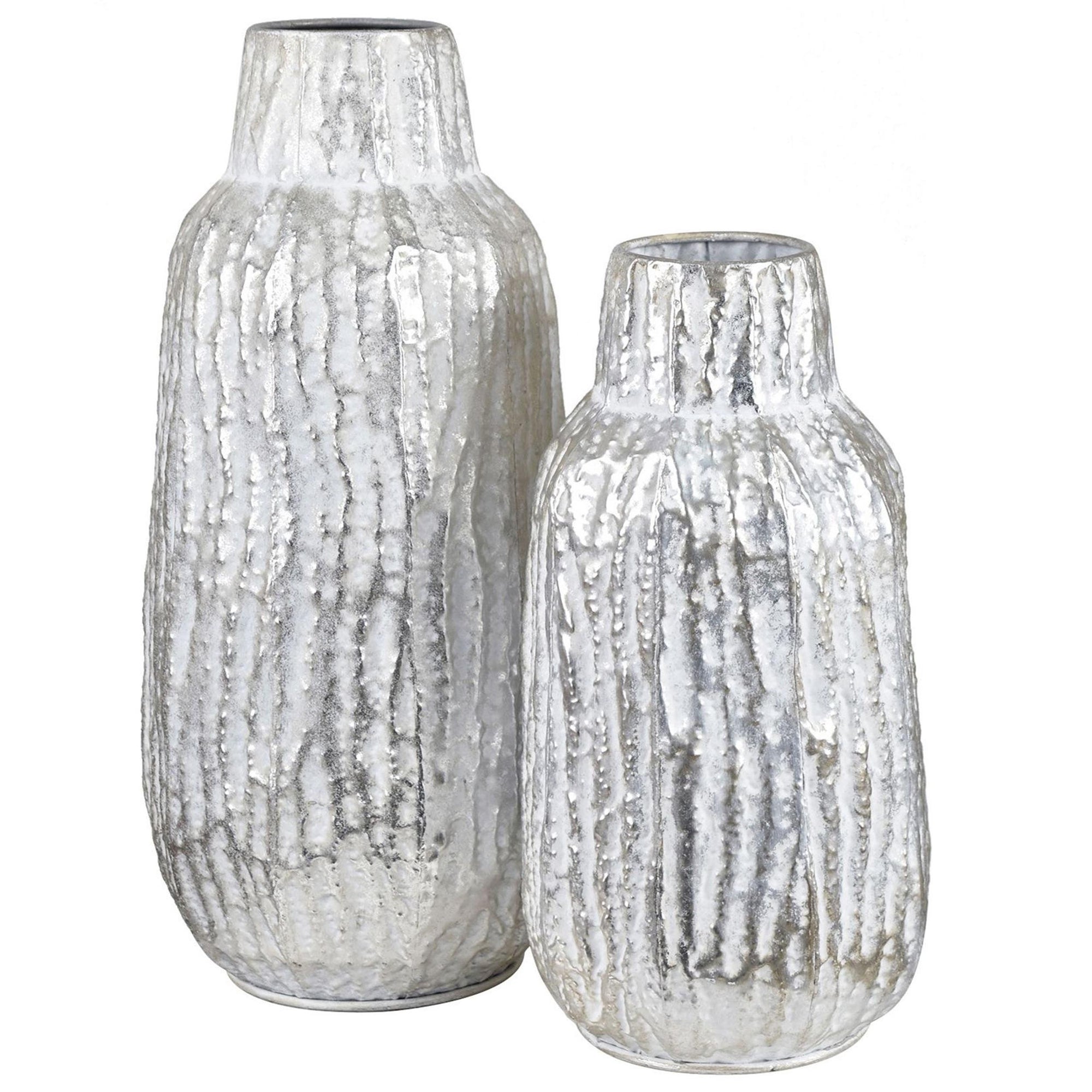 The Maddox Vases are transitional-style metal vases with a whitewashed finish and embossed detailing. Perfect for displaying flowers or greenery, they add elegance and sophistication to any tabletop or decorative space.