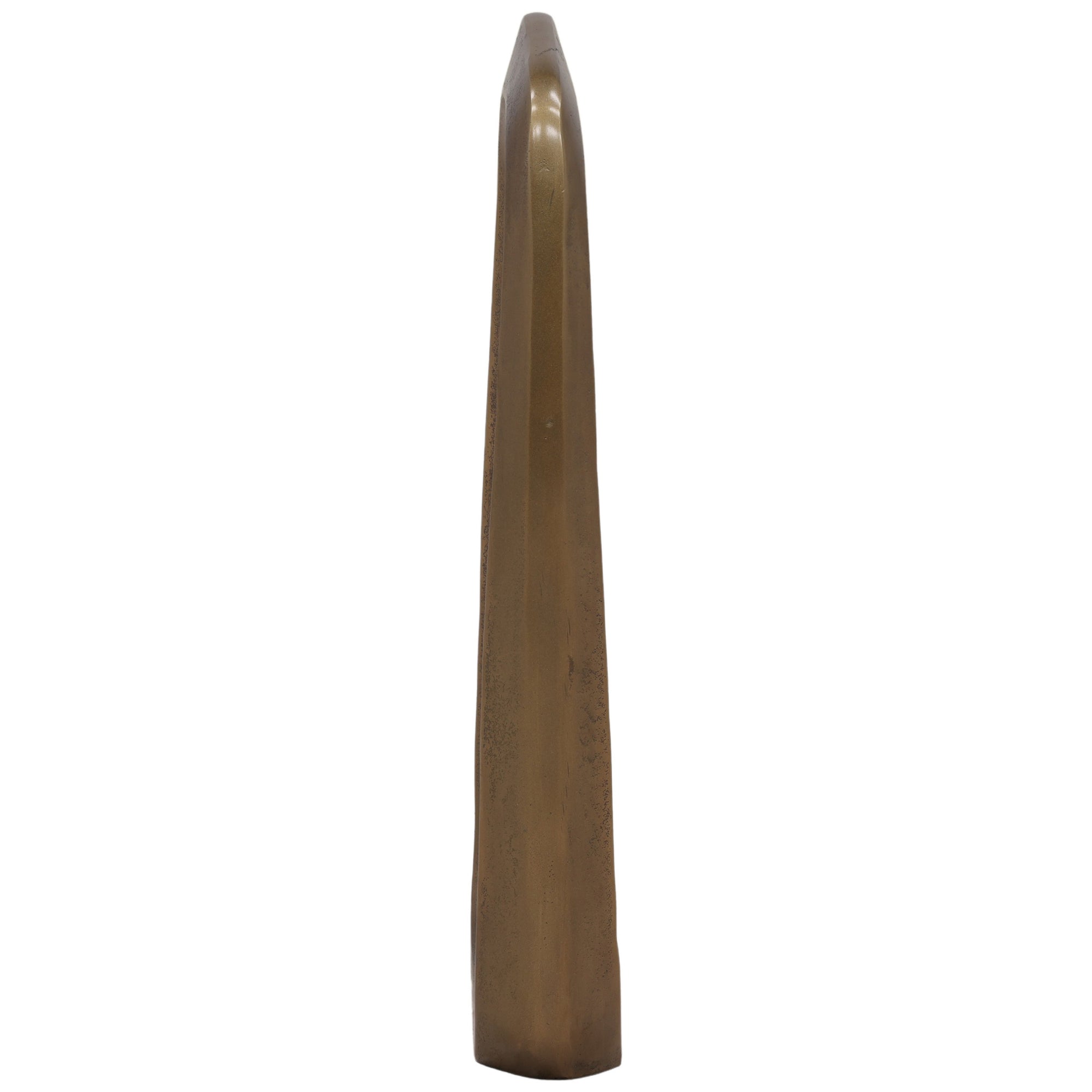 The Garen Sculpture features a sleek aluminum design with an antique brass finish. Its modern vertical silhouette adds a striking metallic accent to shelves, mantels, or tabletops.
