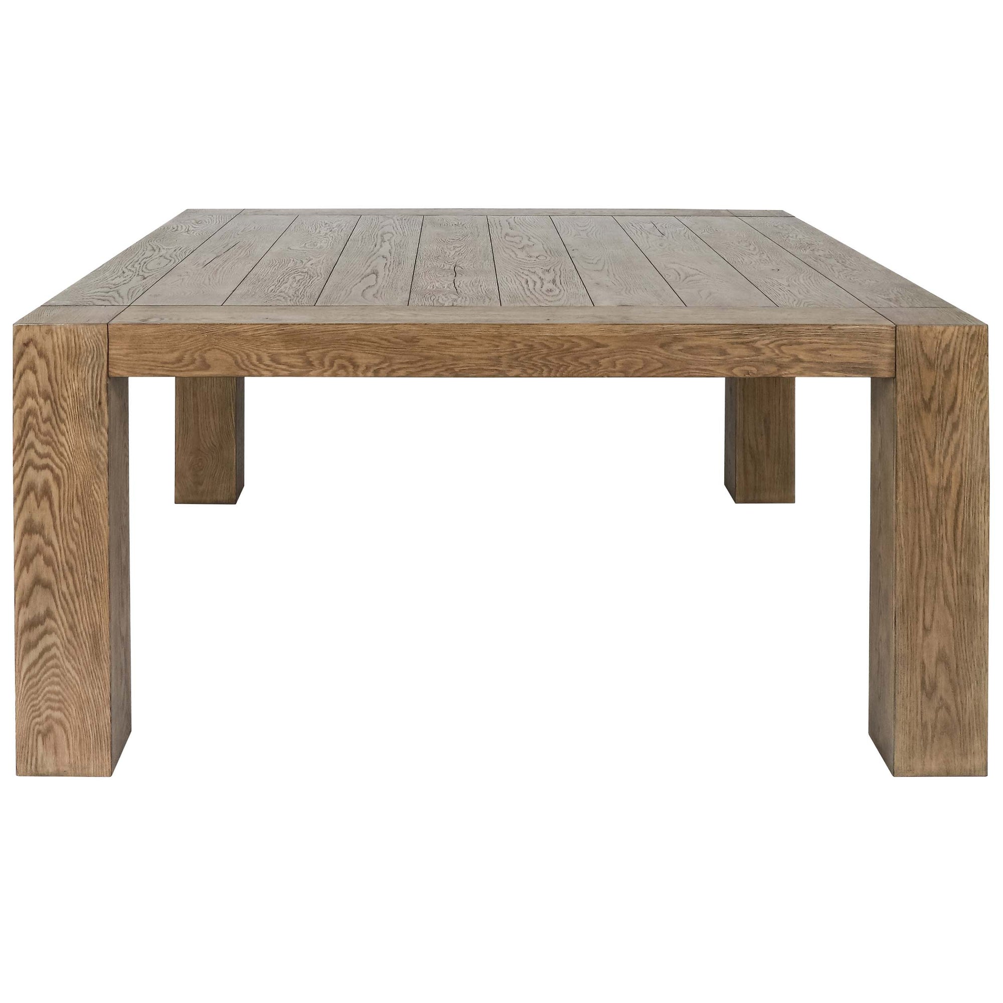 The Gilcrest Square Dining Table features solid reclaimed oak with hand-finished surfaces, butterfly joints, and natural distressing that highlight the wood’s unique character. Its modernist design with clean lines and square angles makes it a striking and functional centerpiece for dining spaces, combining durability with timeless style.