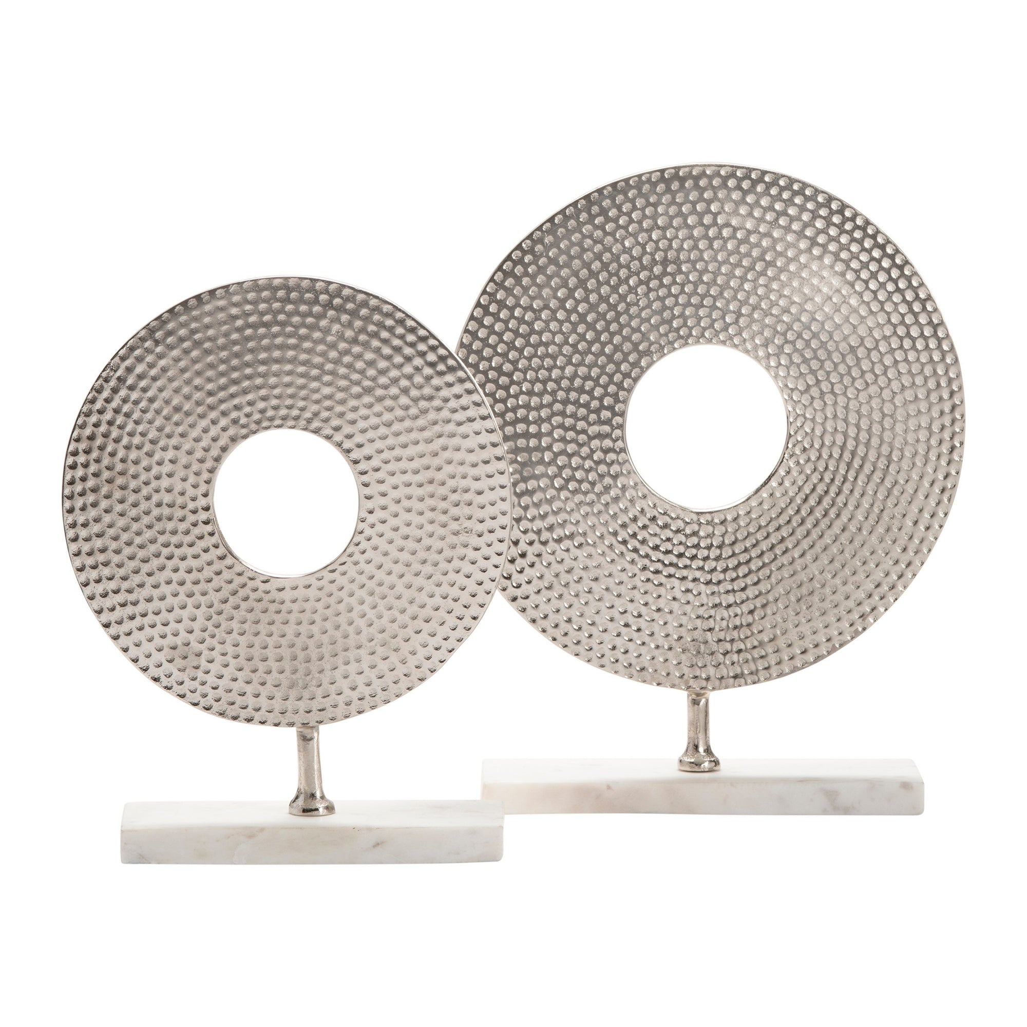 The Harris Sculpture is crafted from aluminum with a polished finish and sits atop a white marble base. Its open, hand-hammered disc design adds a modern touch to any room.