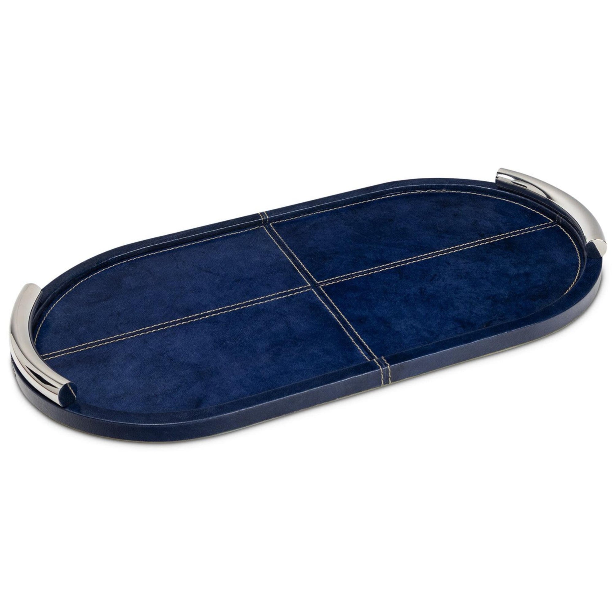 The Hayes Leather Oval Tray combines refined luxury with everyday functionality. Crafted from genuine blue leather and detailed with contrast stitching, it exudes timeless elegance, while plated metal handles add a polished touch. Perfect for serving cocktails, breakfast in bed, or displaying decorative accents, this versatile tray elevates any setting with sophistication and style.