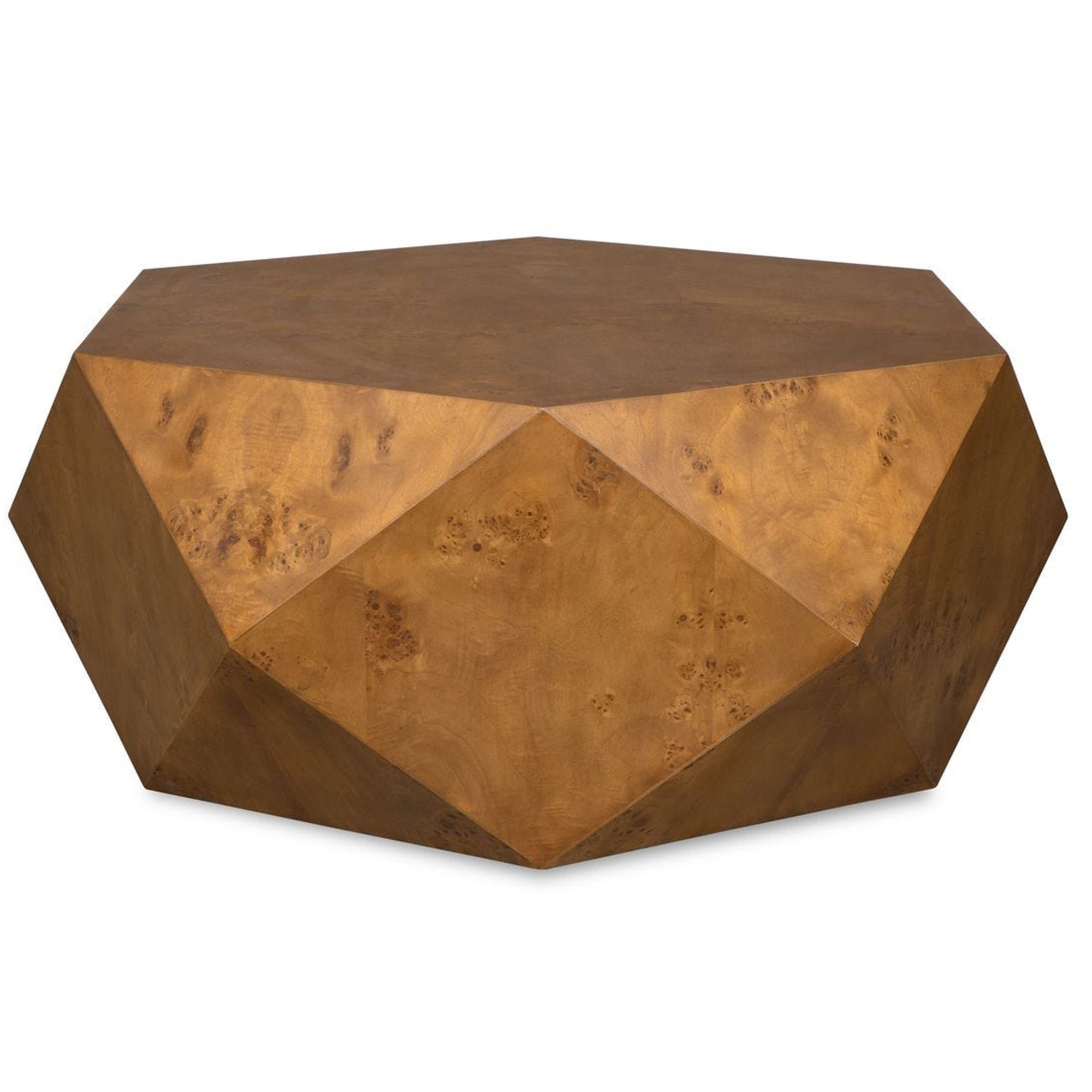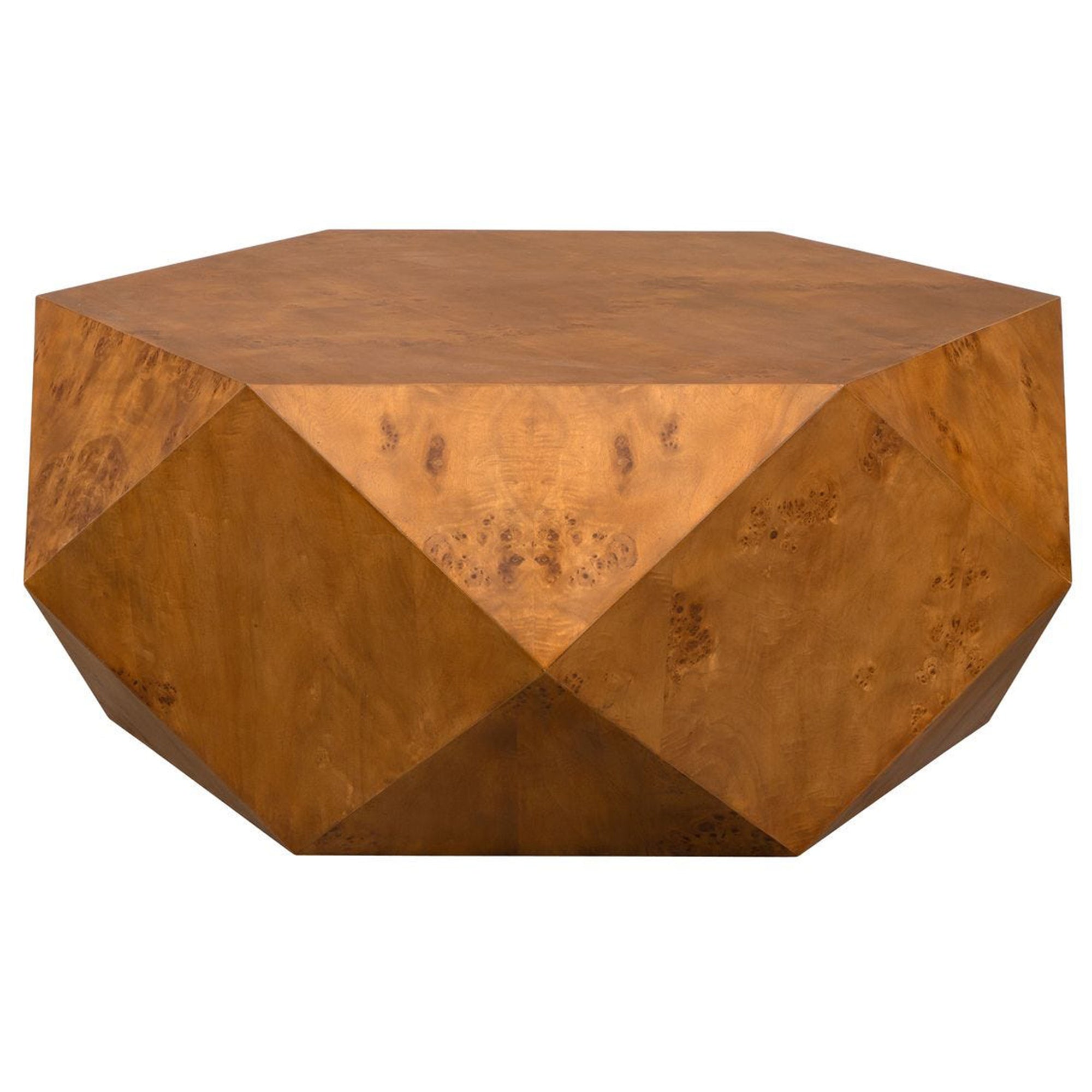 The Hughes Coffee Table features a solid multifaceted geometric silhouette that brings a striking architectural presence to any seating arrangement. It showcases a broad flat hexagonal top surface, providing a substantial and secure area for gathering or displaying accents. This upper section transitions seamlessly into angled diamond shaped side panels that taper inward toward the base. The continuous monolithic body creates a grounded footprint while maintaining a highly sculptured profile. This space saving low profile design effortlessly merges bold structural forms with practical utility to anchor a modern interior.