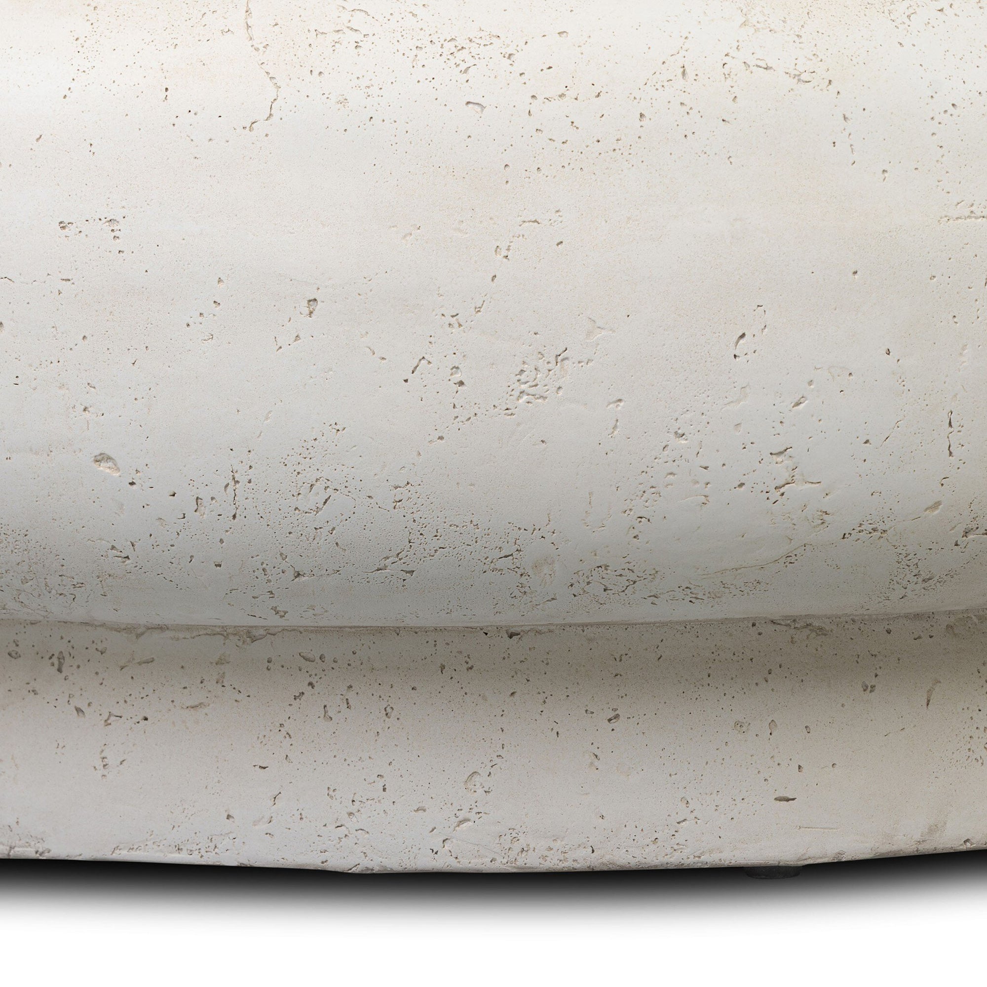 The Imogene Round Outdoor Coffee Table features a simple cylinder shape with a plinth base, designed for easy styling in any space. This substantial piece is finished in aged white concrete with a parchment-like feel. It offers a clean, contemporary surface for your outdoor living area. Cover or store indoors during inclement weather and when not in use.