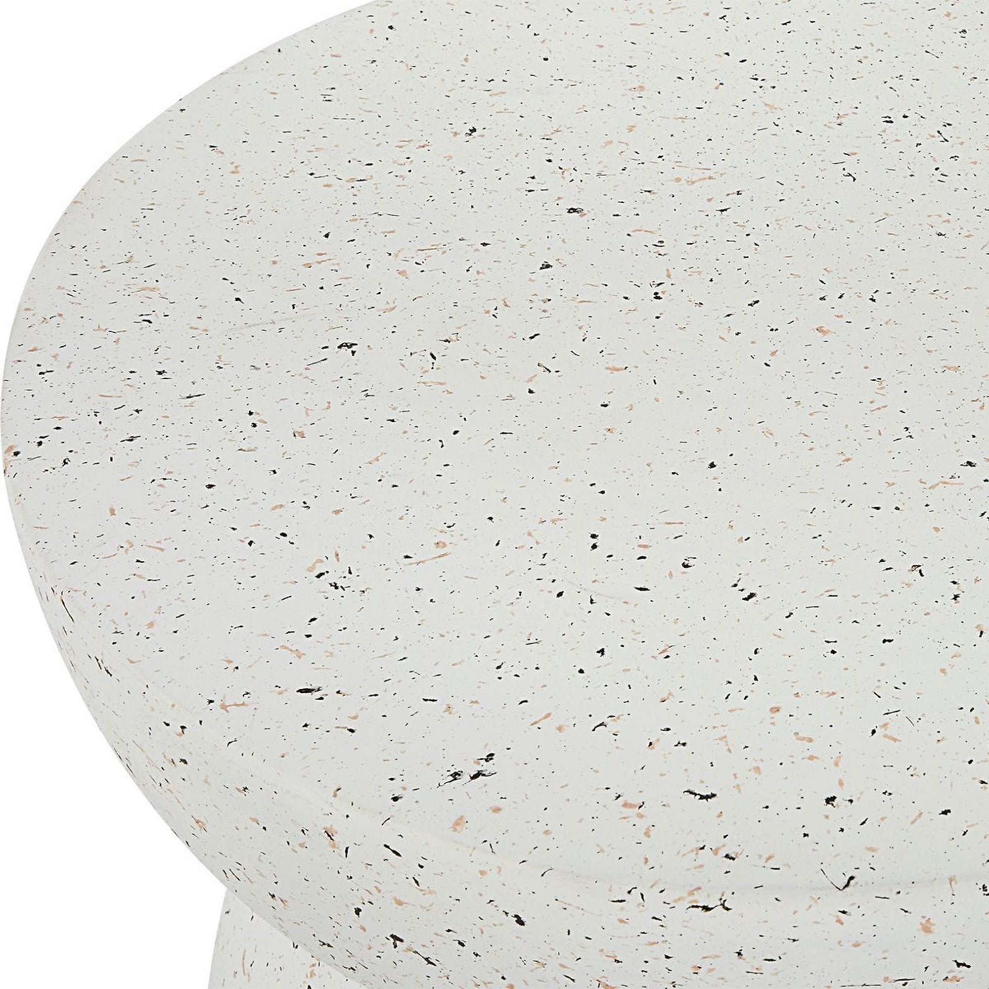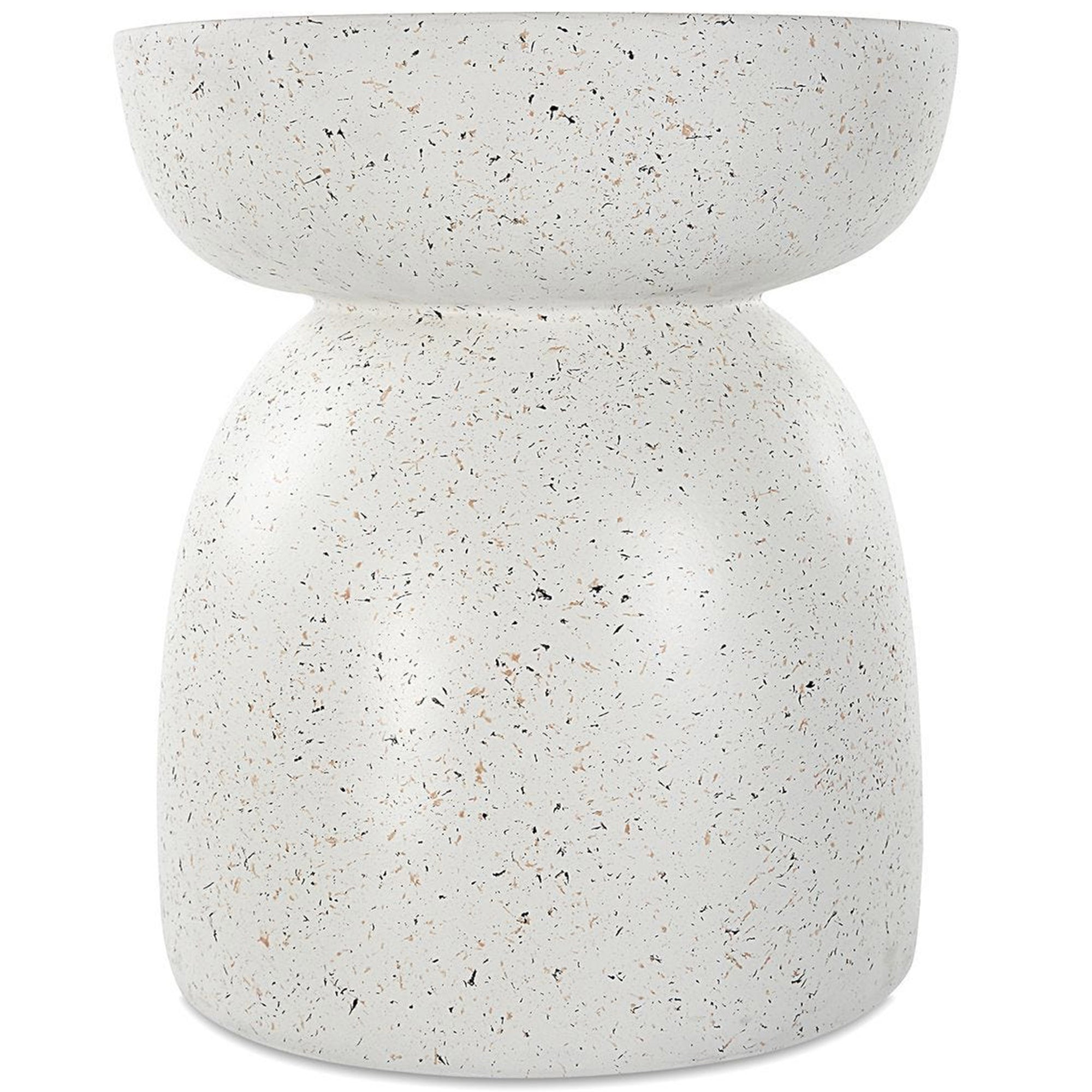The Inhale Accent Table is a refreshing piece formed from cast resin with a matte white finish. This sculptural table features subtle hints of earthy terrazzo specs throughout its surface, adding delicate texture and visual depth. Its unique hourglass-inspired silhouette consists of a wide, slightly tapered top balanced over a larger, rounded dome-like base, creating a contemporary and organic focal point for modern living spaces.