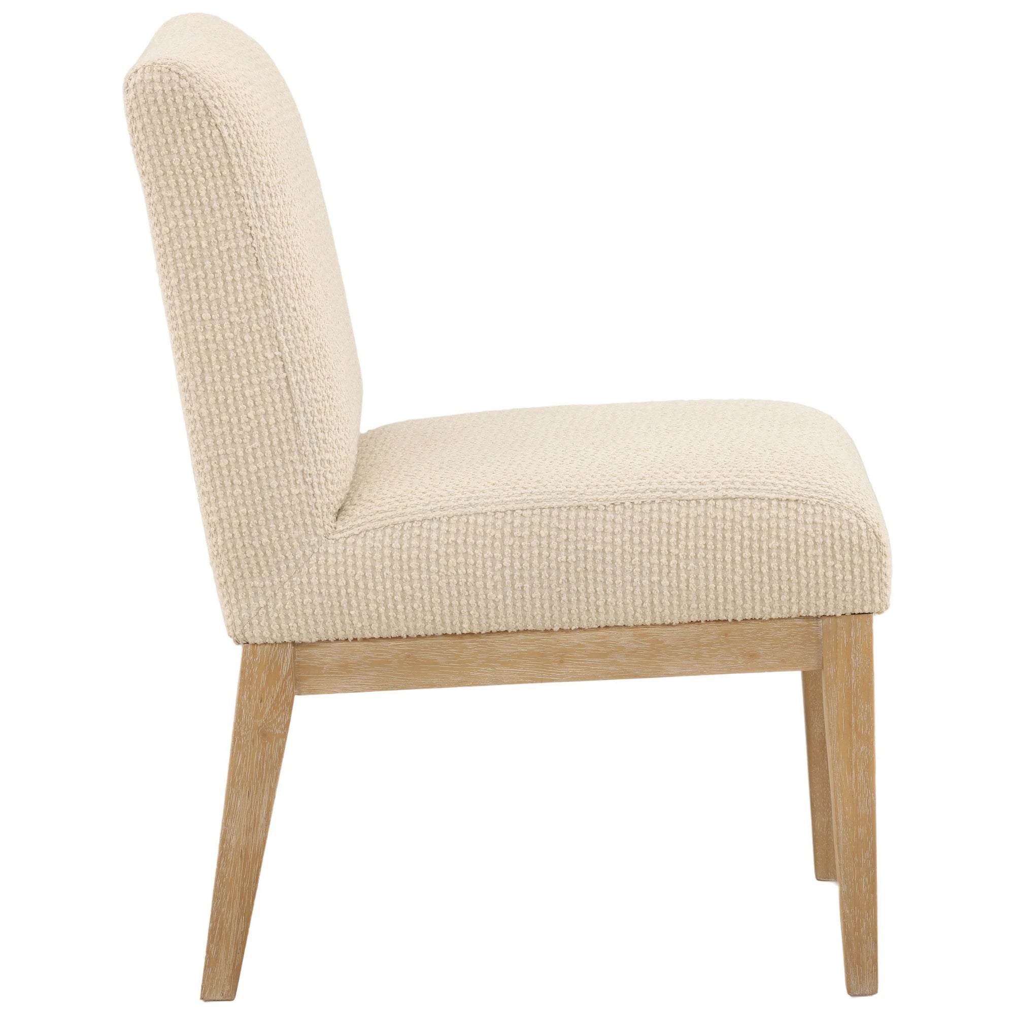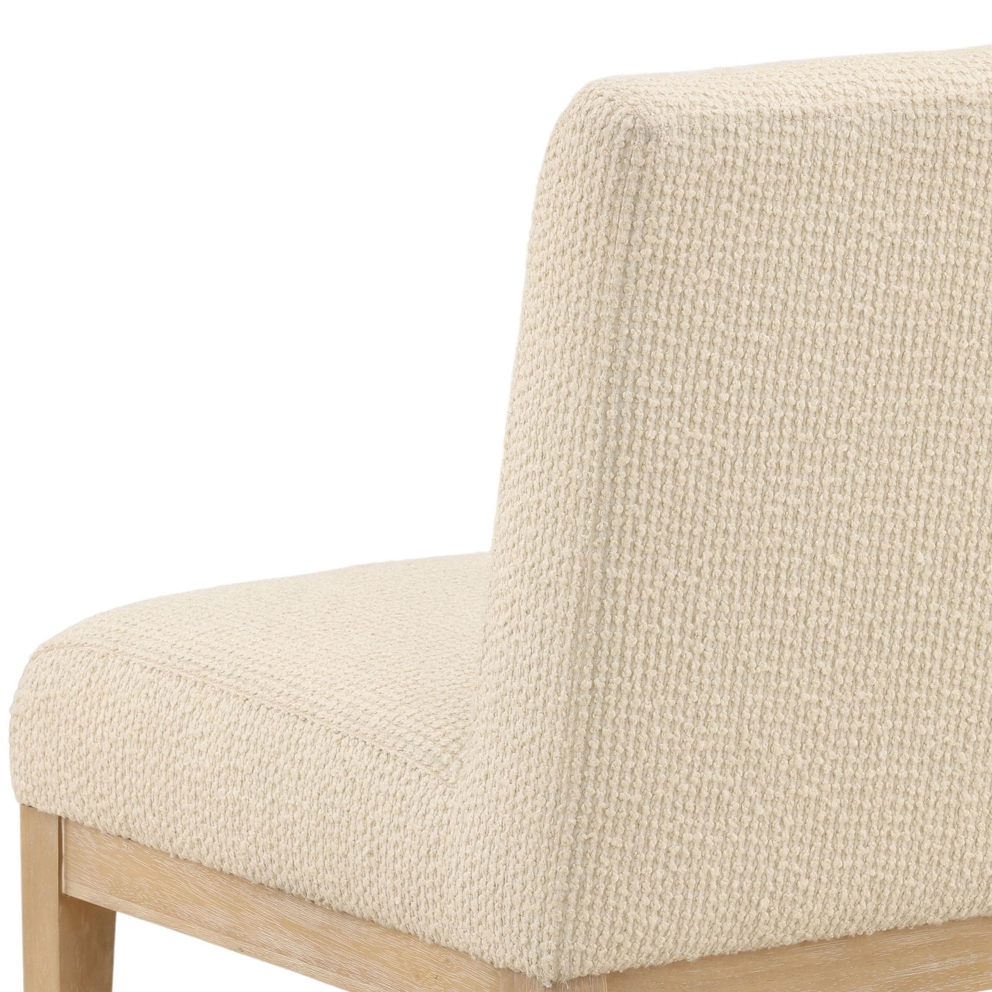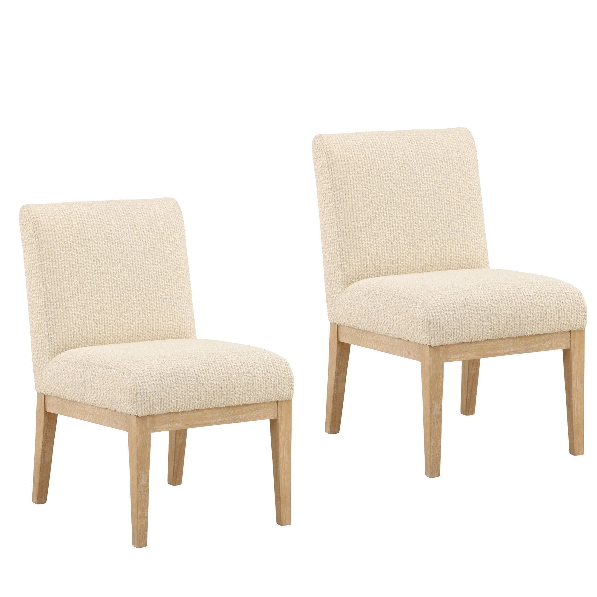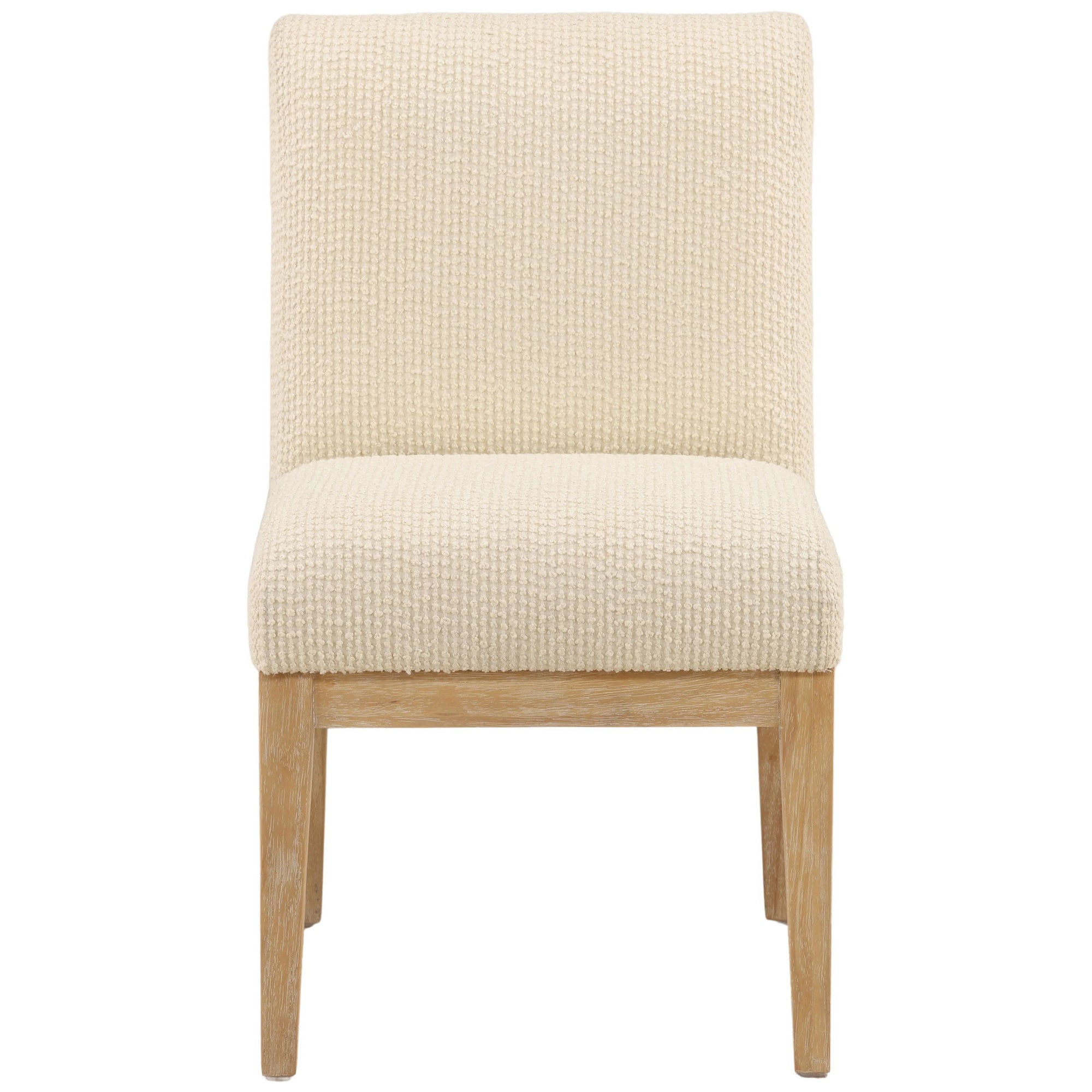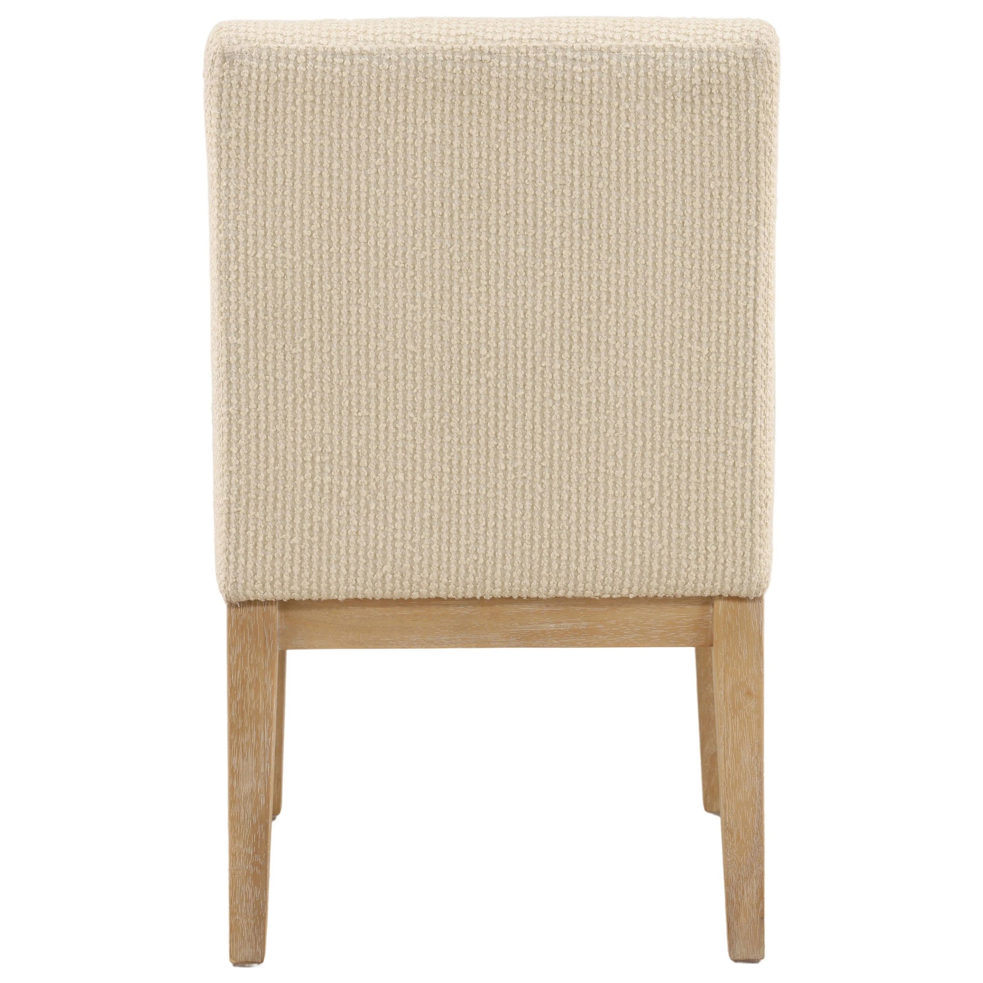 The Jalen Dining Chair brings refined simplicity to any dining space. Upholstered in soft ribbed boucle fabric with a light natural rubber wood frame, these chairs balance comfort and elegance with their textured seat and minimalist silhouette.
