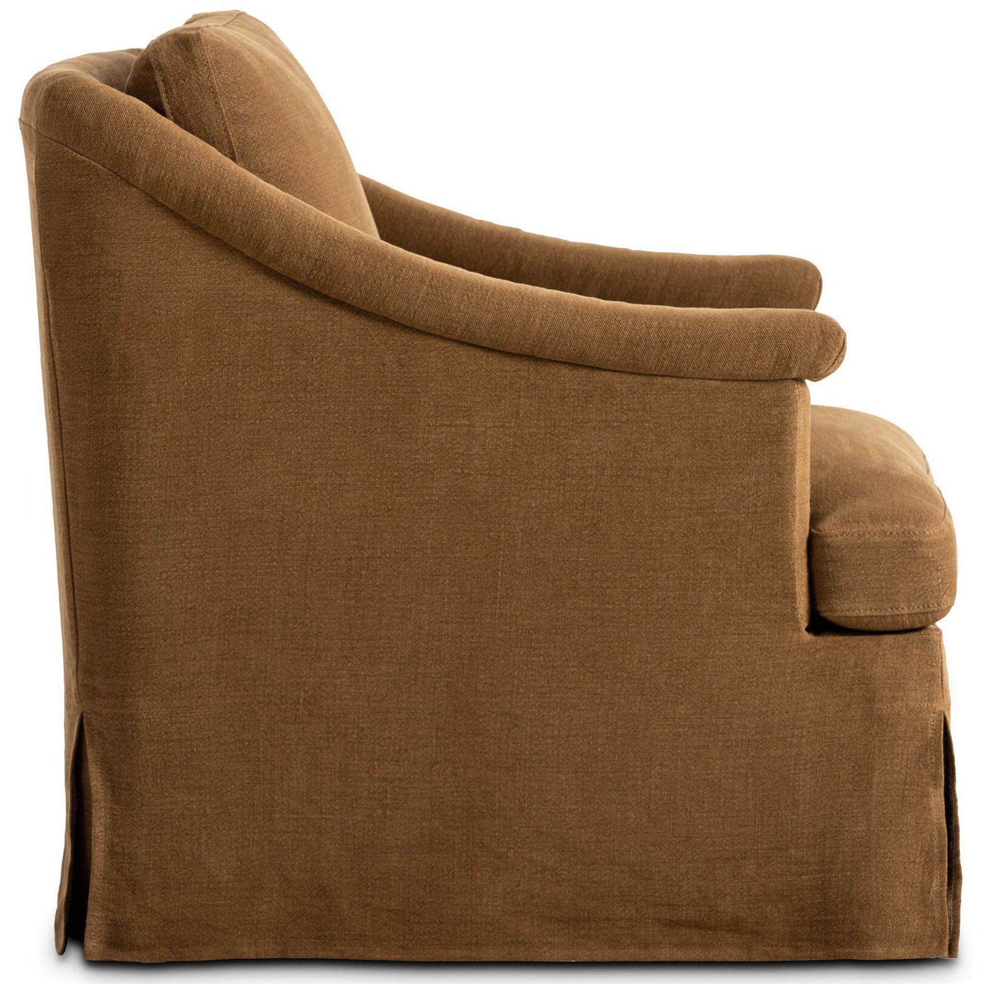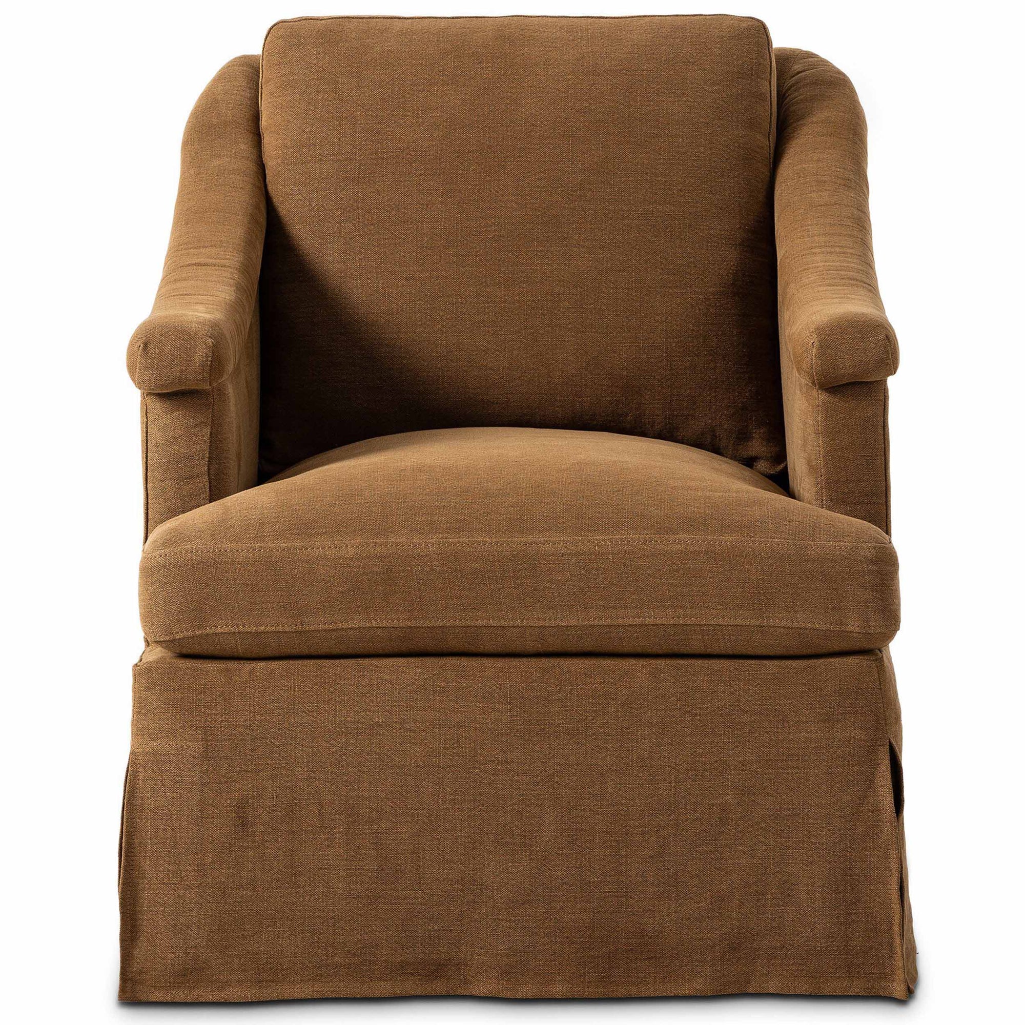 The Joplin Swivel Chair captures both traditional style and fluid motion. This 360-degree swivel chair features a removable slipcover with deep pleating for a casual yet tailored look. Sloping arms with ample padding and feather-filled cushions add extra comfort. The slipcover attaches securely with Velcro for a precise fit. This is a design collaboration by Amber Lewis and Four Hands.