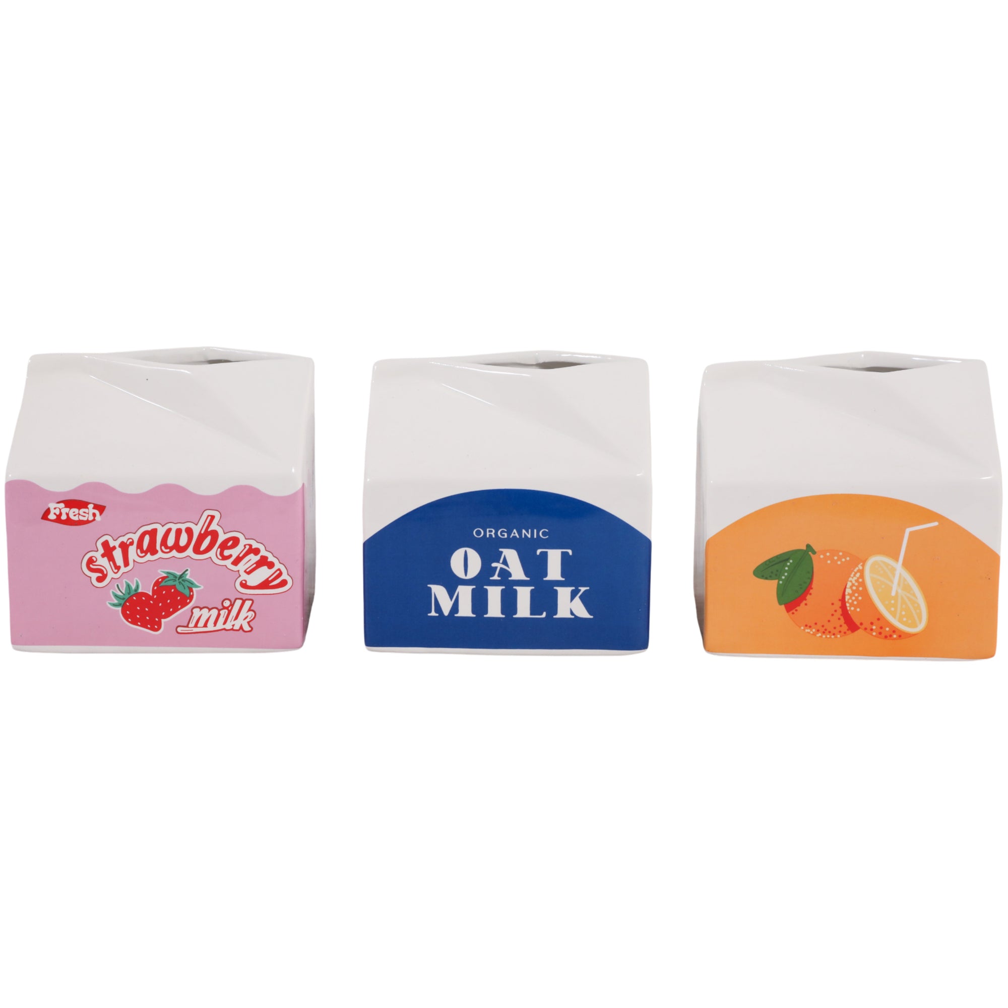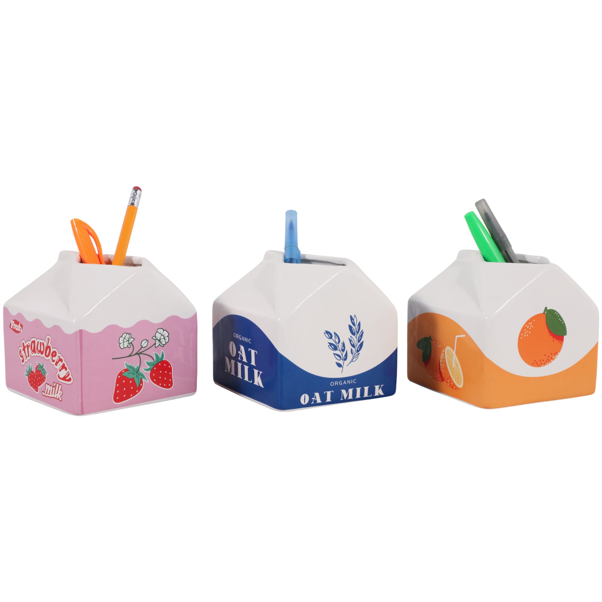 The Juice & Milk Carton Pencil Cups add a quirky and functional touch to any workspace. This decorative set features three pieces perfect for organizing pens, pencils, and office supplies while introducing a playful aesthetic. Their unique form factor creates a memorable accent, bringing a lighthearted and curated layer of style to a desk or shelf.