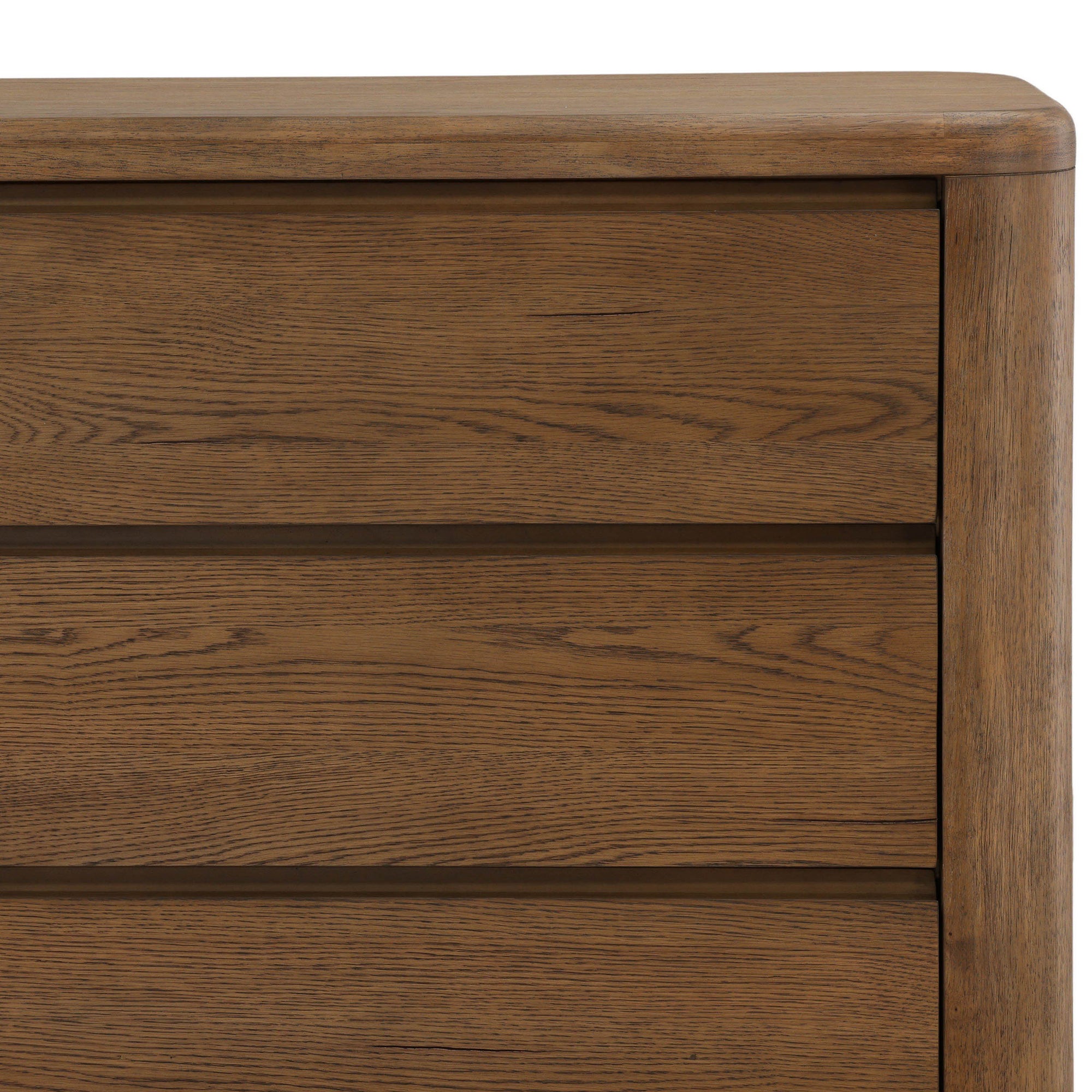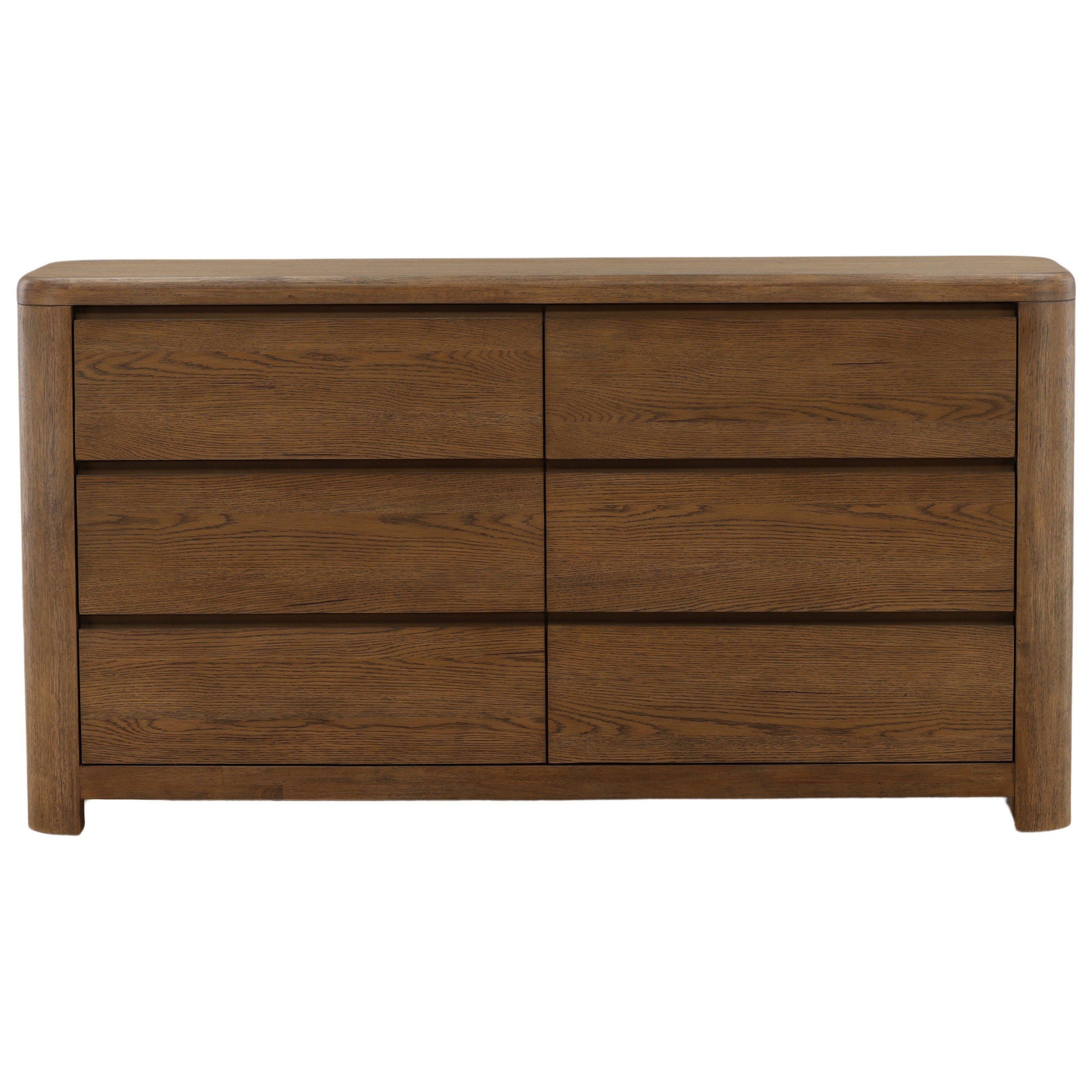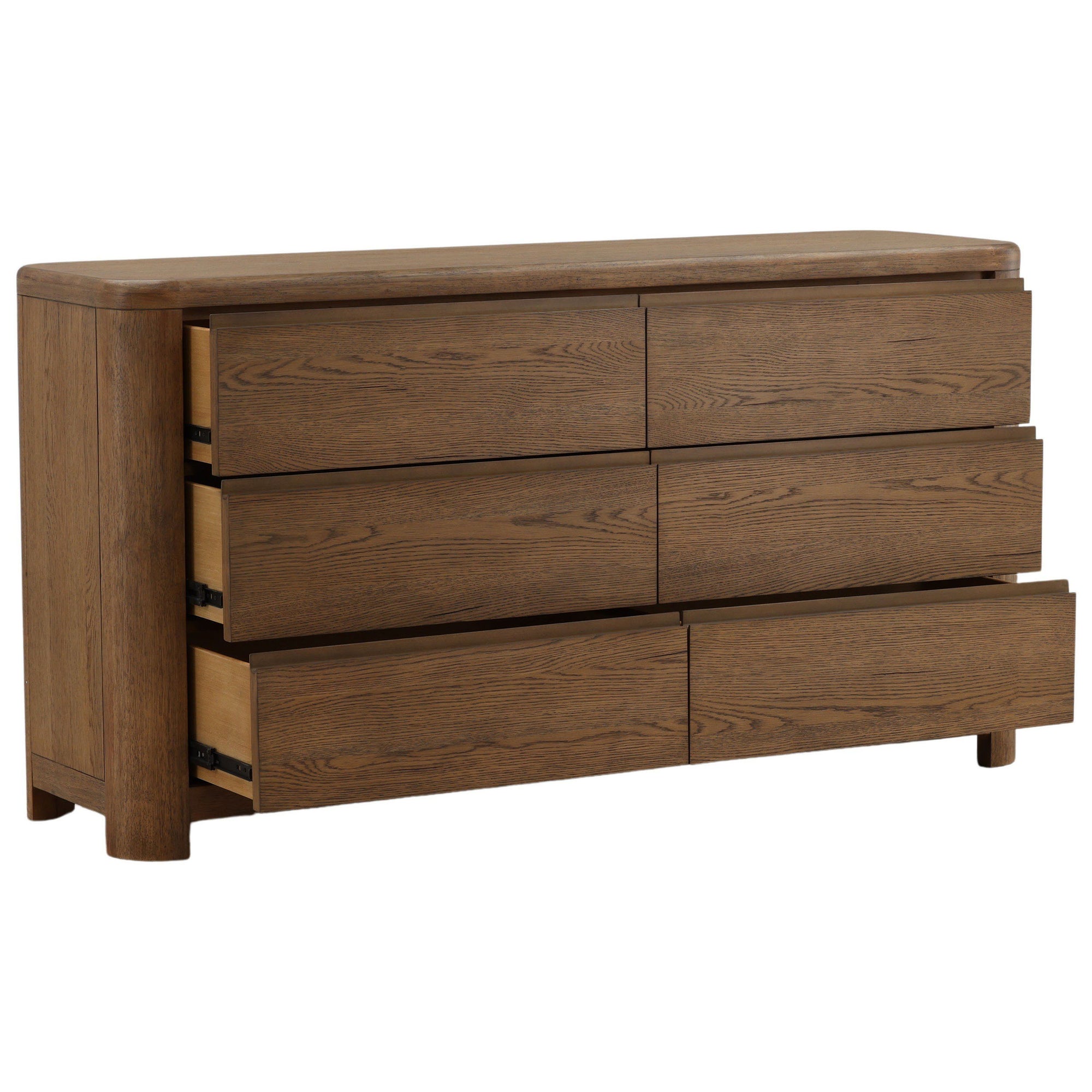 The Julis Dresser is a wide, six-drawer chest defined by its smooth, rounded corners and modern, elevated profile. Featuring six generously sized drawers, the dresser offers substantial bedroom storage. The entire piece is supported by a subtle plinth base with rounded edges, creating a clean, integrated look. The Julis Dresser combines ample capacity with a sophisticated, contemporary design that makes it a refined focal point in any bedroom.