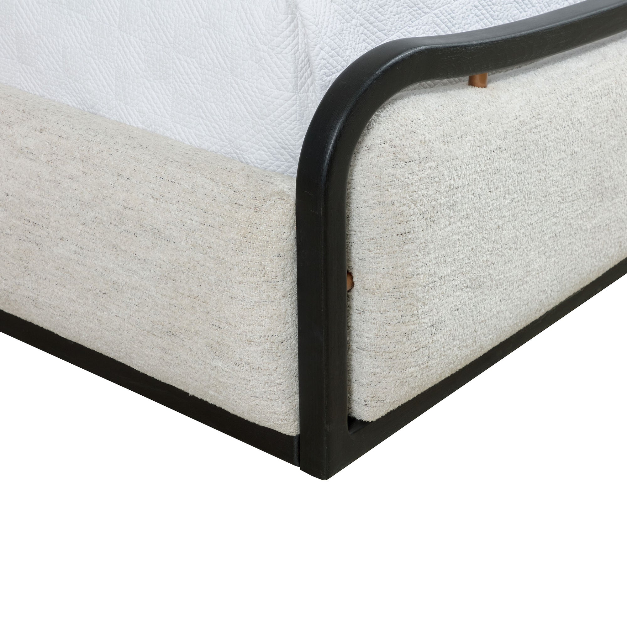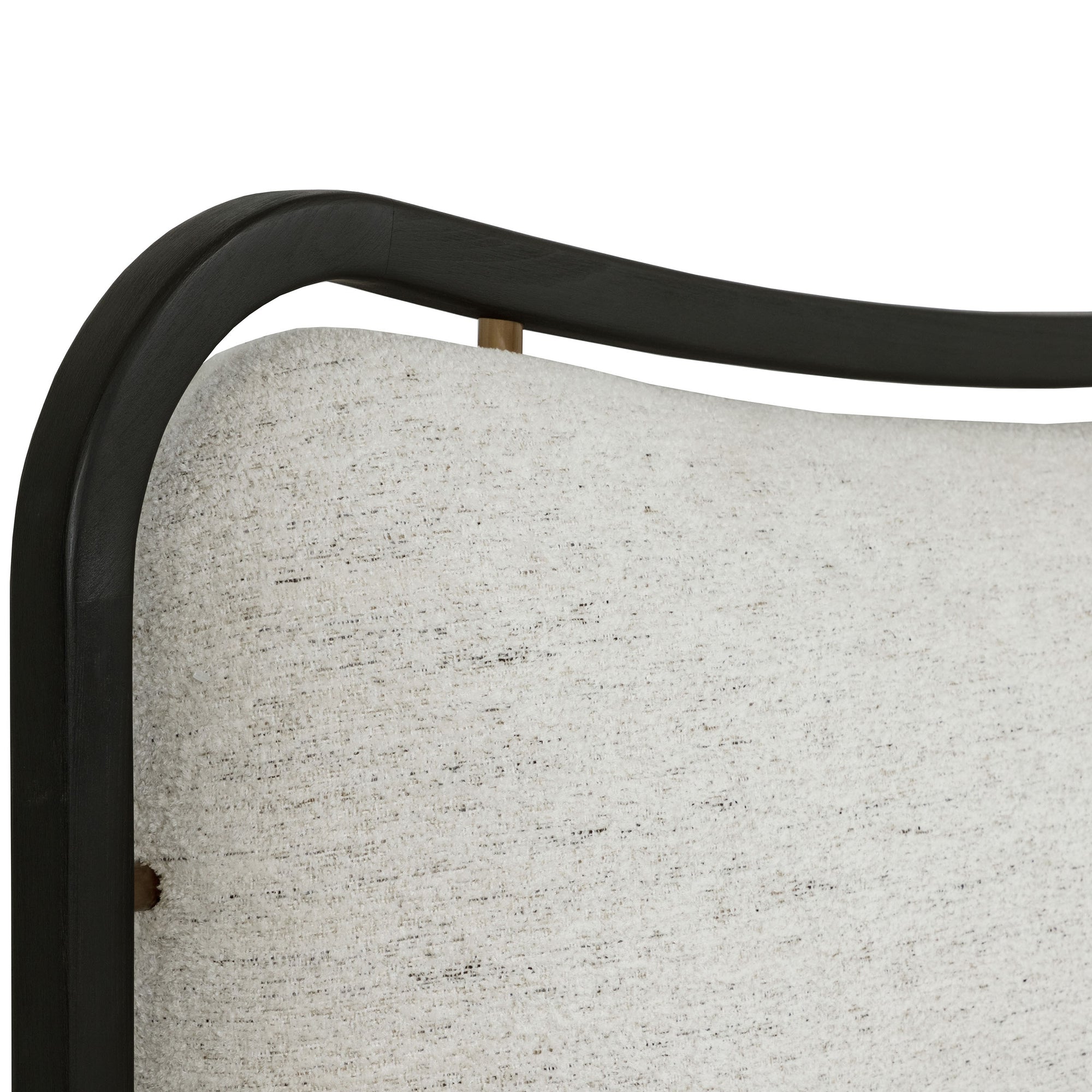 The Junia Bed King features a sculptural design with a concave headboard and footboard. Upholstered in textured boucle, the frame is accented with curved beech wood trim and brushed gold metal connectors, creating a modern statement piece. Its included slats eliminate the need for a box spring, offering both style and functionality for residential or hospitality spaces.