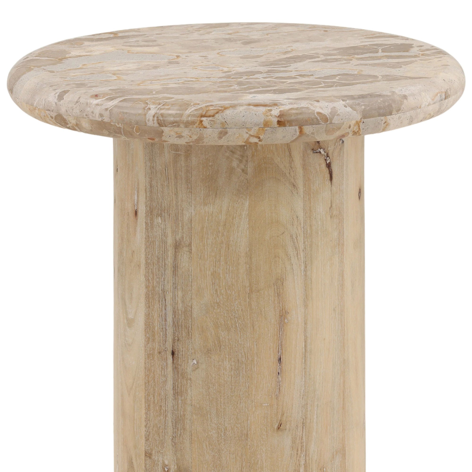 The Kiyomi Side Table is a compact, sculptural piece that introduces a chic contrast of natural materials to any seating area. Featuring a sturdy cylindrical base and a circular surface, this table offers a grounded, organic feel. Its small footprint and robust construction make it an excellent and stylish accent for holding beverages, books, or a small lamp.